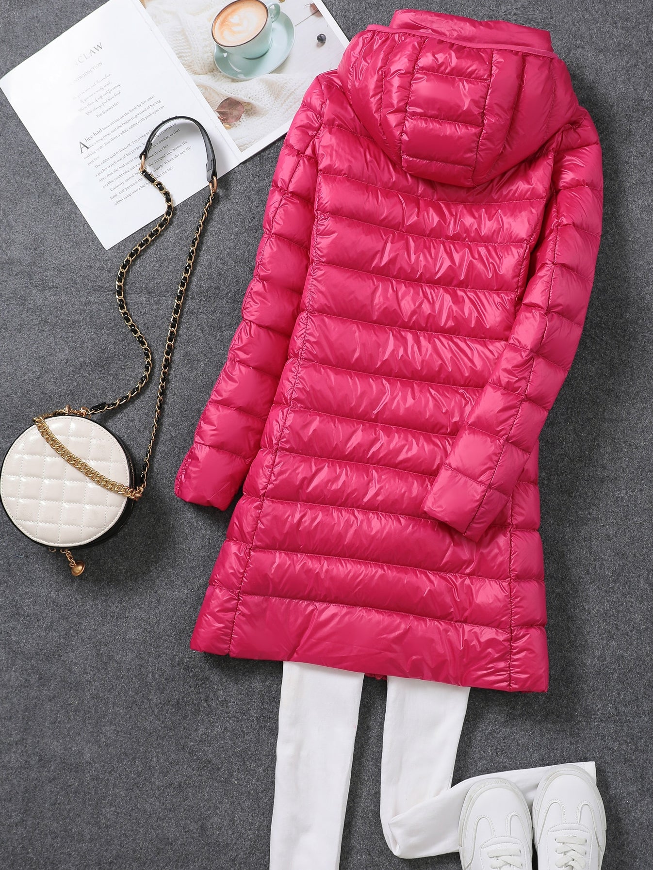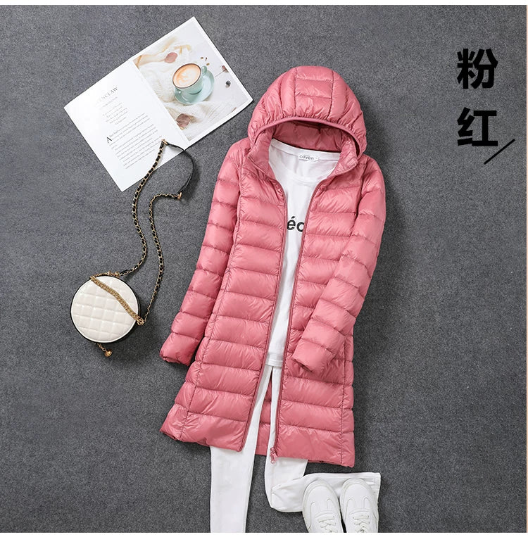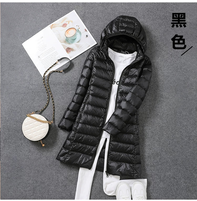 2024 Autumn/Winter New Women's Lightweight Jacket, Mid-Length, White Duck Down, Korean Style, Slimming and Comfortable, Detachable Hood