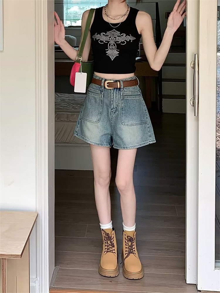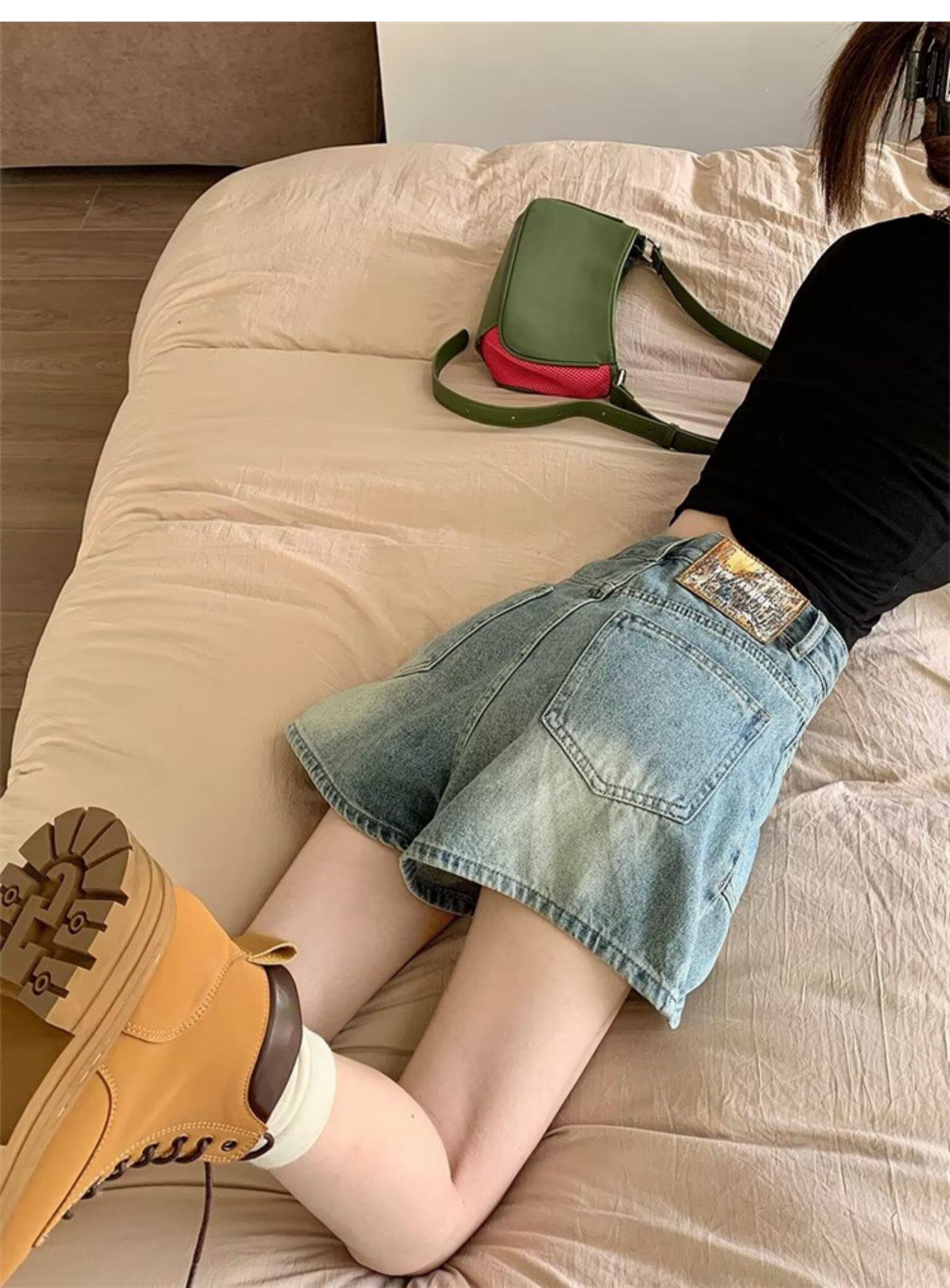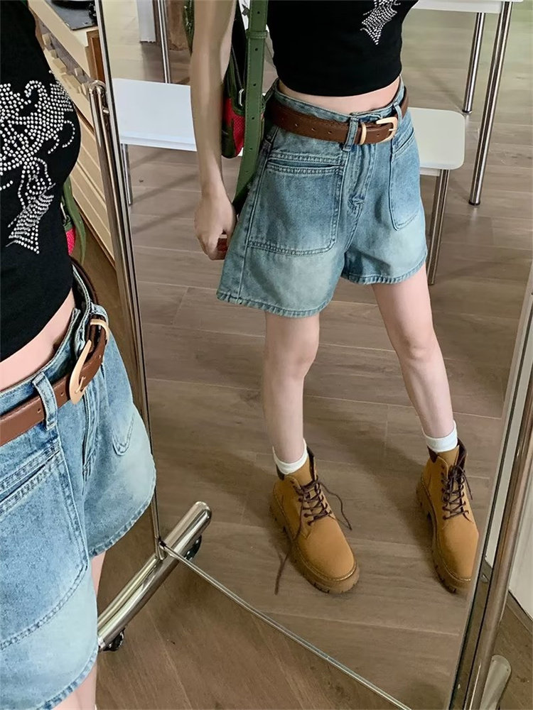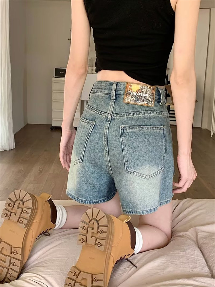 2026-cı il yayında qadınlar üçün yeni retro yüksək belli denim şortlar, arıqladıcı, geniş ayaqlı A-xəttli isti şalvar