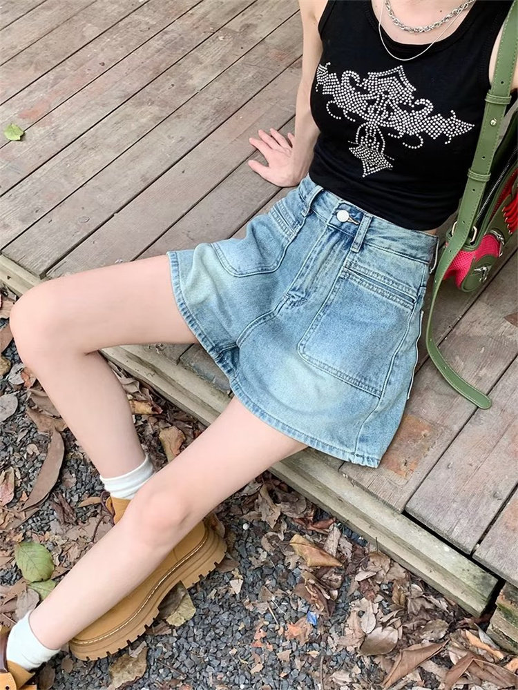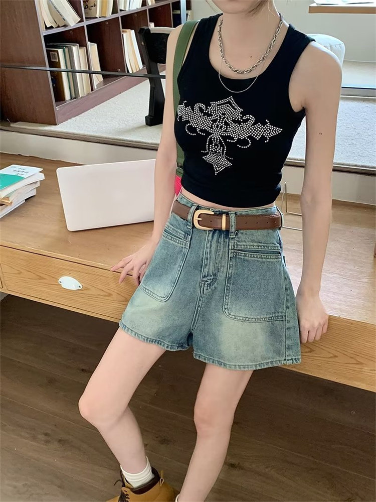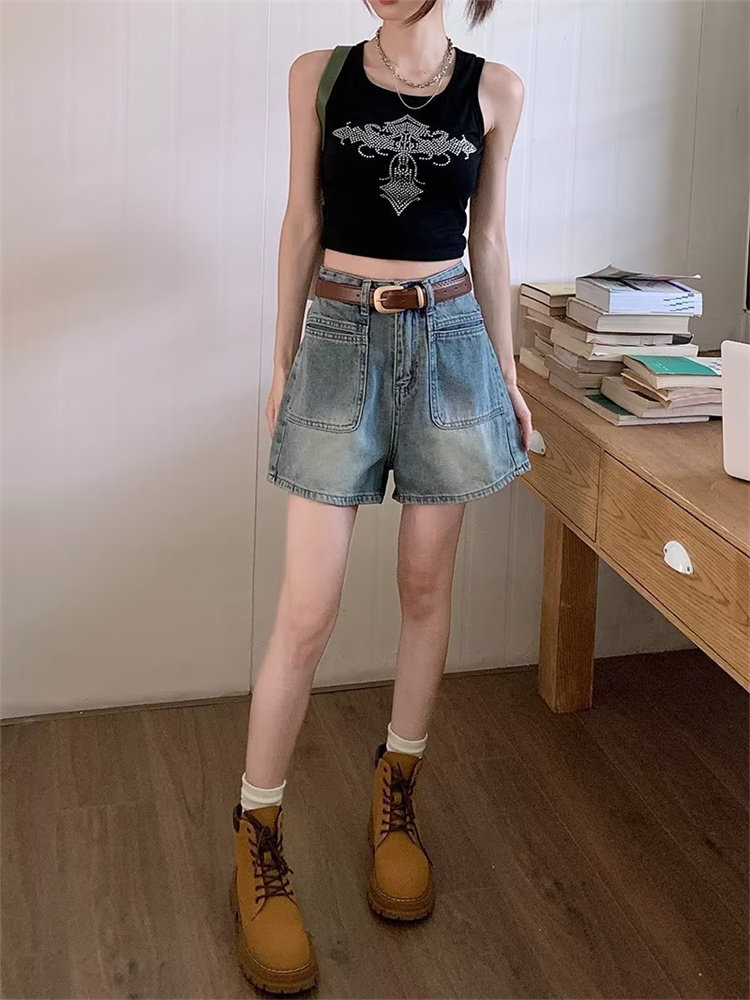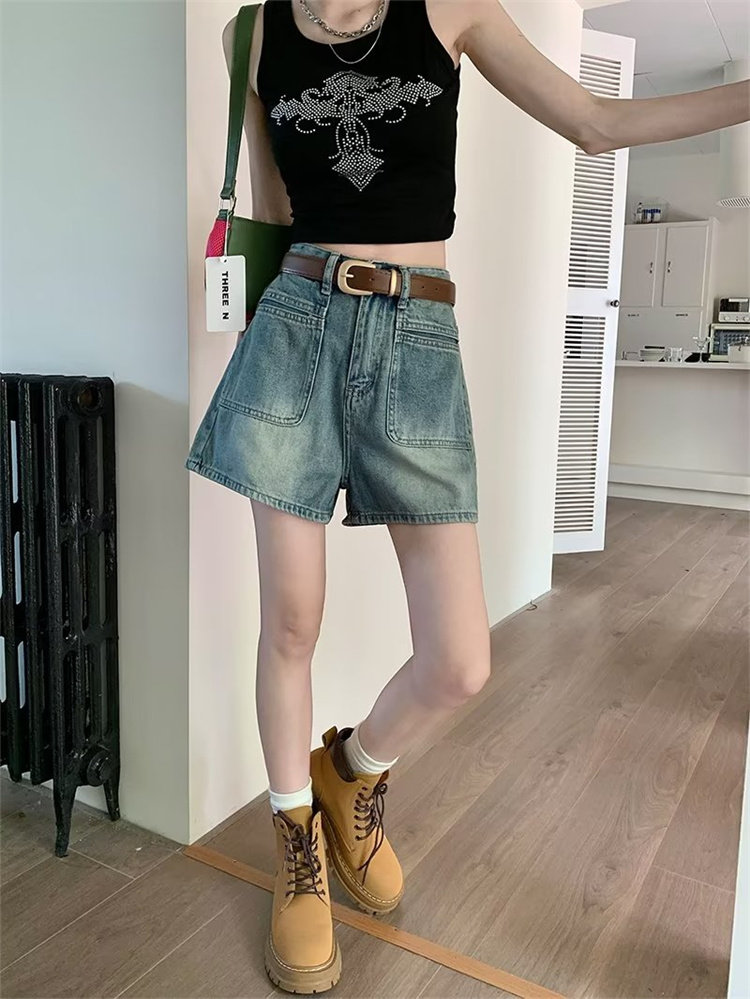 2026-cı il yayında qadınlar üçün yeni retro yüksək belli denim şortlar, arıqladıcı, geniş ayaqlı A-xəttli isti şalvar