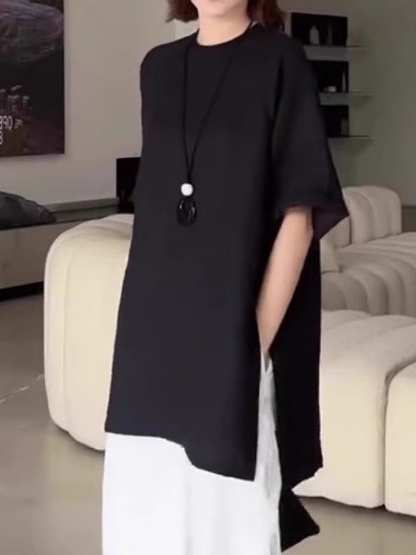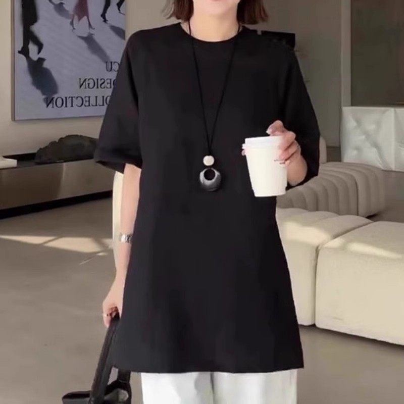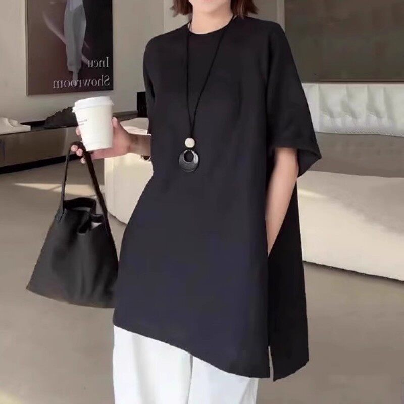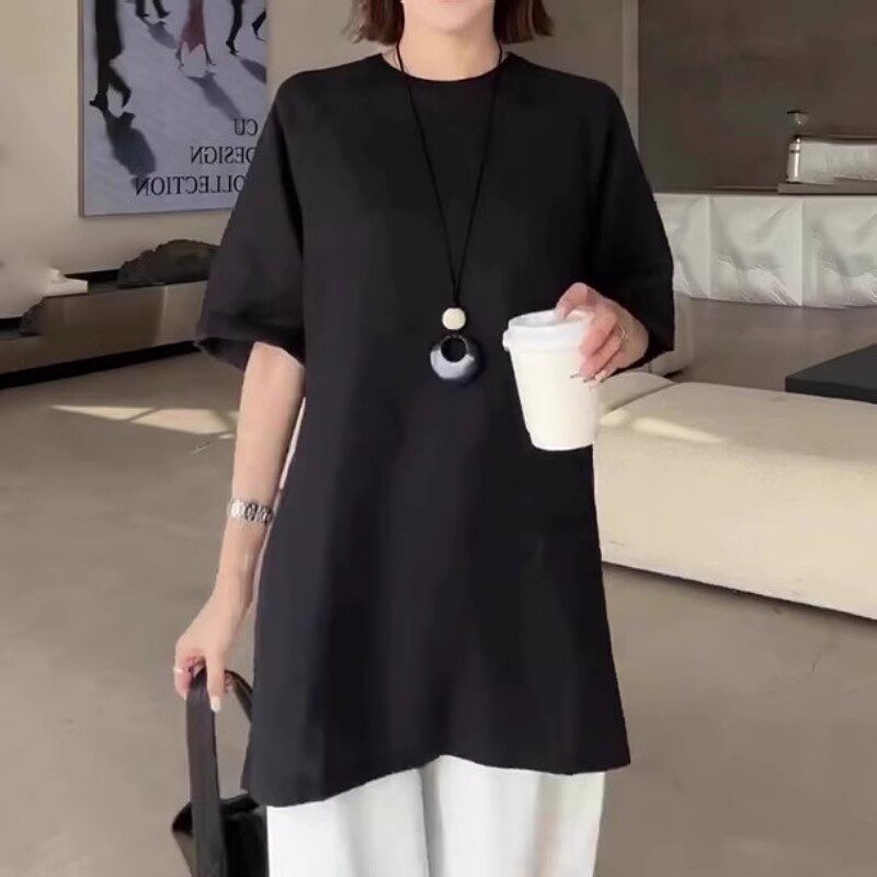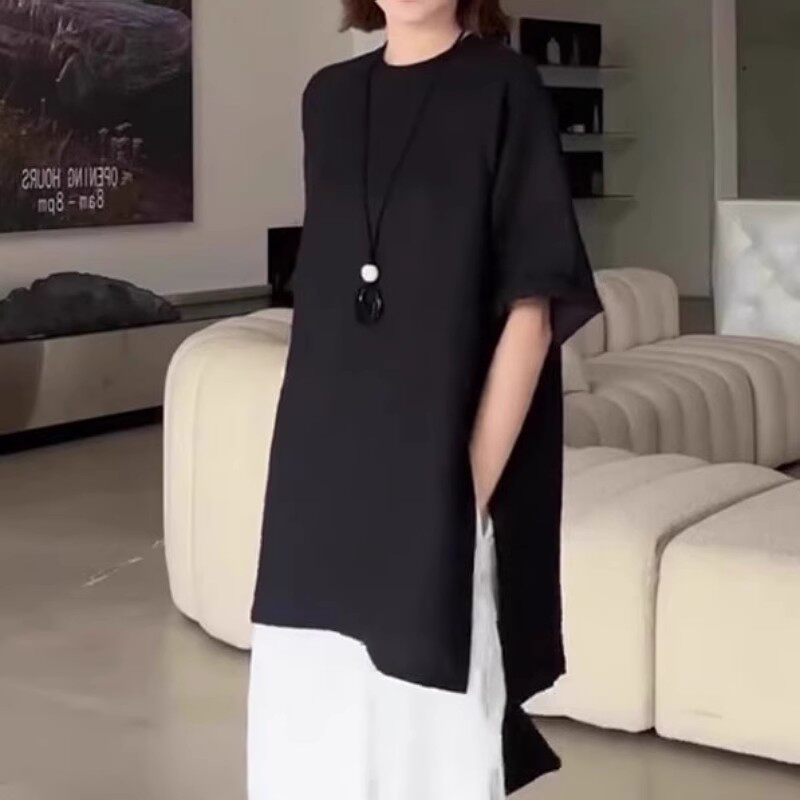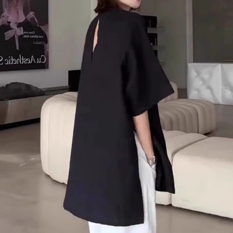 2026-cı ilin yayı üçün mükəmməl olan, geniş qara qısaqollu qadınlar üçün futbolka, böyük ölçüdə, əyri bədən quruluşuna uyğun və qarın nahiyəsini gizlədir.