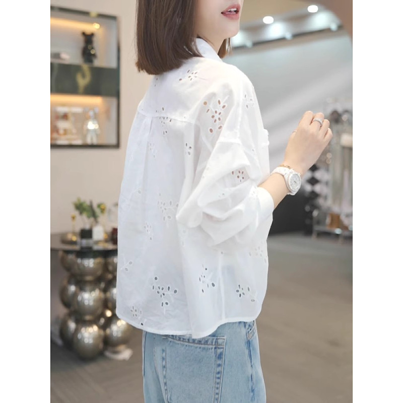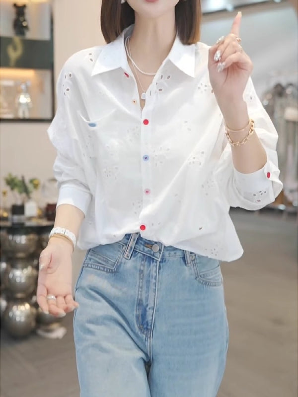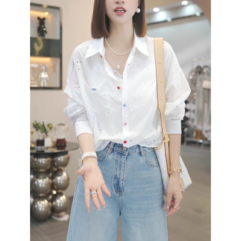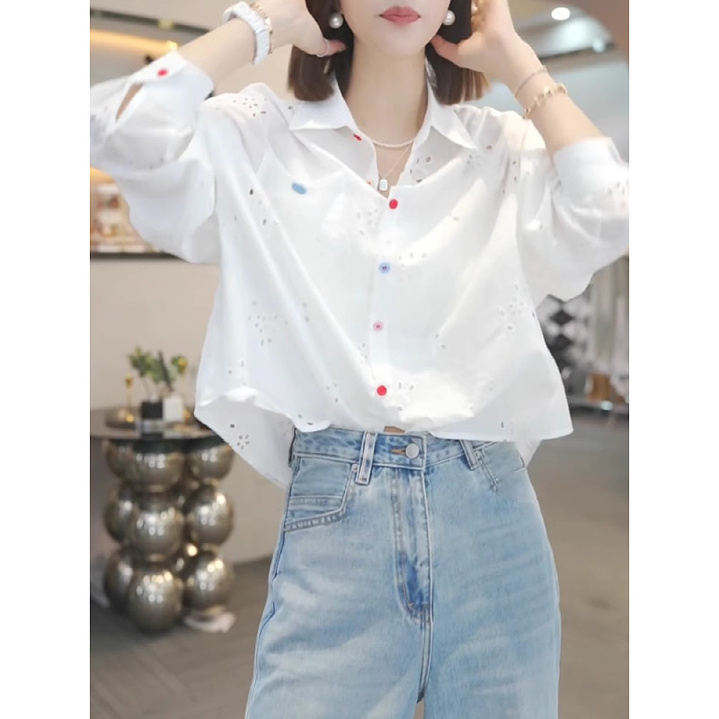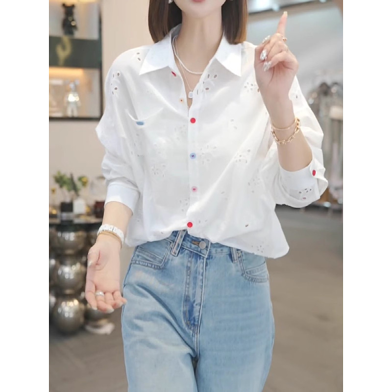 2026-cı ilin yaz/yay mövsümü üçün ideal olan, rəngarəng düymələri olan, böyük ölçülü qadın dəbli yaxalıqlı köynək. Böyük ölçülü qadınlar üçün yüngül, möhkəm tikmə ilə bəzədilmiş uzunqol köynək.