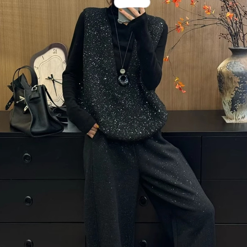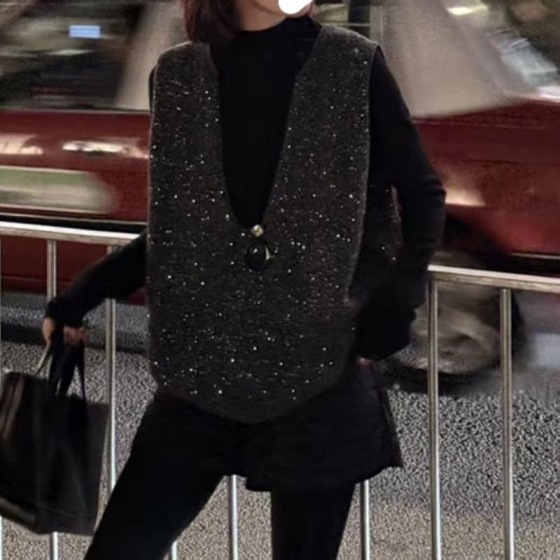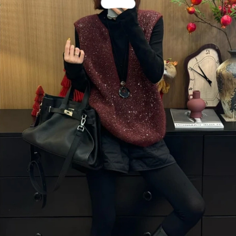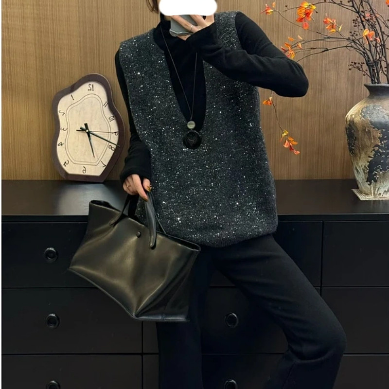 2026 Yaz, Böyük Ölçülü, İsti, Ağır Qolsuz, Əyri Bədənli Qadınlar üçün İncə Payetli və V-yaxalı Dizaynlı Jilet