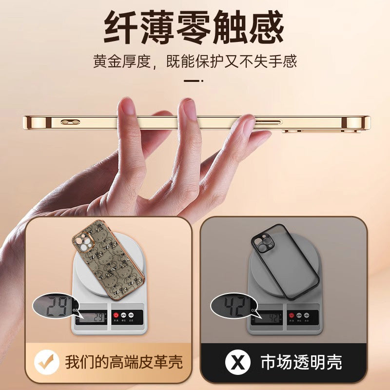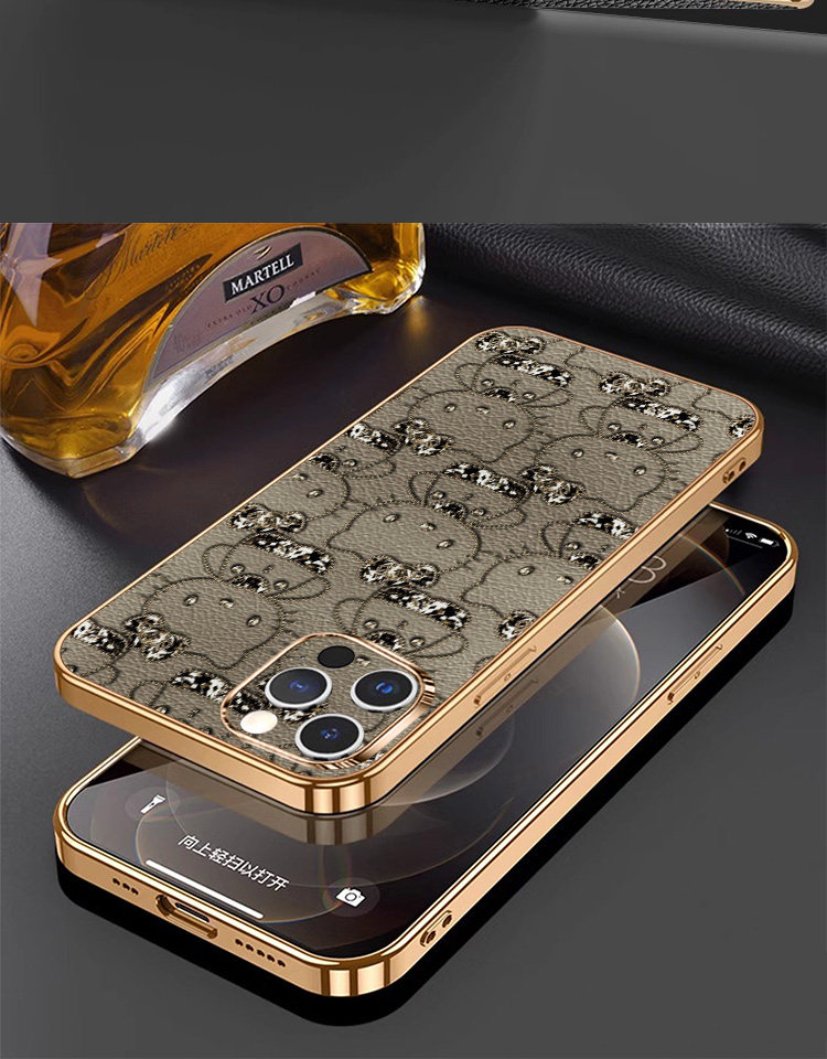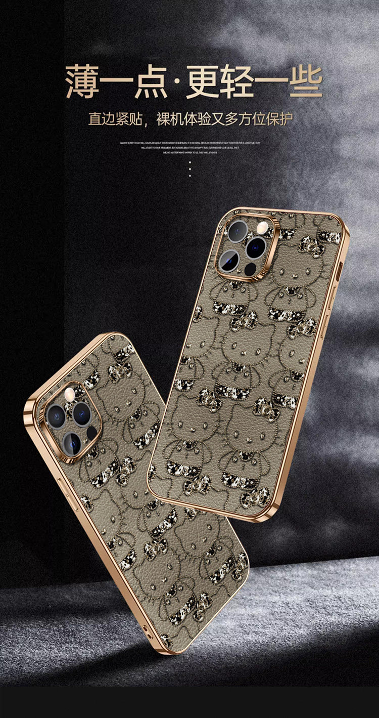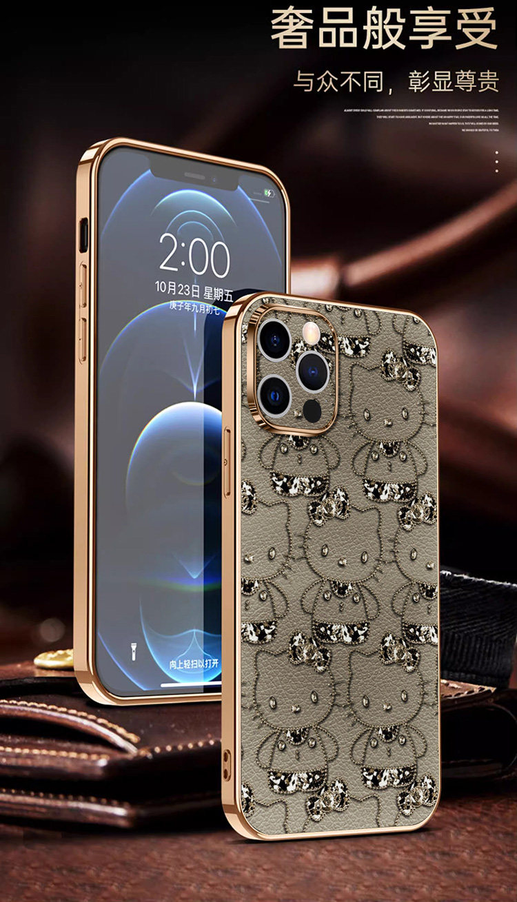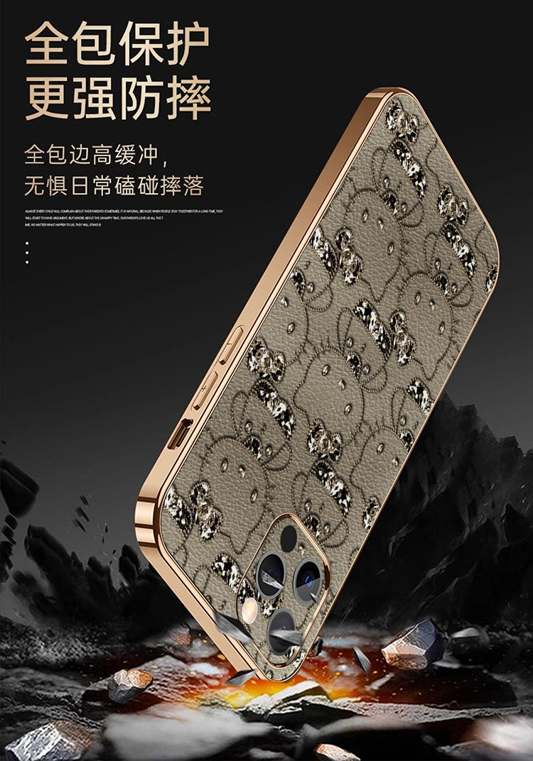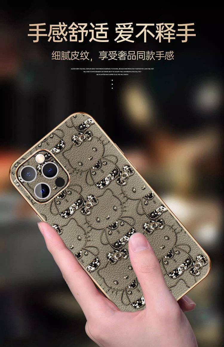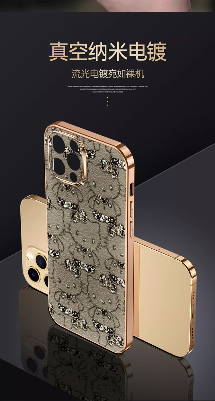 Compatible with Apple iPhone 15 Pro Max, iPhone 16/17/12/13/14, cute Hello Kitty leather case with electroplating, high-end full-coverage premium feel, luxury gold-plated protective case for iPhone 16 Plus.