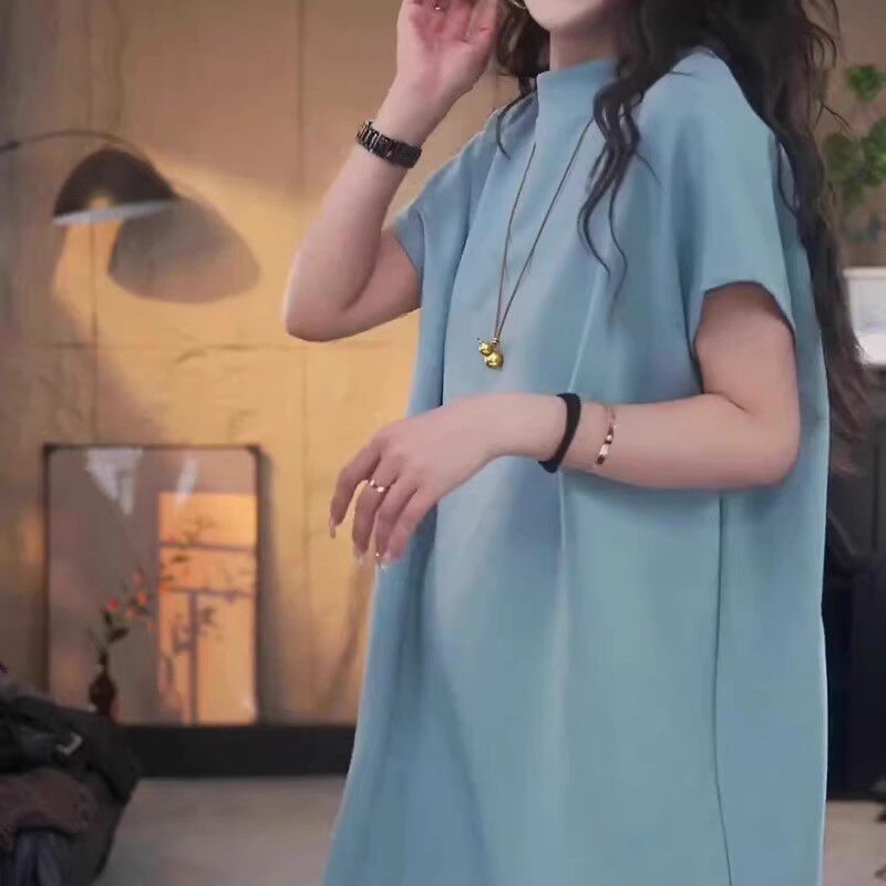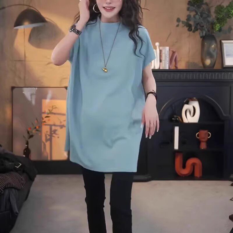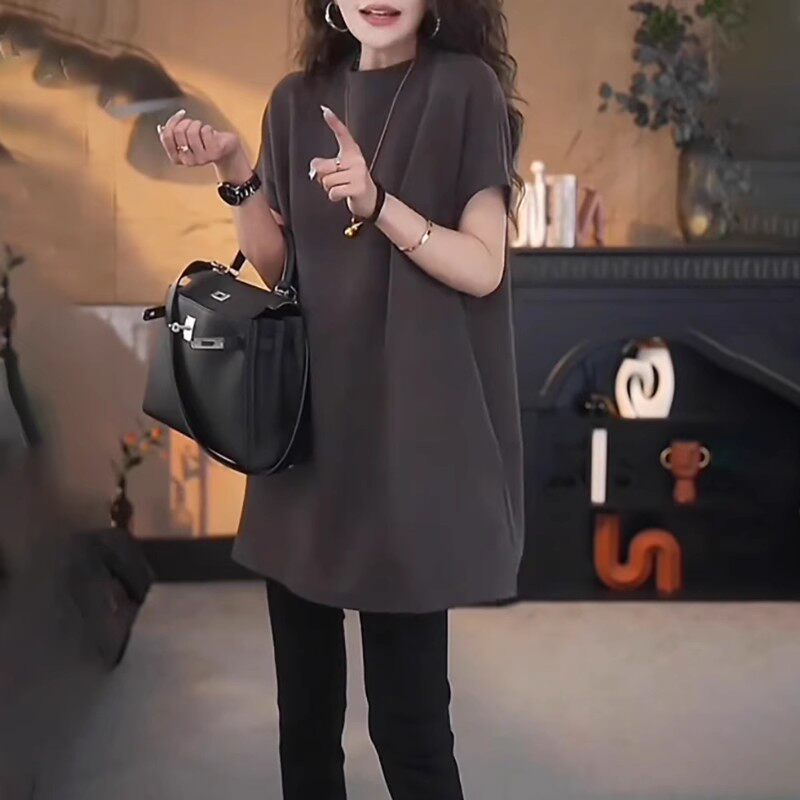 Avropa üslubunda böyük ölçülü qısaqol köynək, böyük ölçülü qadın geyimləri, 2026-cı il yayı, boş forma, orta uzunluqda, kök qızlar üçün yarıqlı top, qarnını gizlədir.