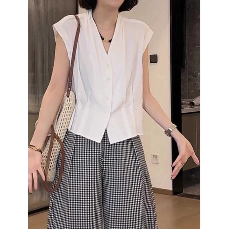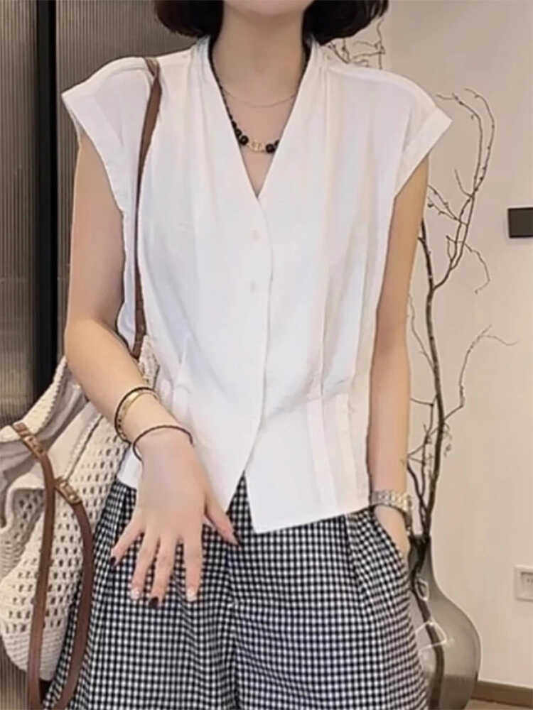 Avropa üslubunda qara V-yaxalı qadınlar üçün futbolka, yeni yay üslubunda, böyük ölçüdə, geniş formada, dəbli köynək, yüksək səviyyəli dizayner qolsuz top.