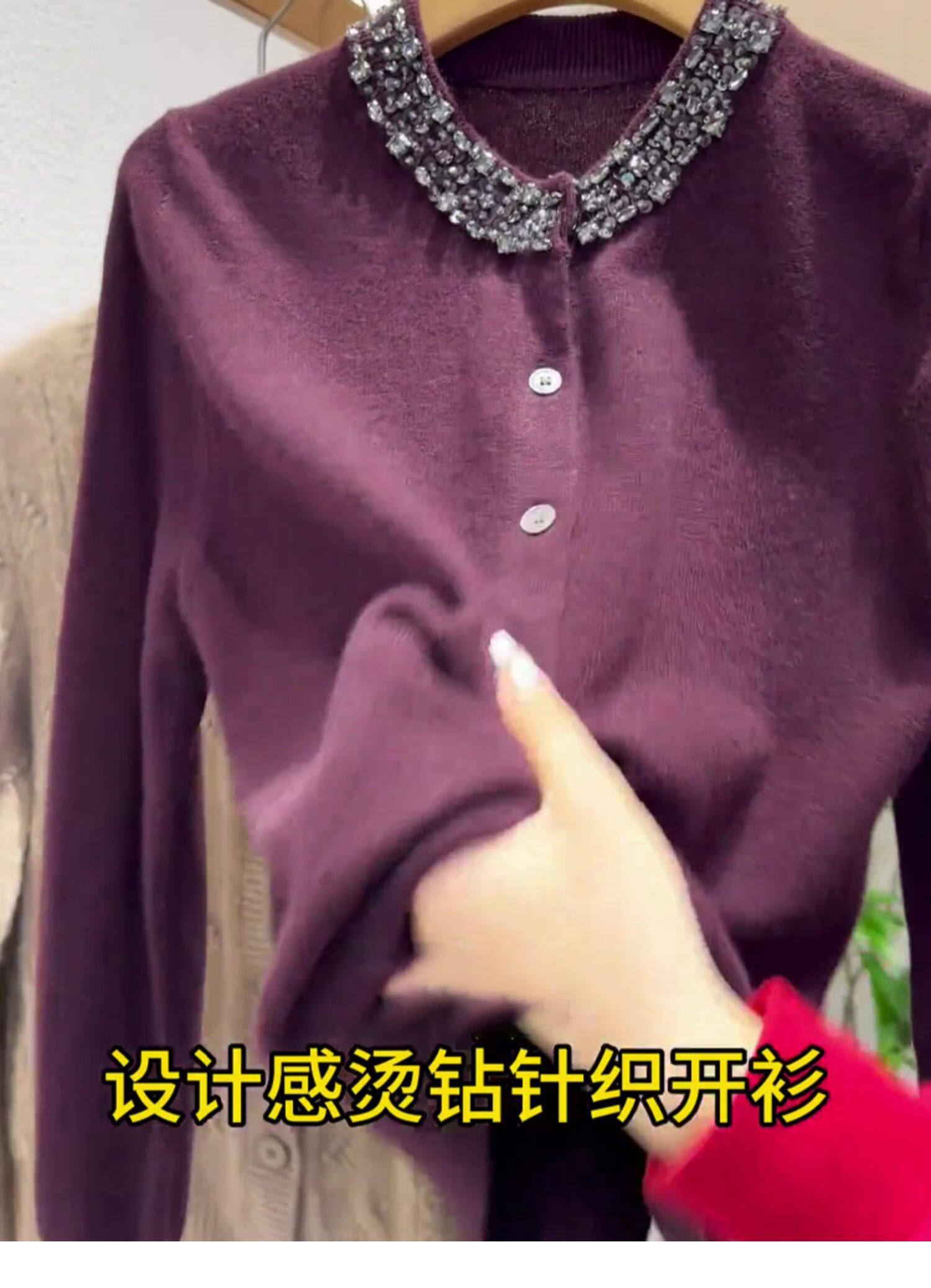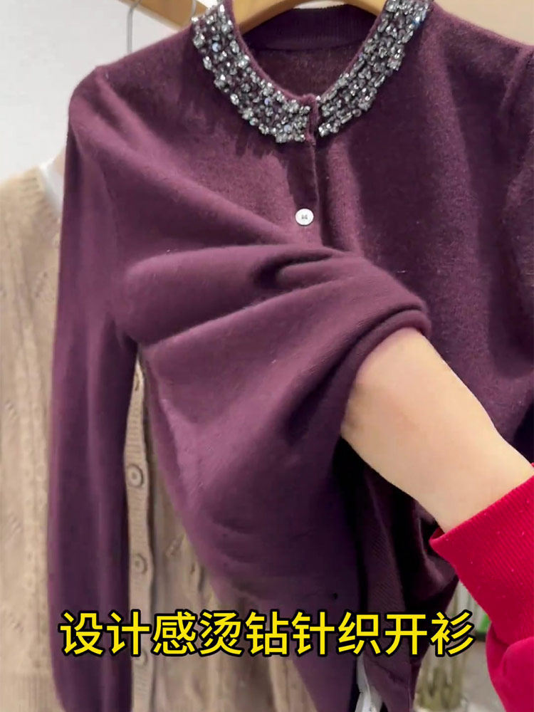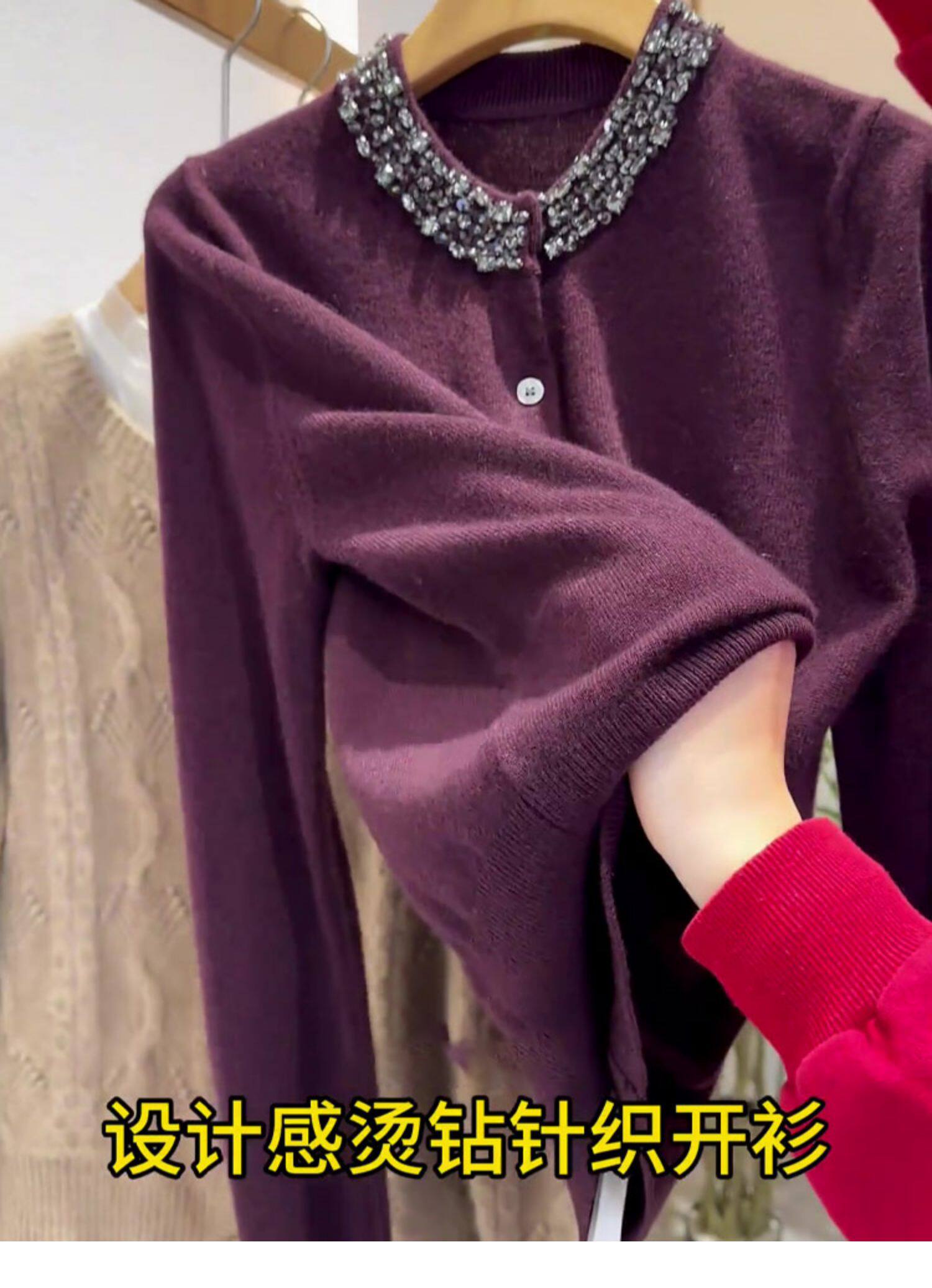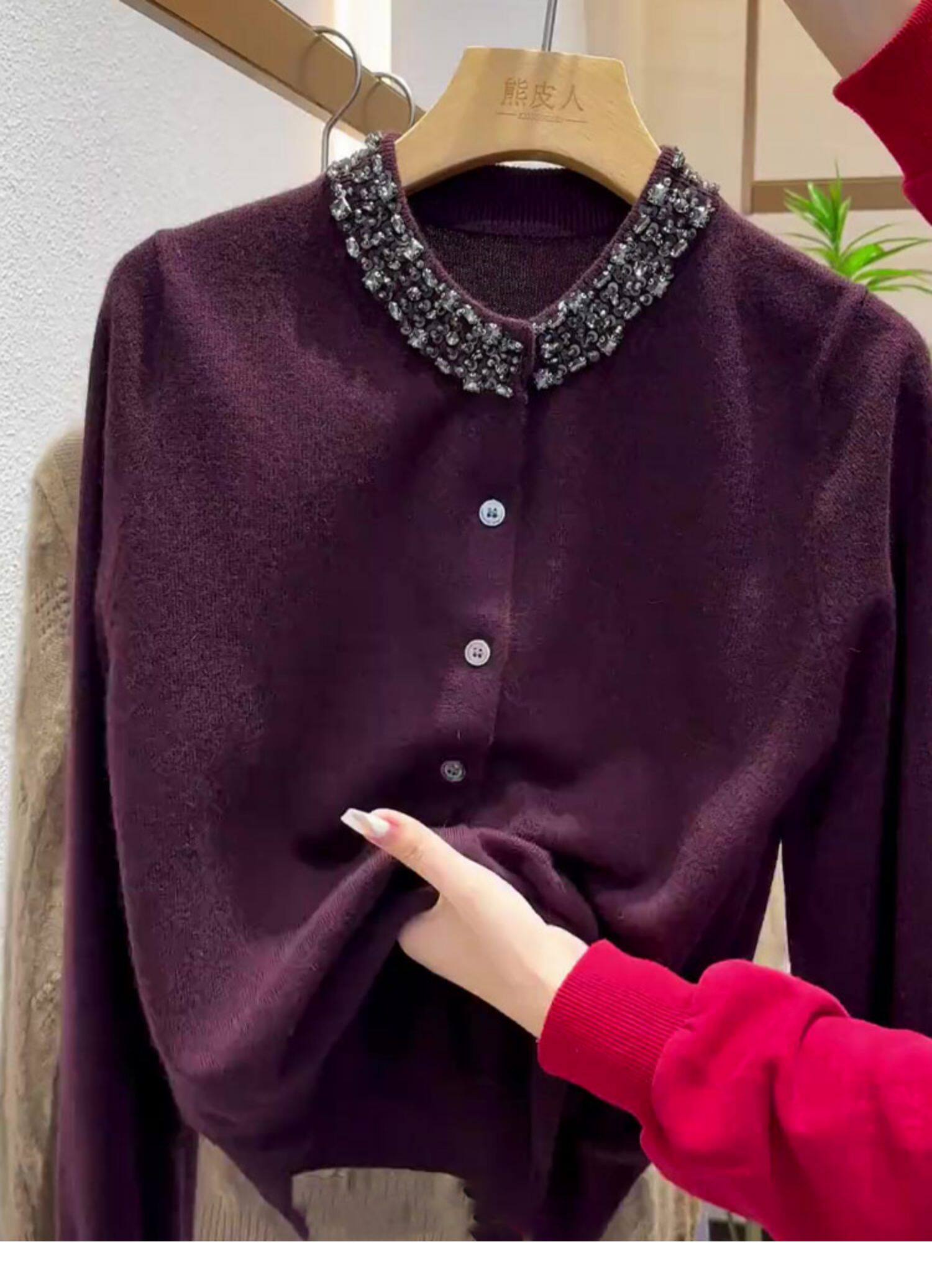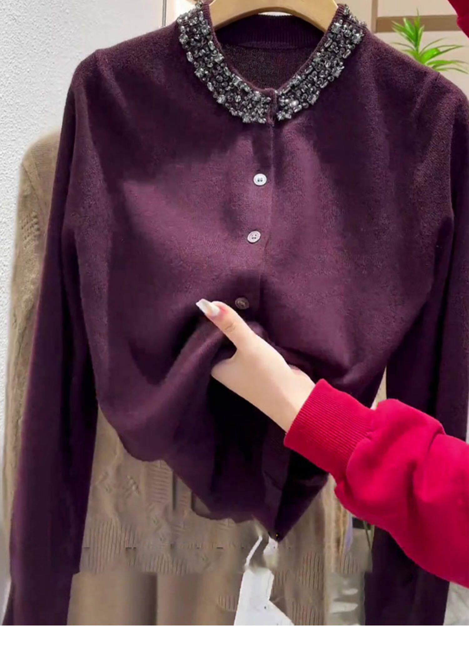 Purple color, round collar, long sleeve knitted women's shirt, new 2025 fall fashion, loose fit, slimming design, rhinestone design, large size, multifunctional shirt.