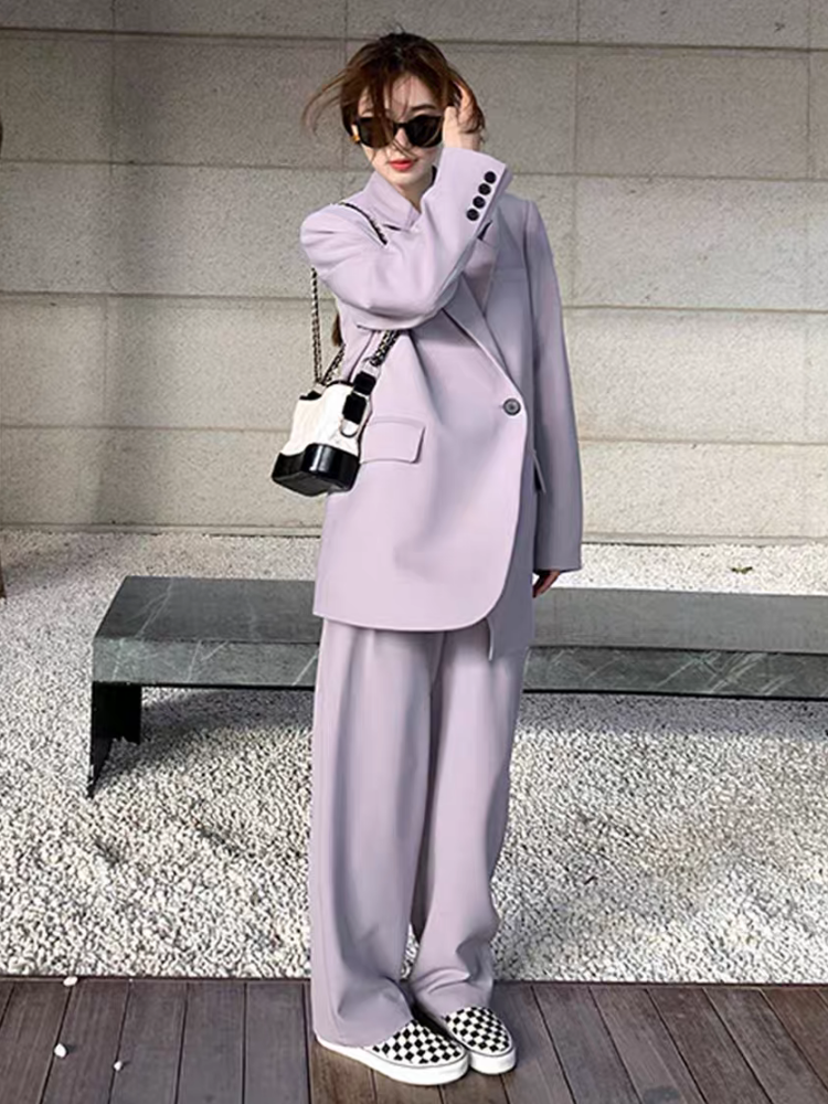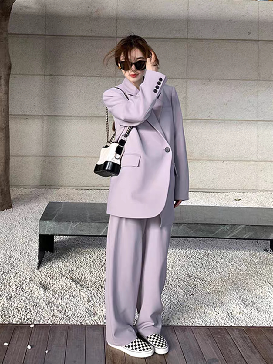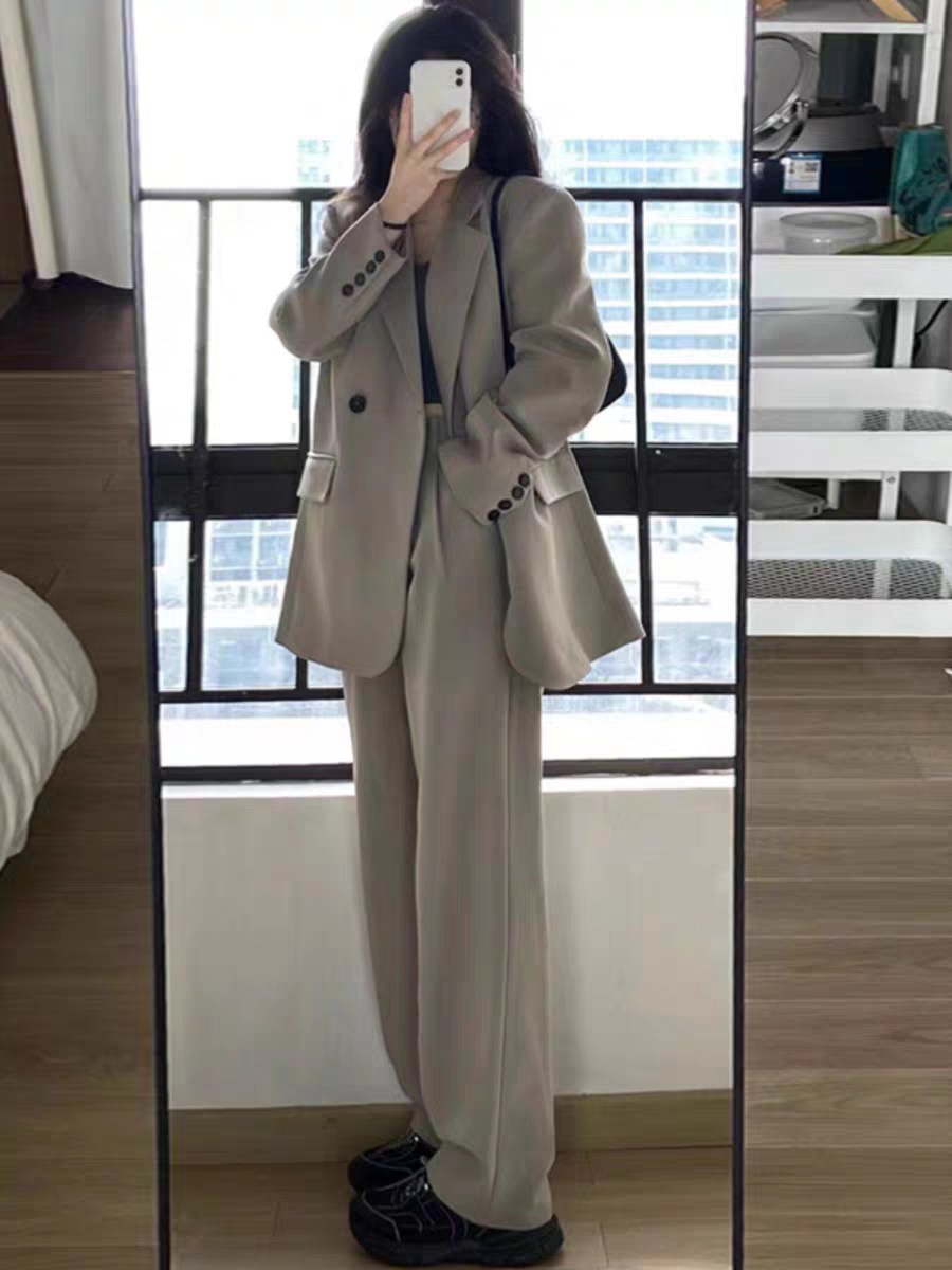 A high-end women's fall fashion two-piece sportswear set consisting of a blazer, wide-leg pants, and a casual style.