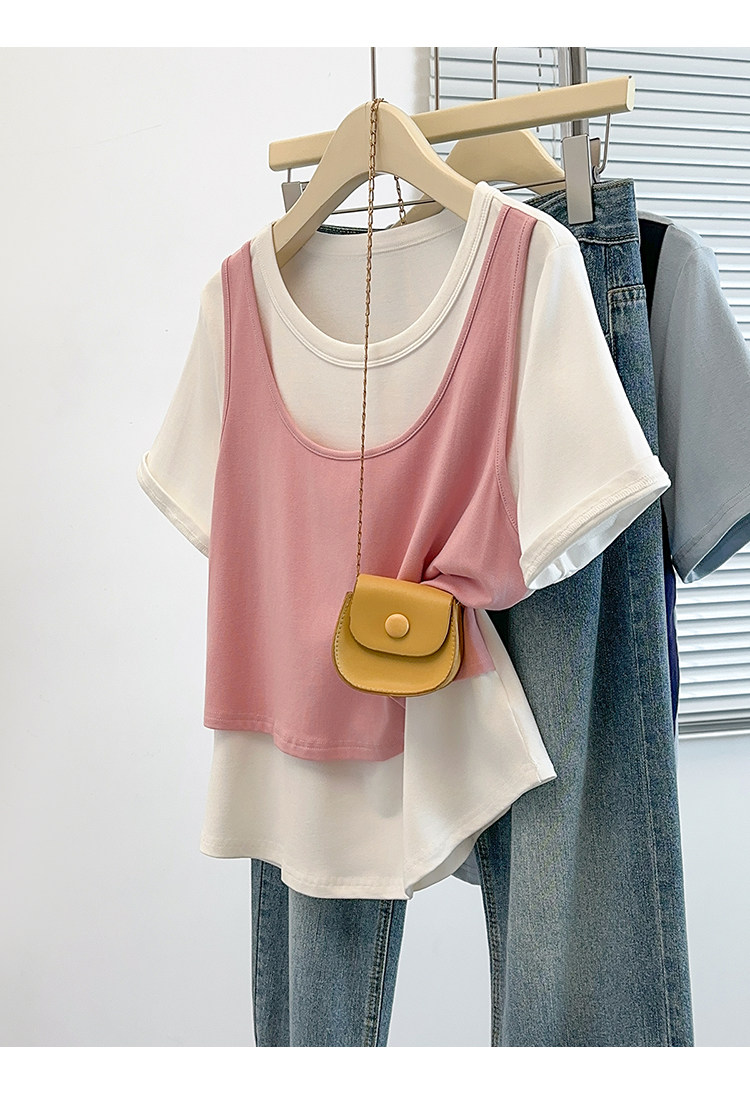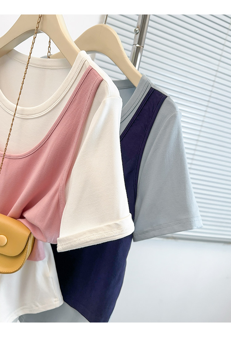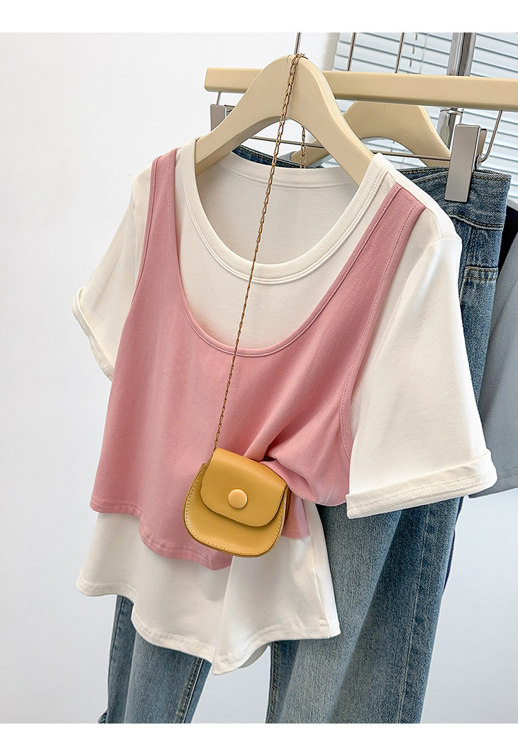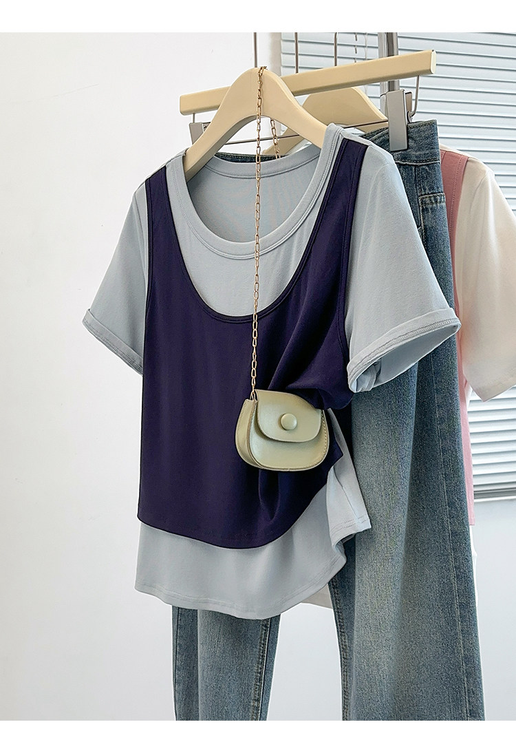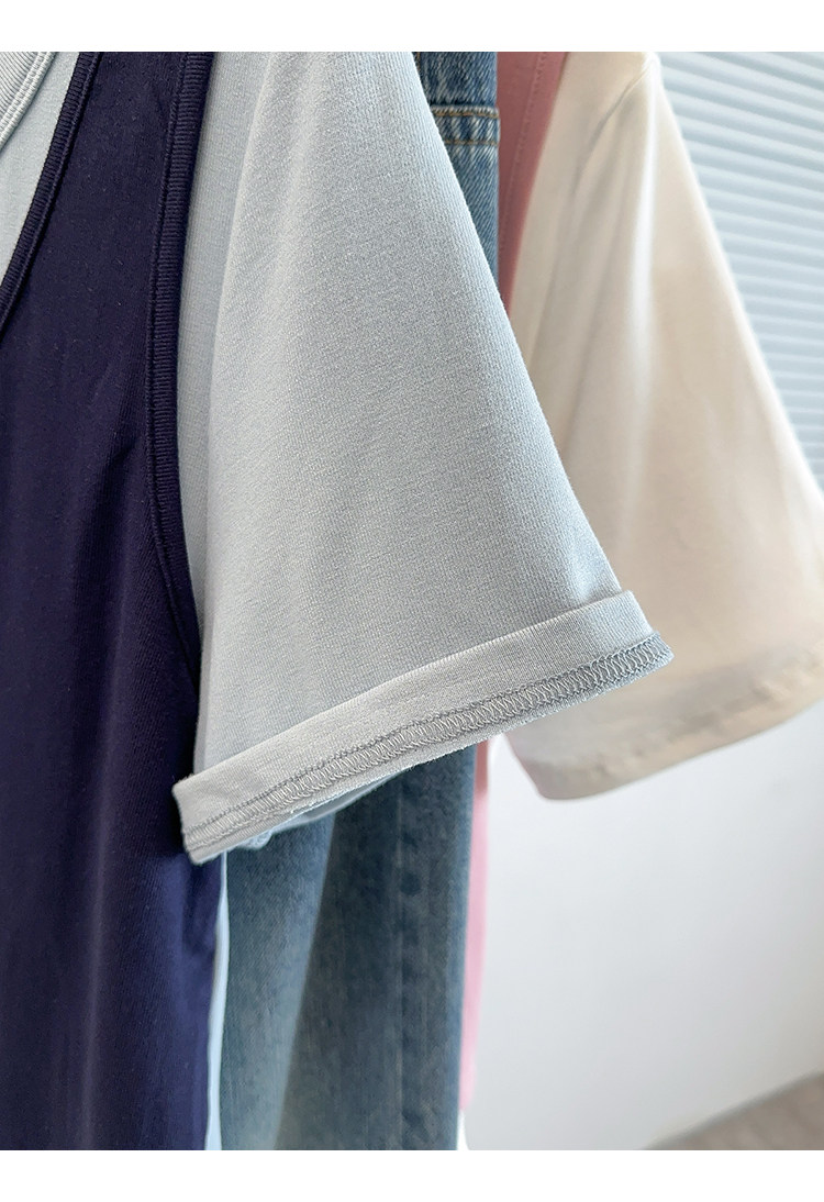 Böyük Ölçülü Koreya Üslublu Rəngli Bloklu Süni İki Parçalı Qısa Qollu Qadın Futbolkası, Yeni Yay Modeli, Boş Formalı, Arıqladıcı və Qarın Gizlədən Top