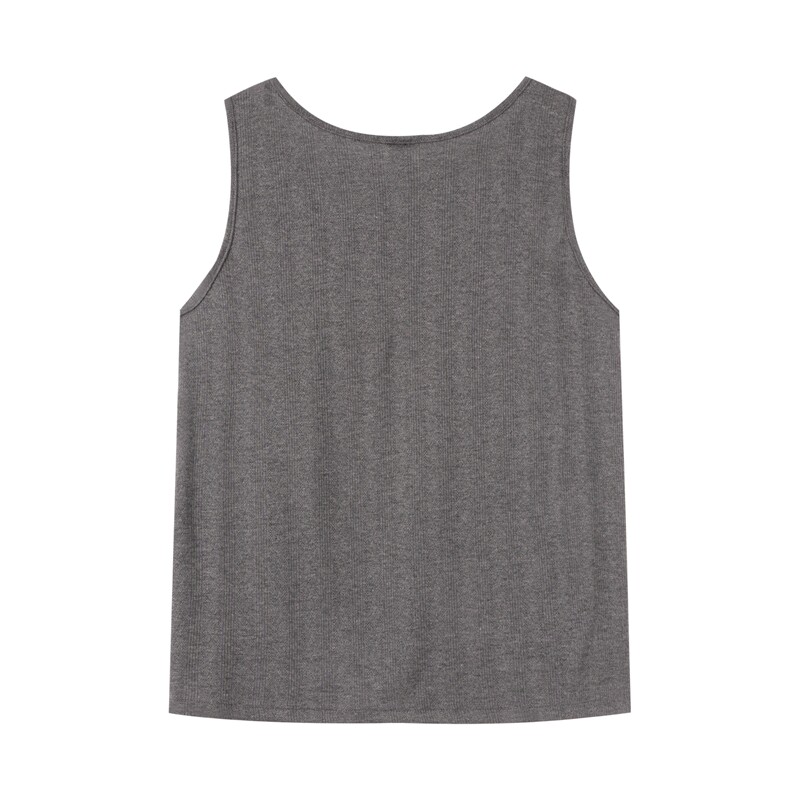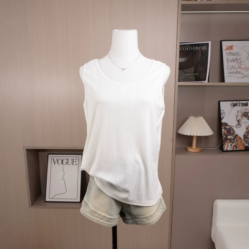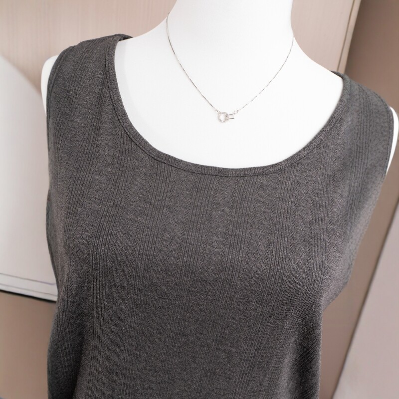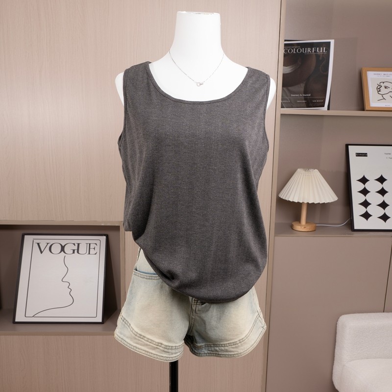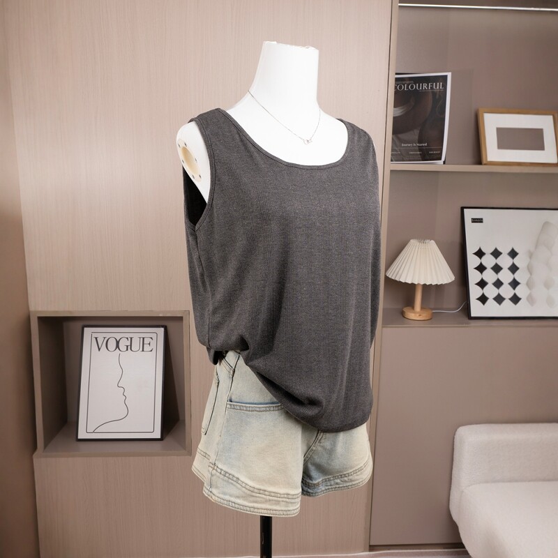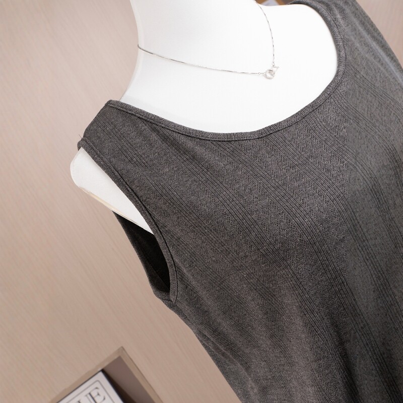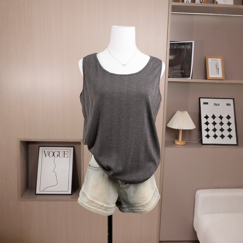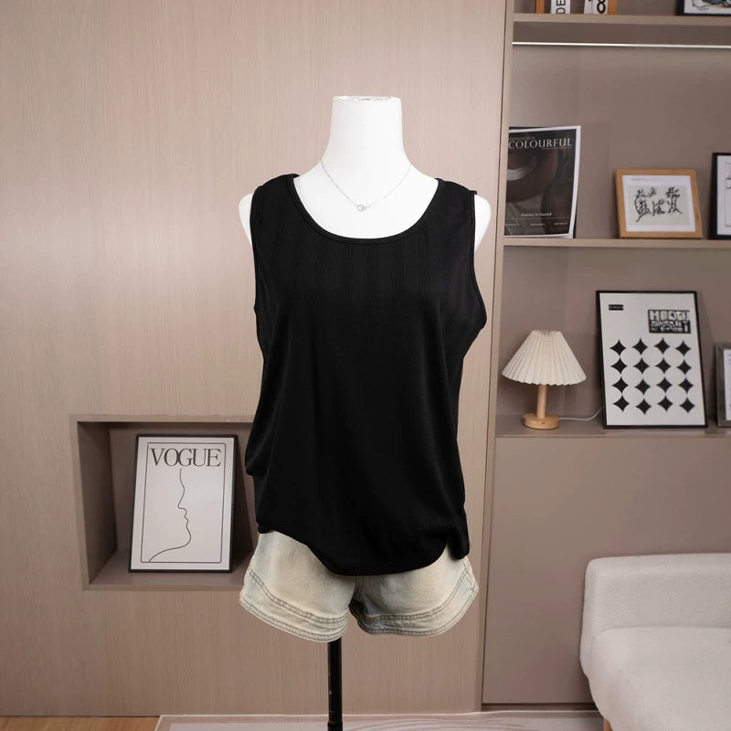 Böyük ölçülü qadın dairəvi yaxalı qolsuz mayka, yeni yay üslubunda, arıqladıcı və geniş formada, çöldə geyinmək üçün idealdır.