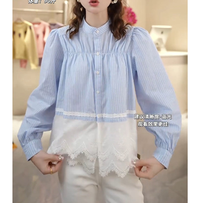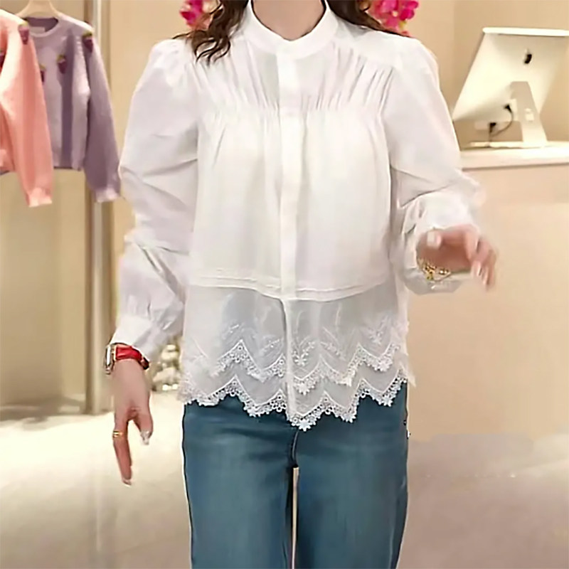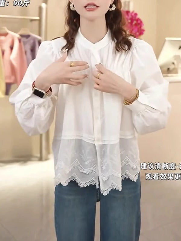 Böyük Ölçülü Qadın Geyimləri 2026 Yaz Yeni Fransız Krujeva Yamaqlı Köynək, Qəşəng, Boş Formalı, Arıqladıcı Uzunqol Top