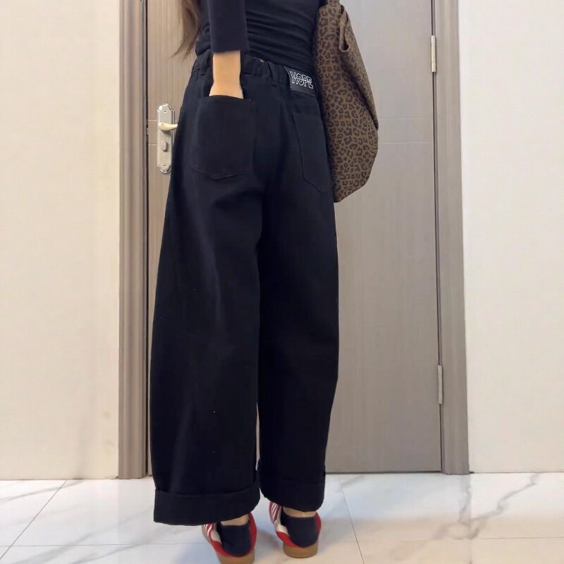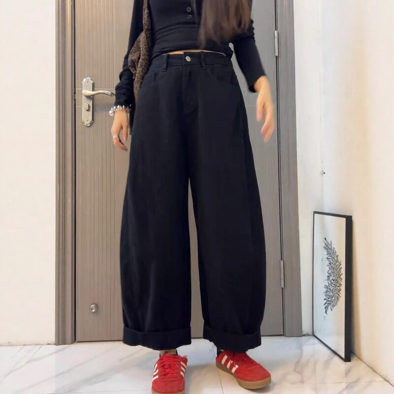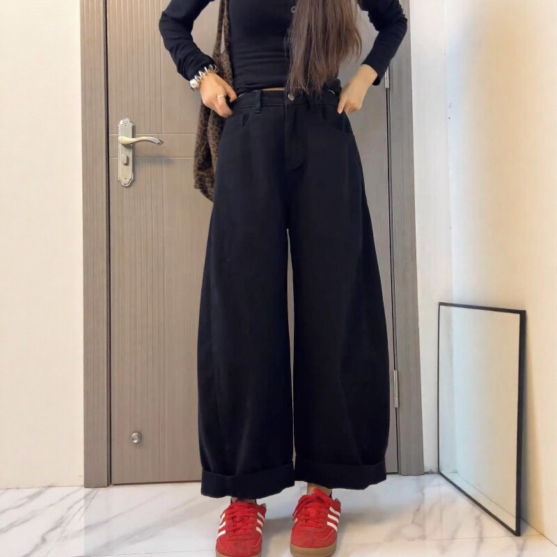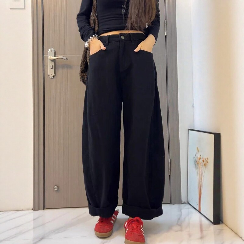 Bu ilin dəbli qadınlar üçün böyük ölçülü düz ayaqlı cins şalvar, yeni 2026-cı ilin yaz modası, arıqladıcı və geniş oturan geniş ayaqlı ata cins şalvarı.