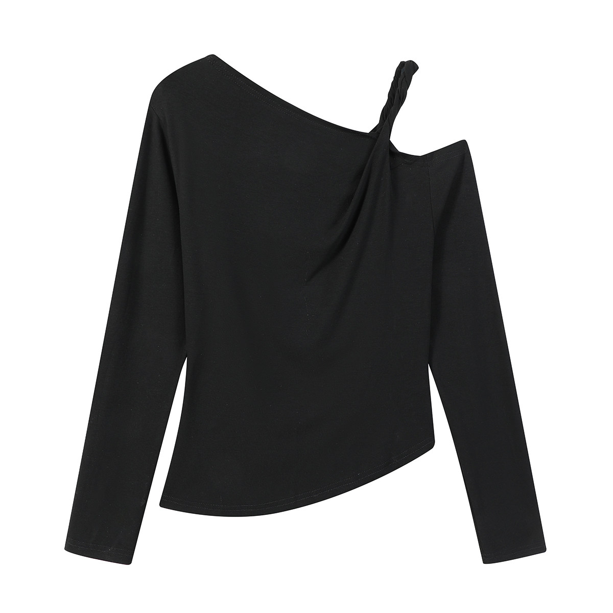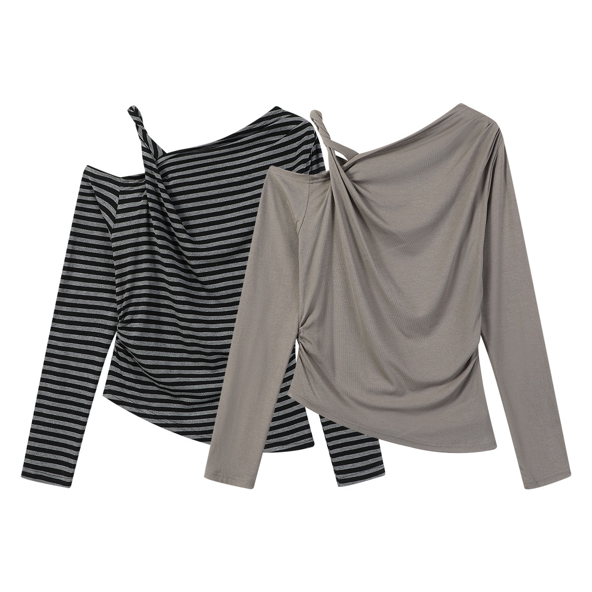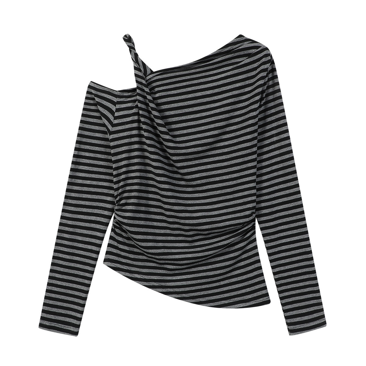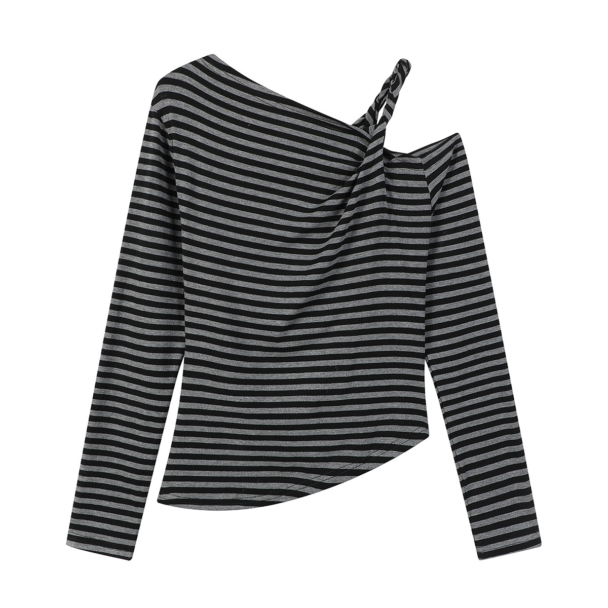 Cholisa-nın özünəməxsus çiyinləri açıq top, erkən yaz/payız 2026 yeni üslubunda, nizamsız, yüksək səviyyəli zolaqlı uzunqol qadın futbolkası.