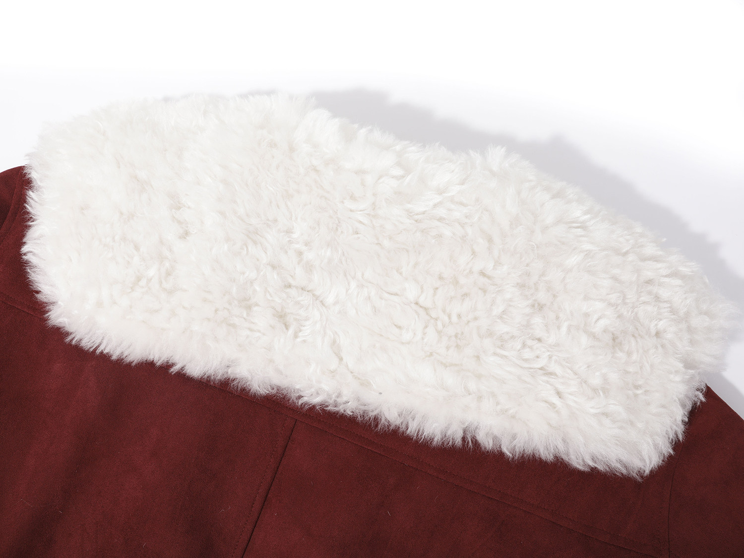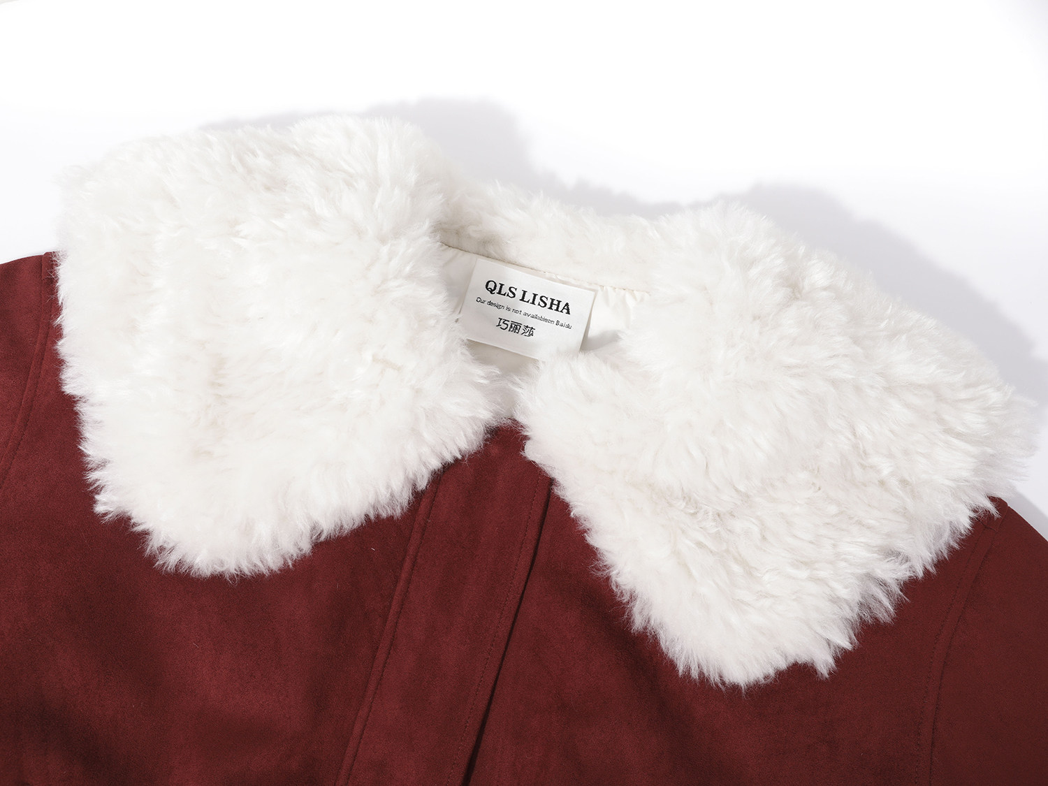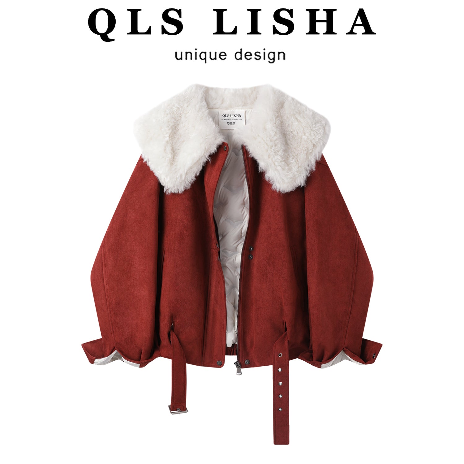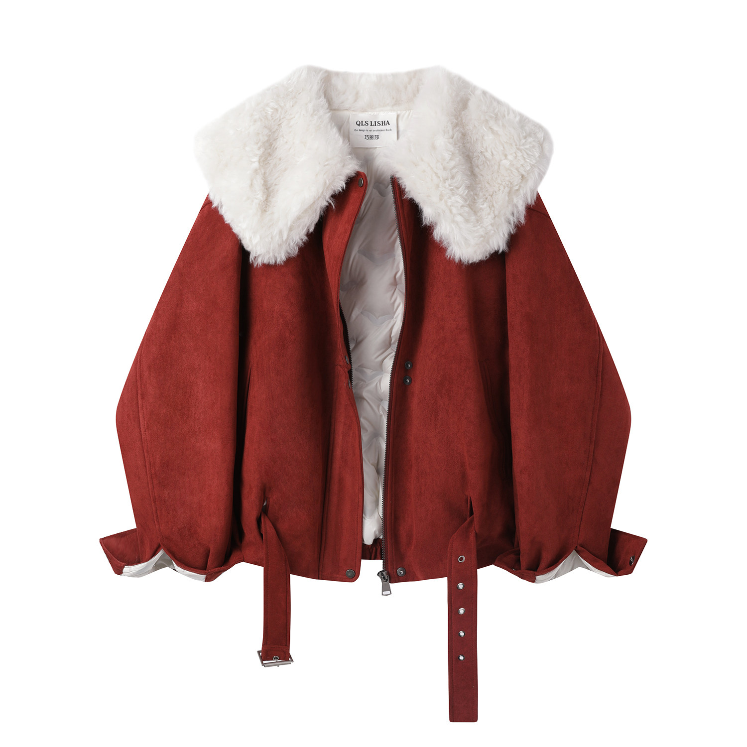 Cholisa-nın özünəməxsus və gözəl qış isti qırmızı qısa qalın paltosu, quzu yun yaxası olan qadın aşağı gödəkçəsi.