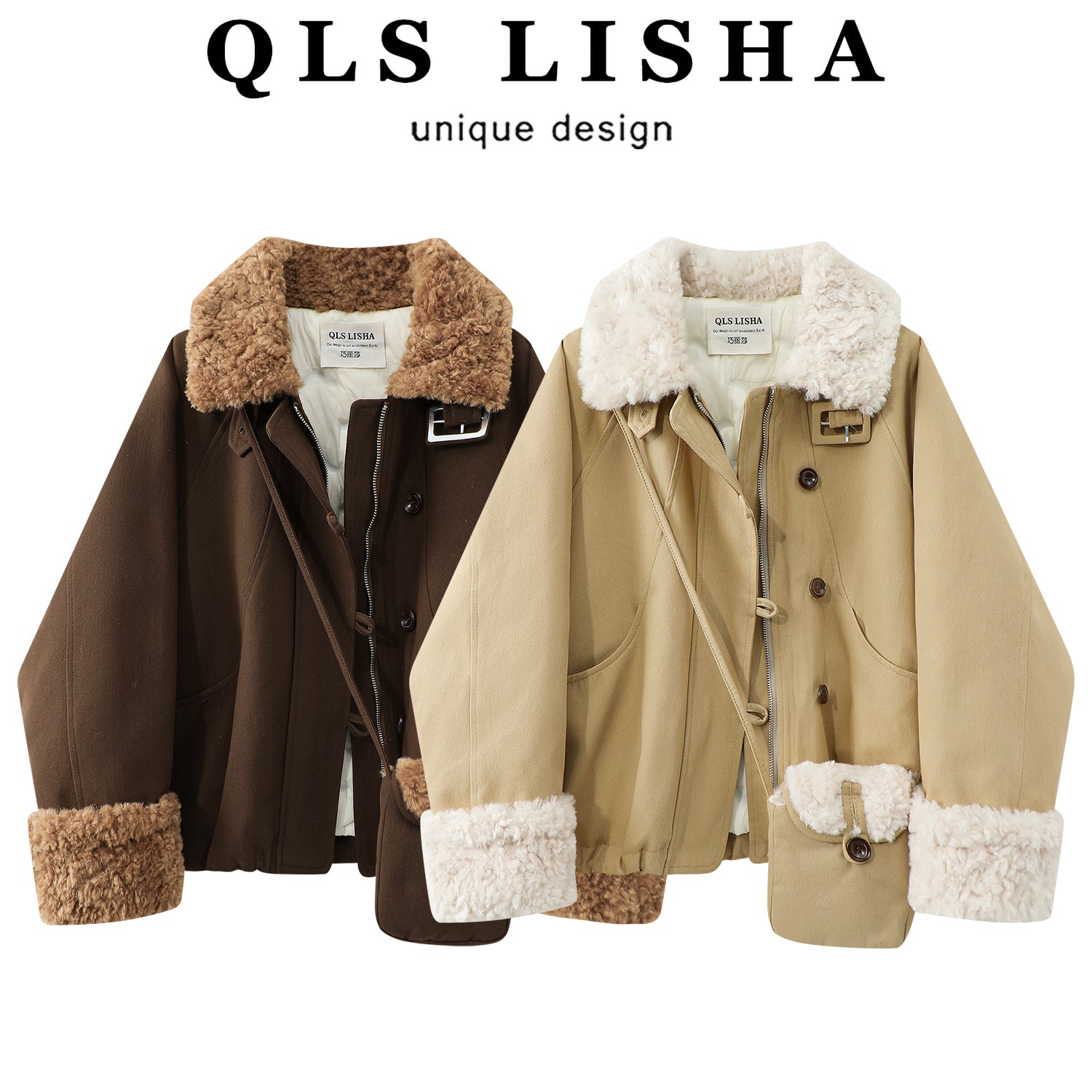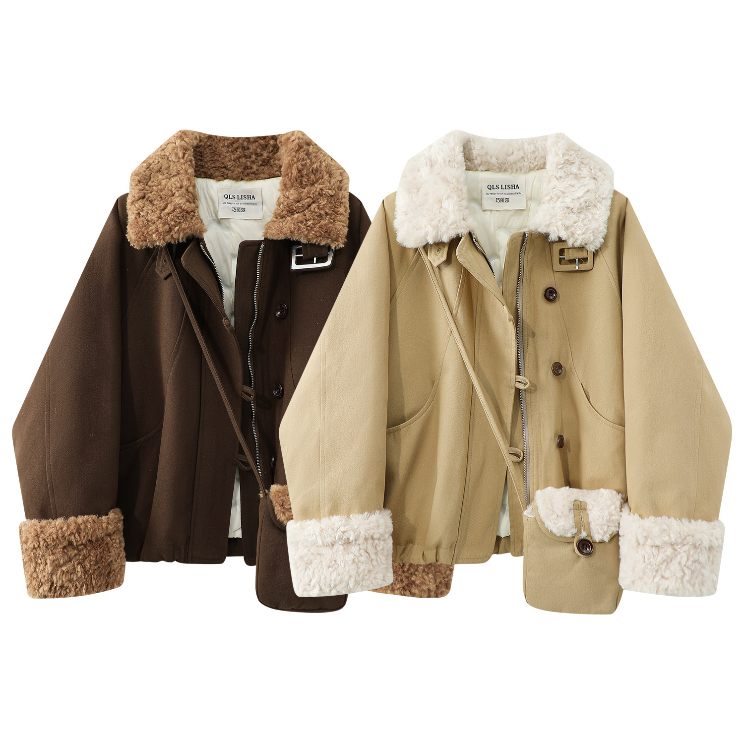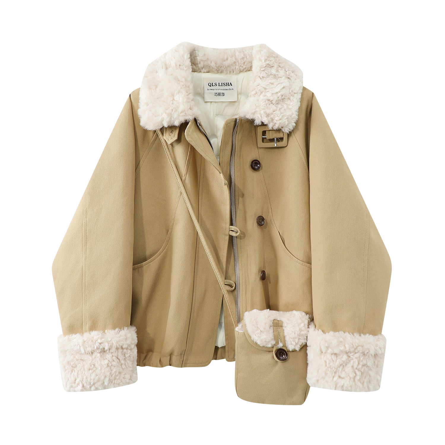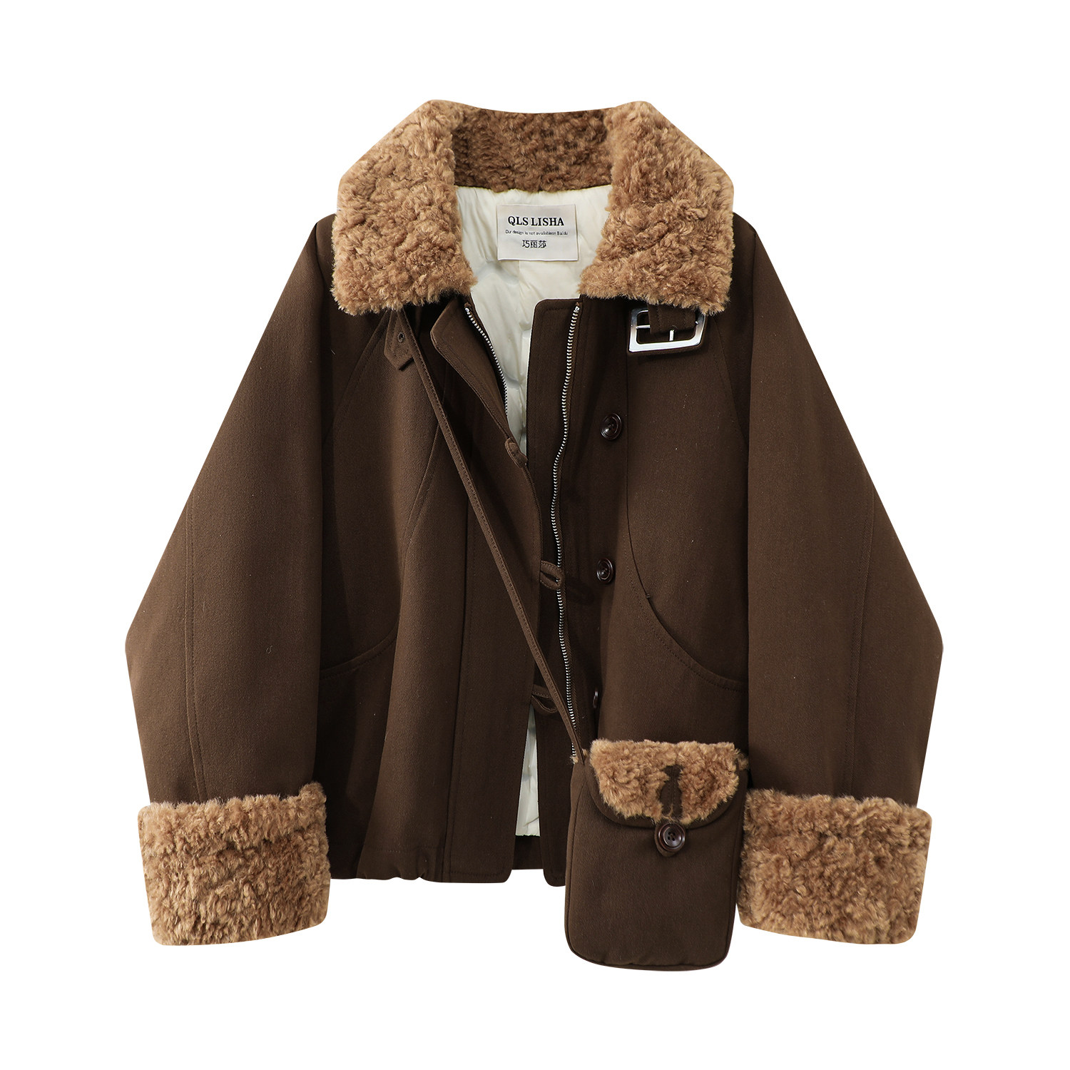 Cholisa-nın quzu yun yaxası ilə qışın əvvəlində qalın paltosu, isti iş geyimi üslubunda aşağıdan hazırlanmış parka qısa topu, qadınlar üçün