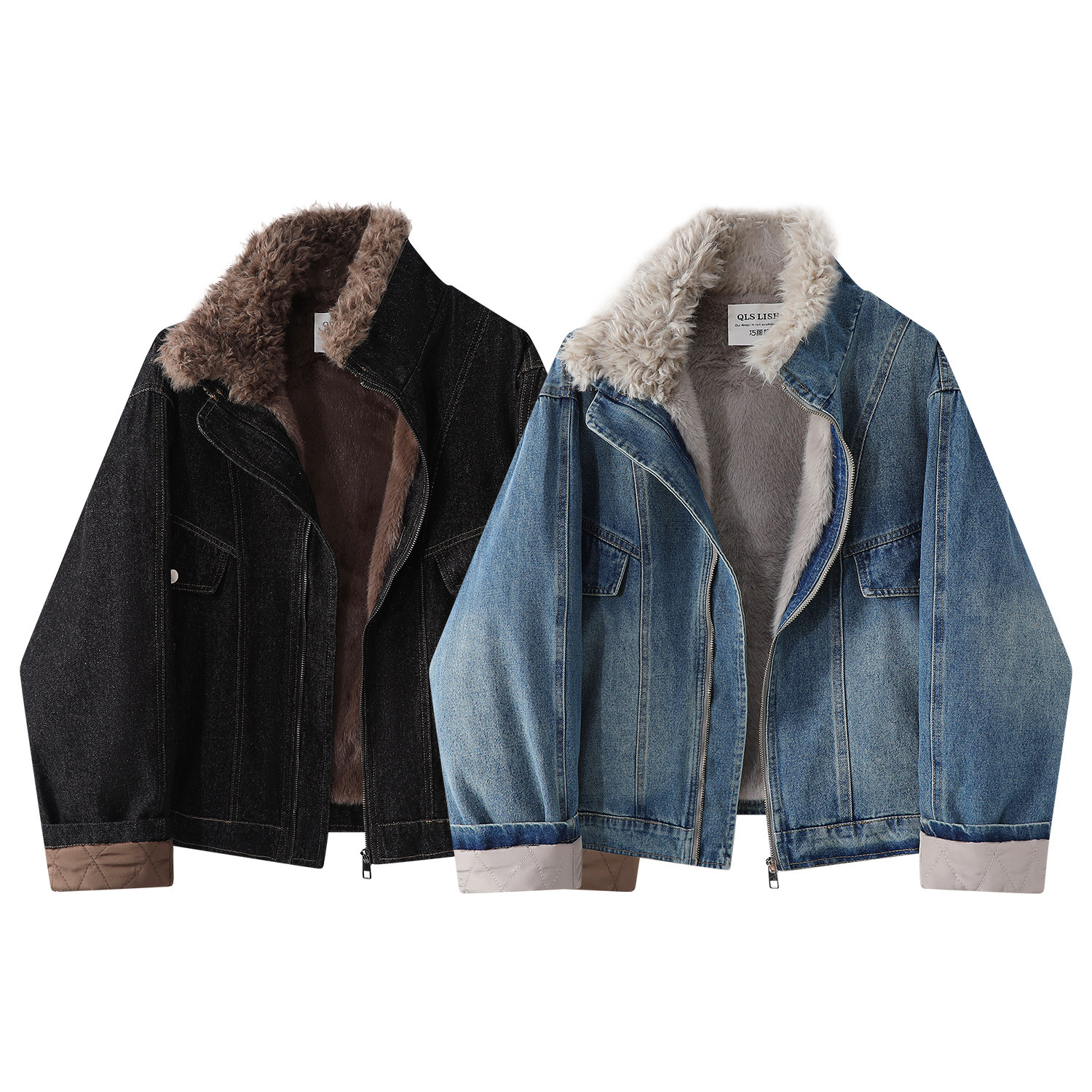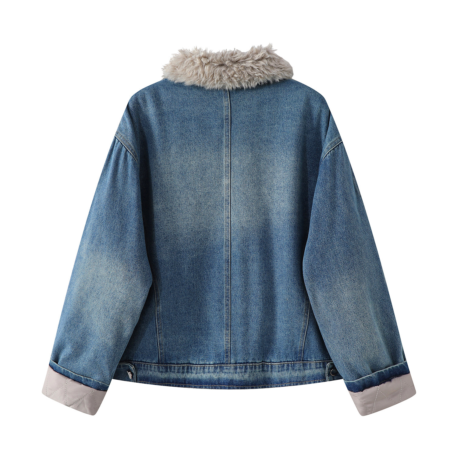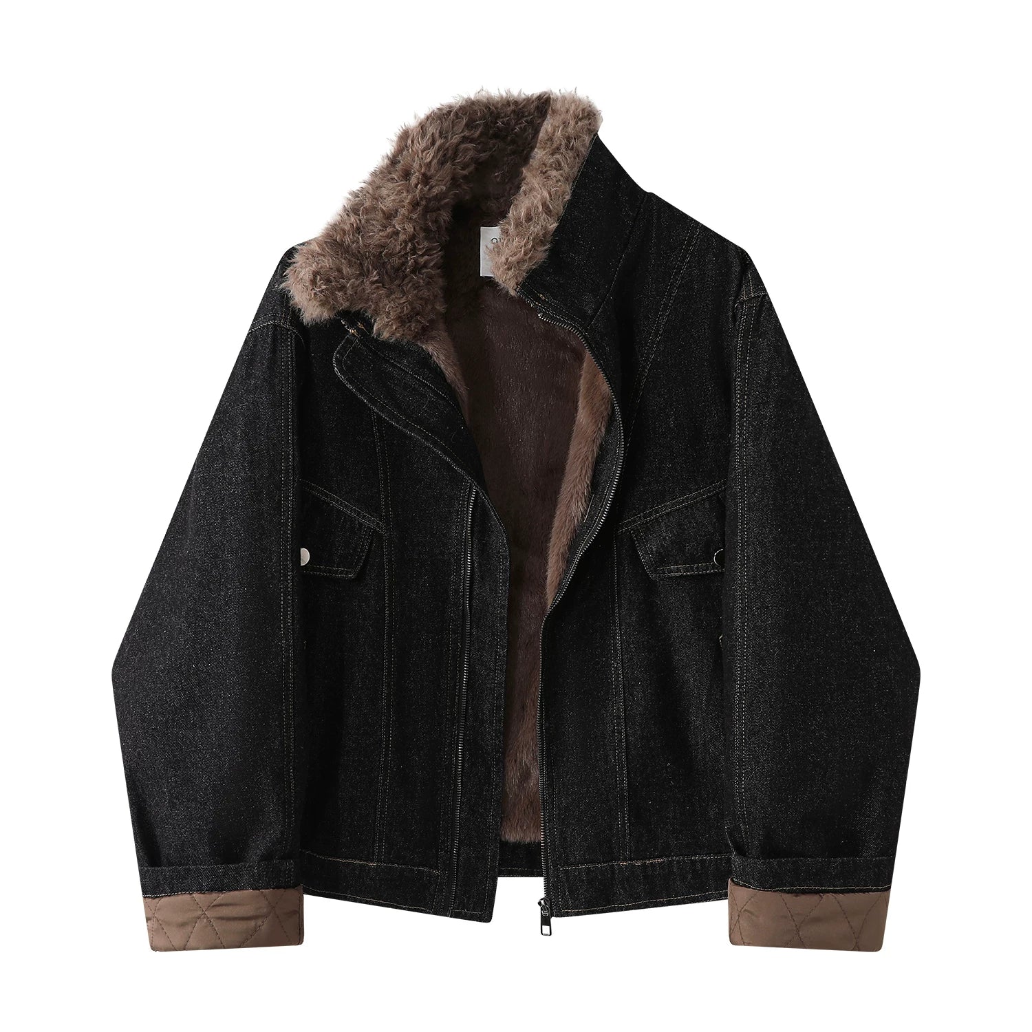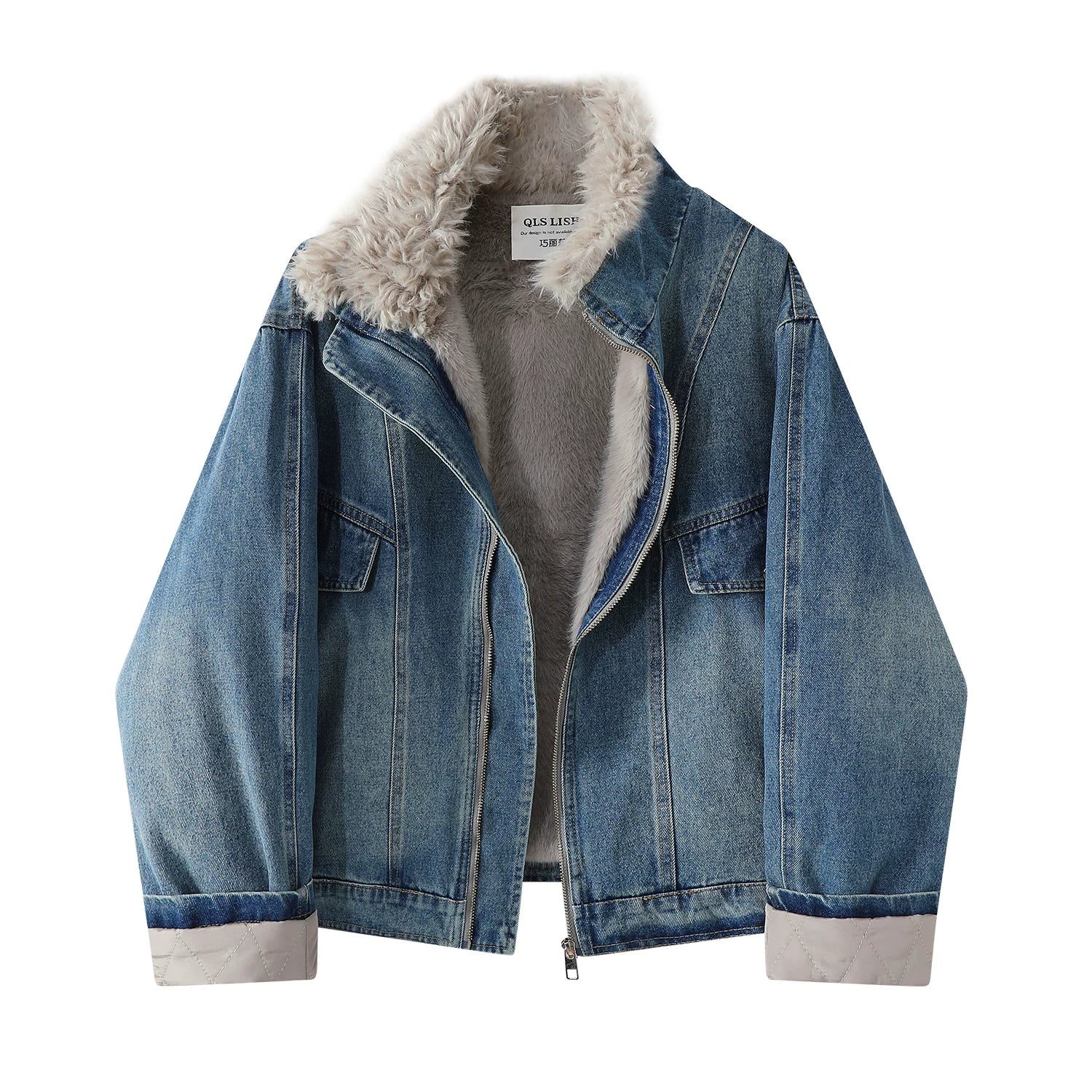 Cholisa Qadınlar üçün Yun Astarlı Qalın Denim Gödəkçə 2025 Yeni Amerika Stilində Quzu Yunlu Gödəkçə Qış Tüklü Top