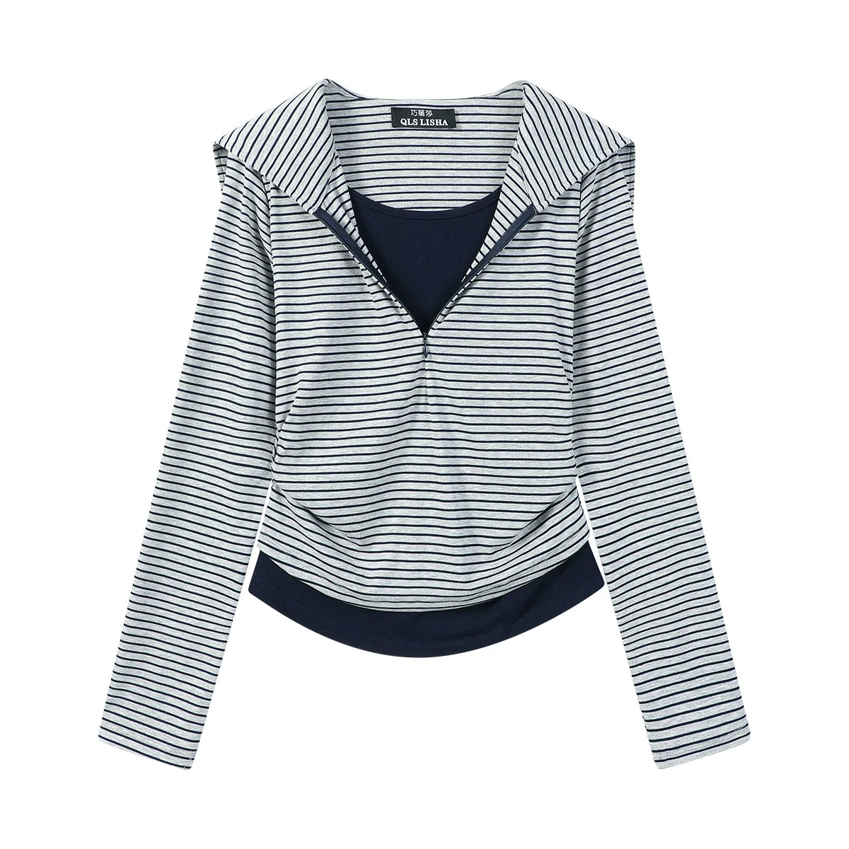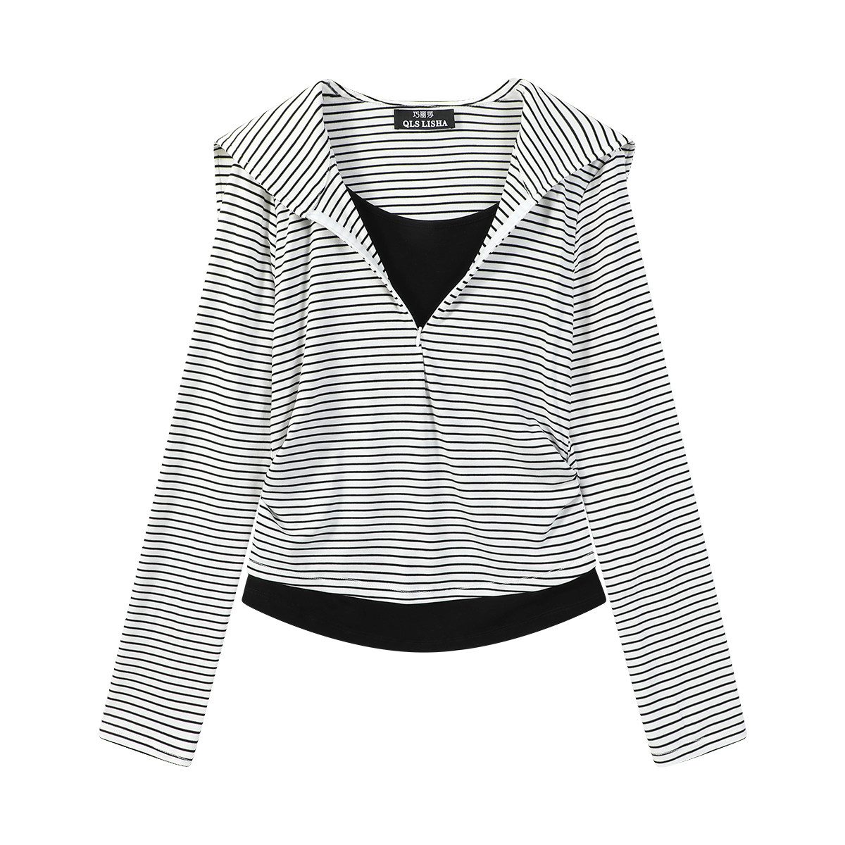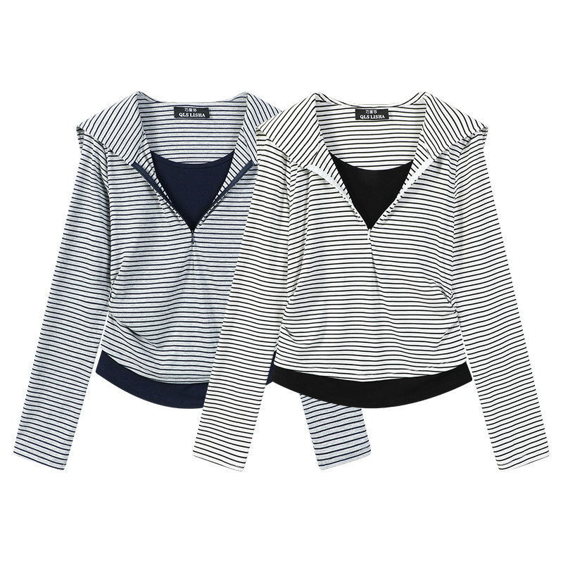 Cholisa Seksual İncə Fit Zolaqlı Patchwork Faux İki Parçalı Dənizçi Yaxalıqlı Uzun Qollu Köynək Qadınlar üçün Əsas Qatlı Top