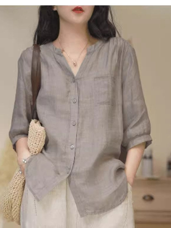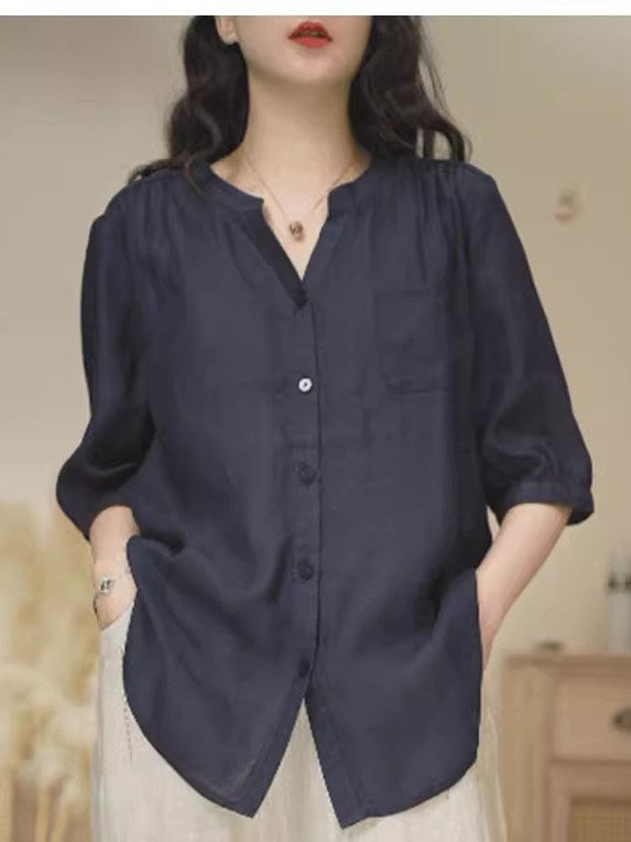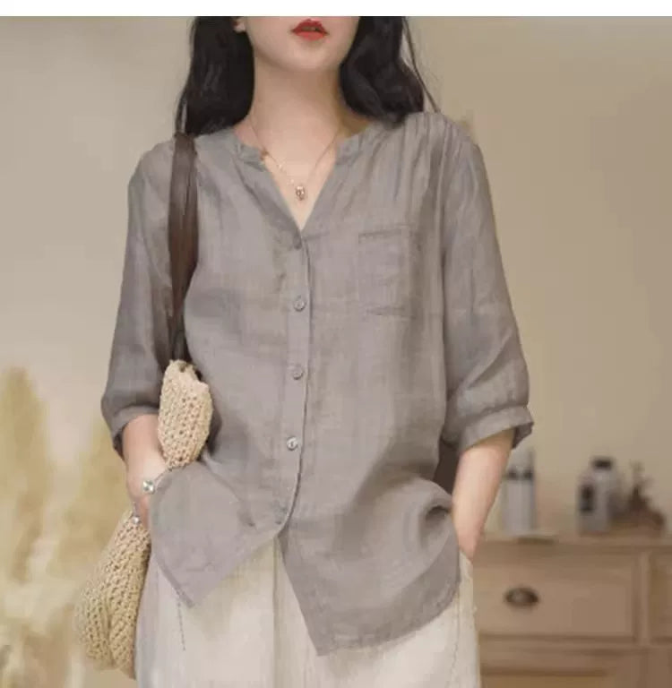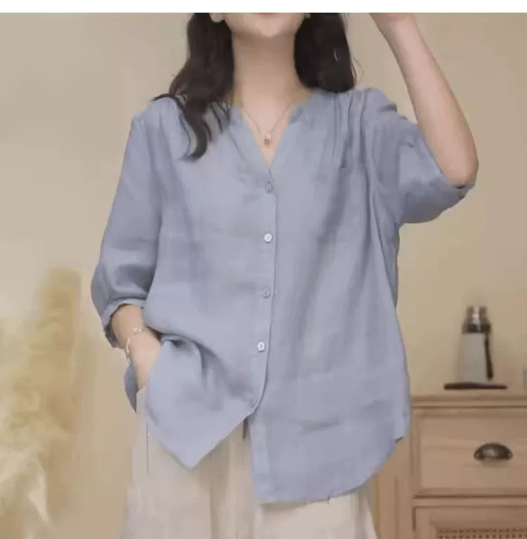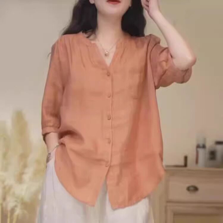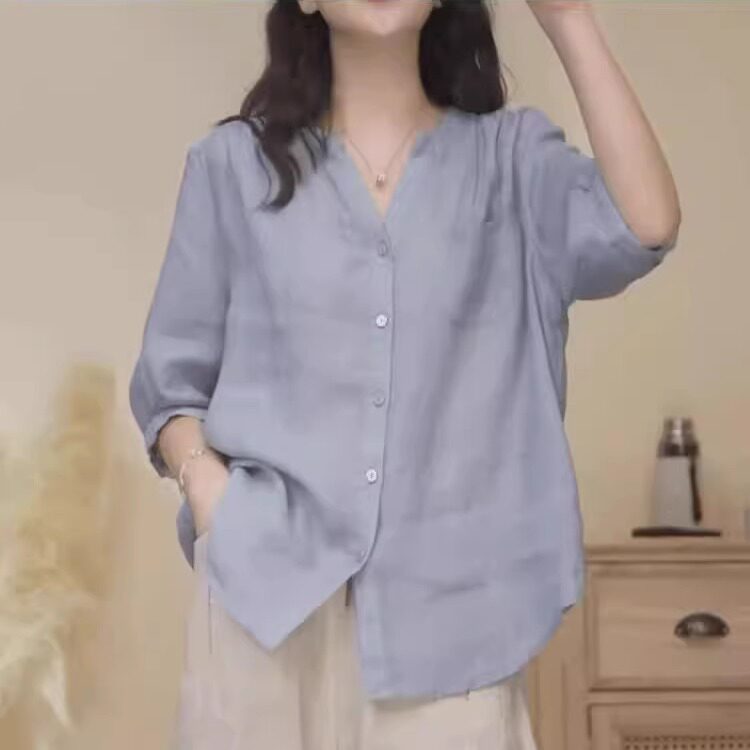 Düz rəngli V-yaxalı rami köynək, yeni yay stili, böyük ölçü, geniş forma, qarnını gizlədir, qolların dörddə üçü, dəbli top.