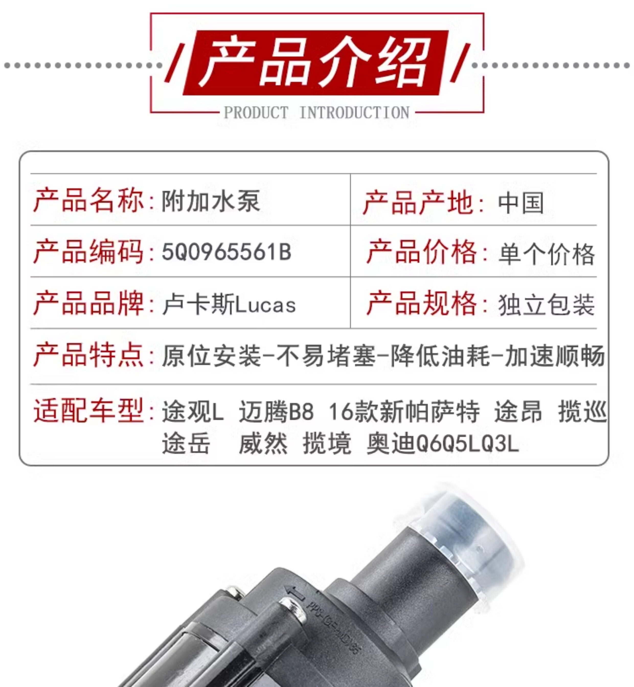 Compatible with Audi Q6, Q5L, Q3L, Tiguan L, Magotan B8, New Passat, Teramont, Viloran and Range Rover with electronic auxiliary water pumps.