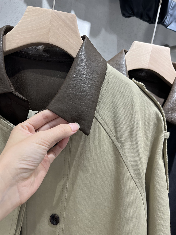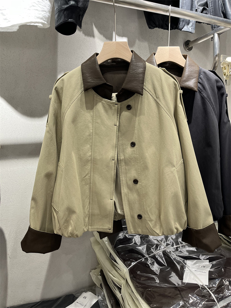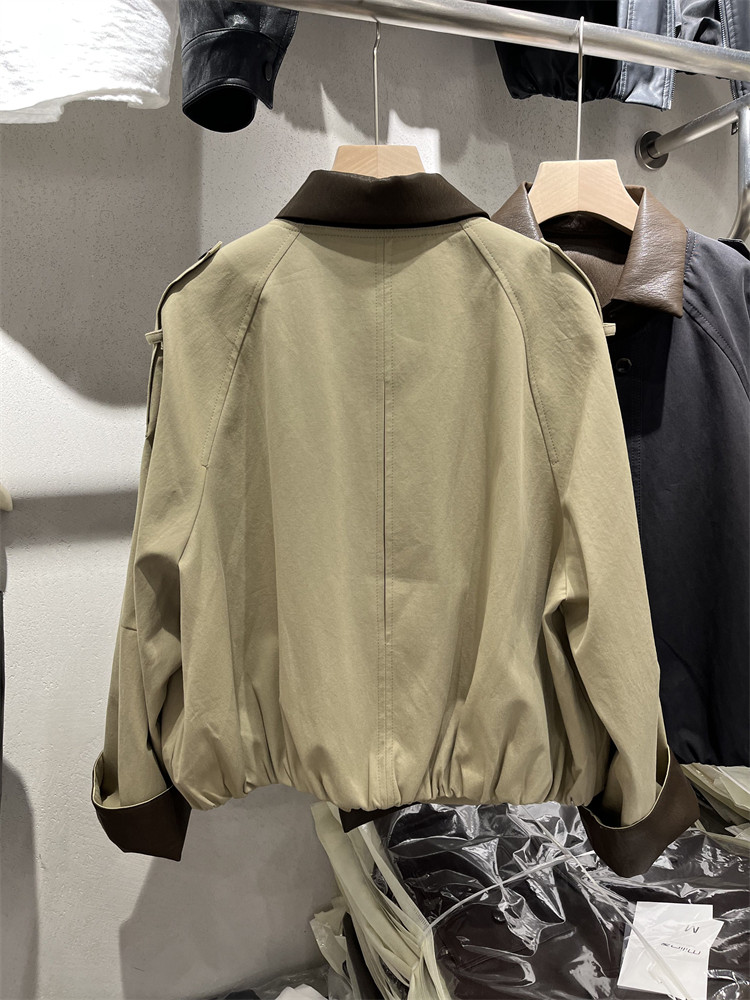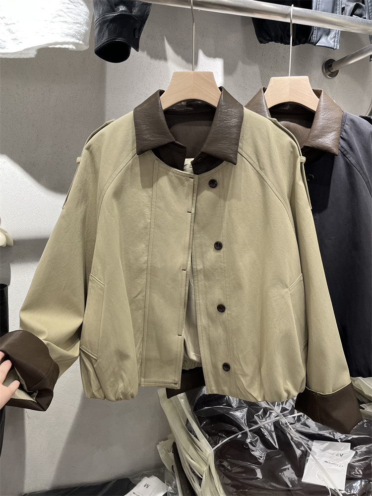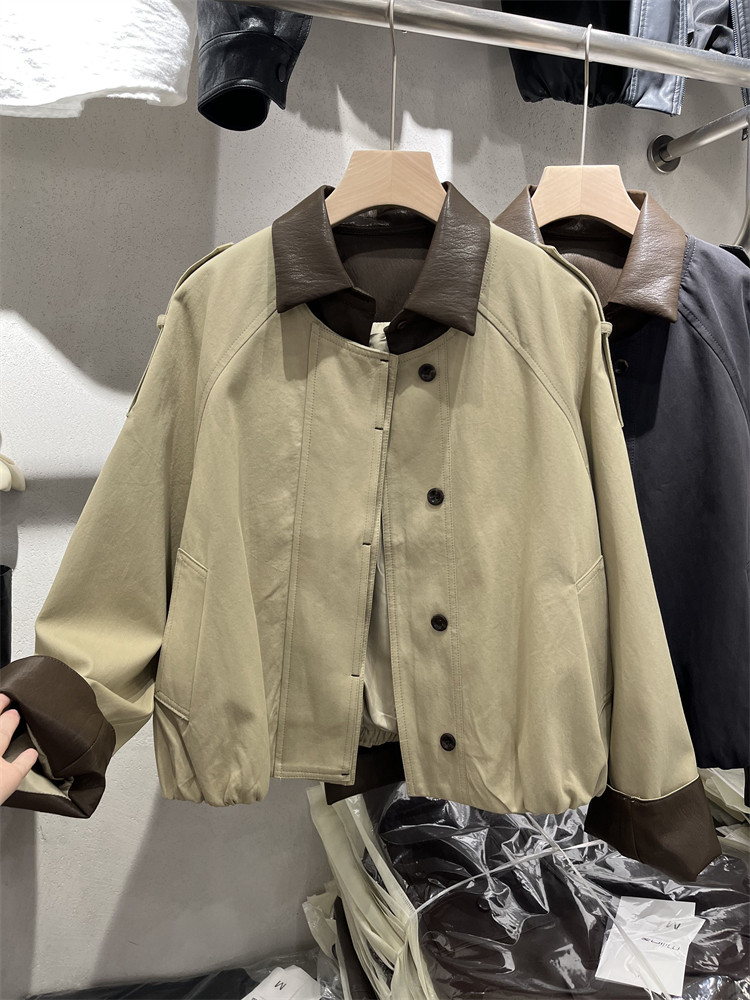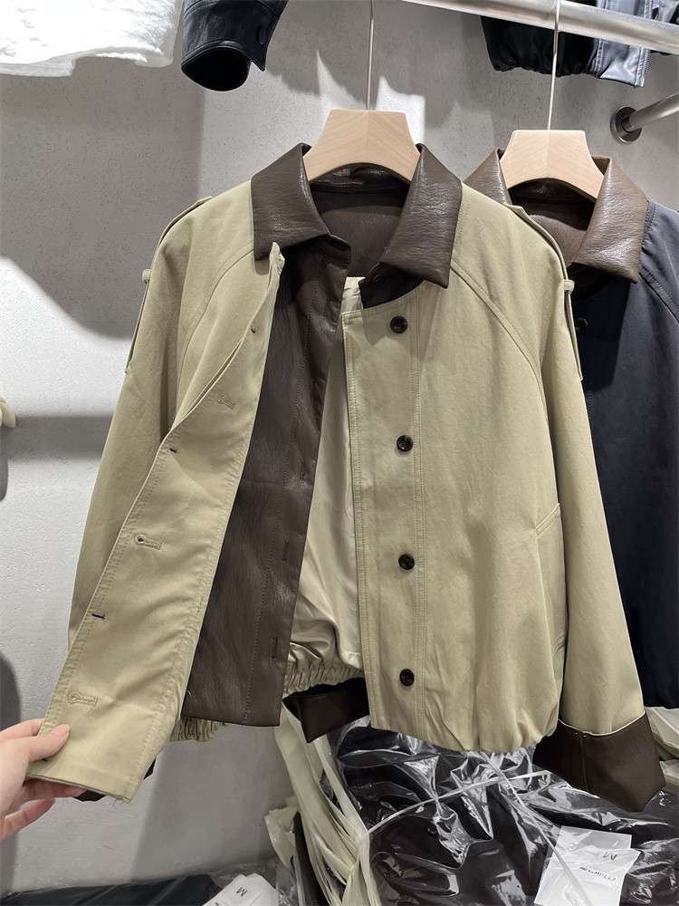 Koreya üslubunda, kiçik bədən quruluşlu qadınlar üçün yüngül, lüks qısa trençkot, yamaqlı dəri polo yaxası, yeni 2025 payız modası olan gündəlik gödəkçə.
