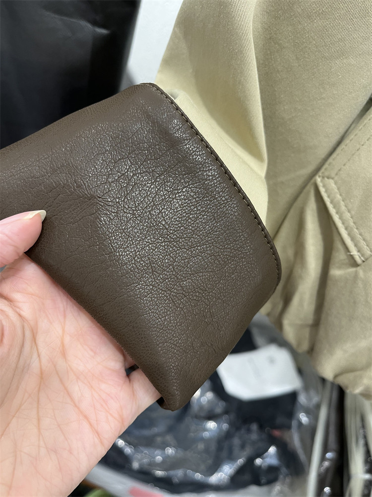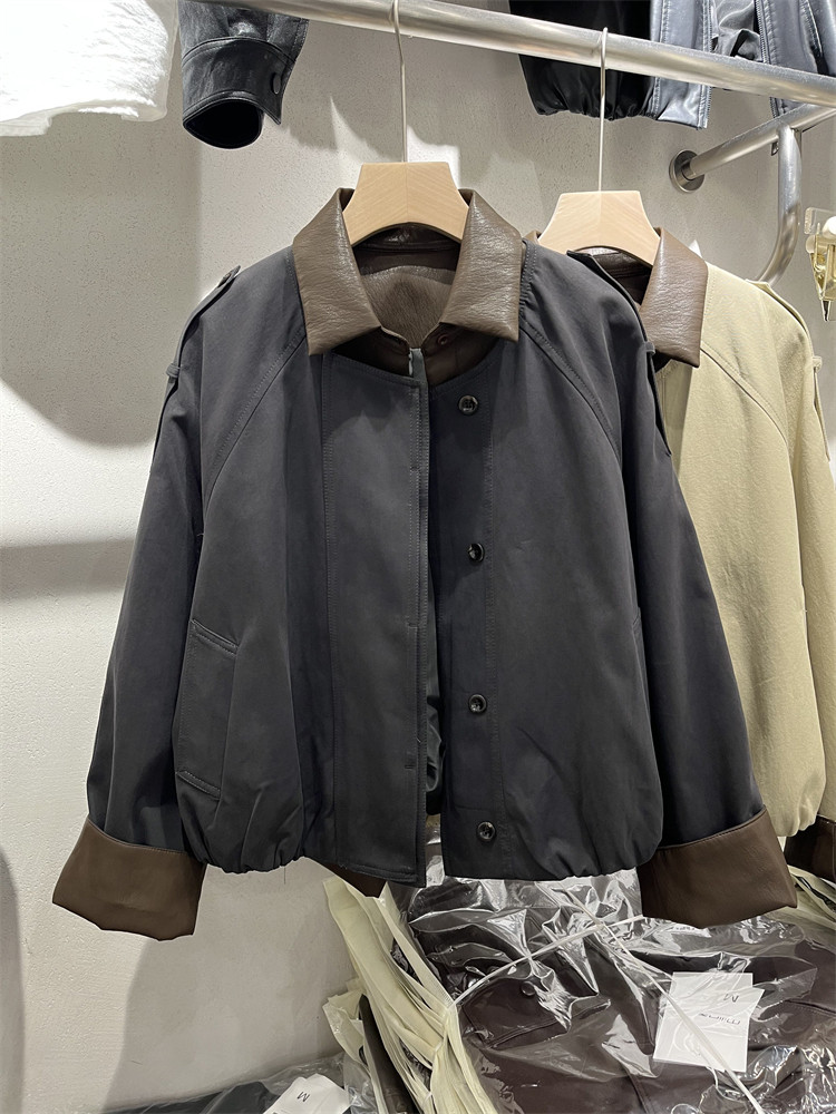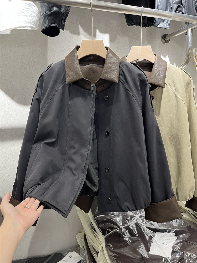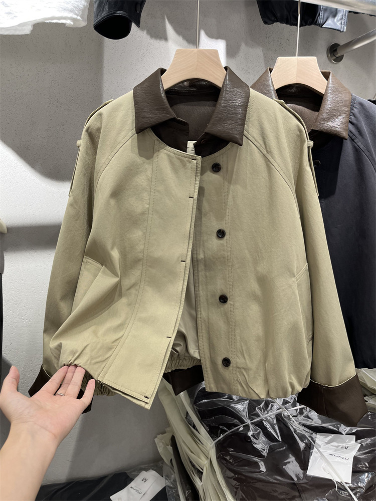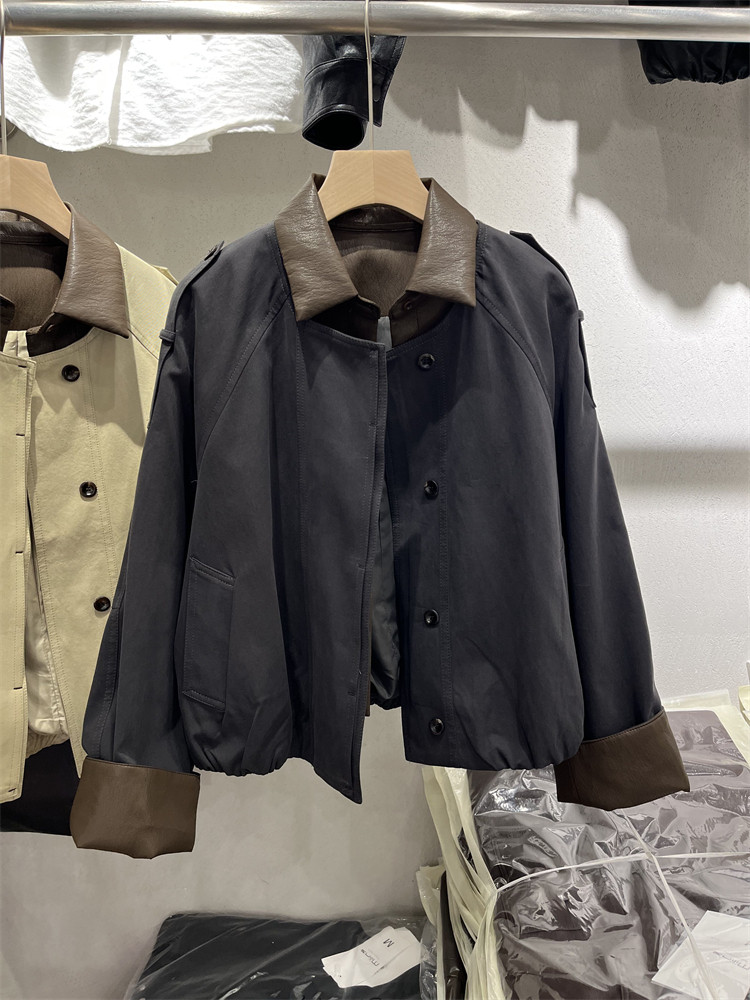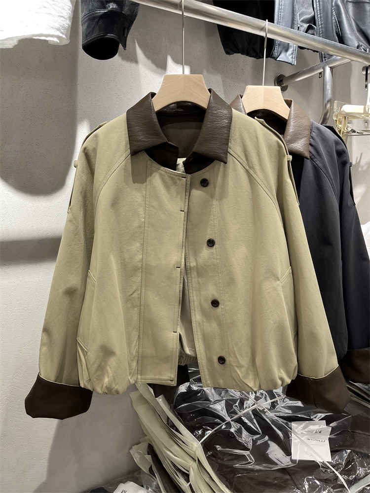 Koreya üslubunda, kiçik bədən quruluşlu qadınlar üçün yüngül, lüks qısa trençkot, yamaqlı dəri polo yaxası, yeni 2025 payız modası olan gündəlik gödəkçə.