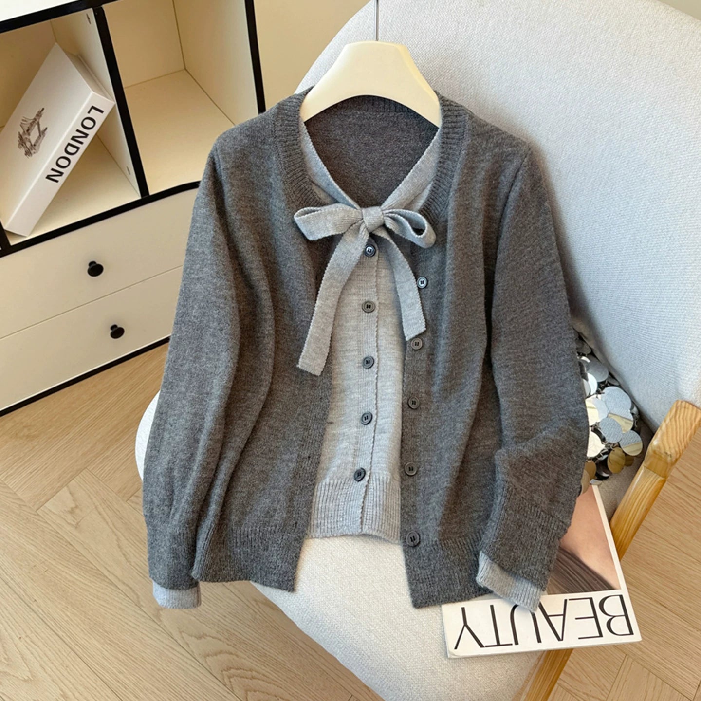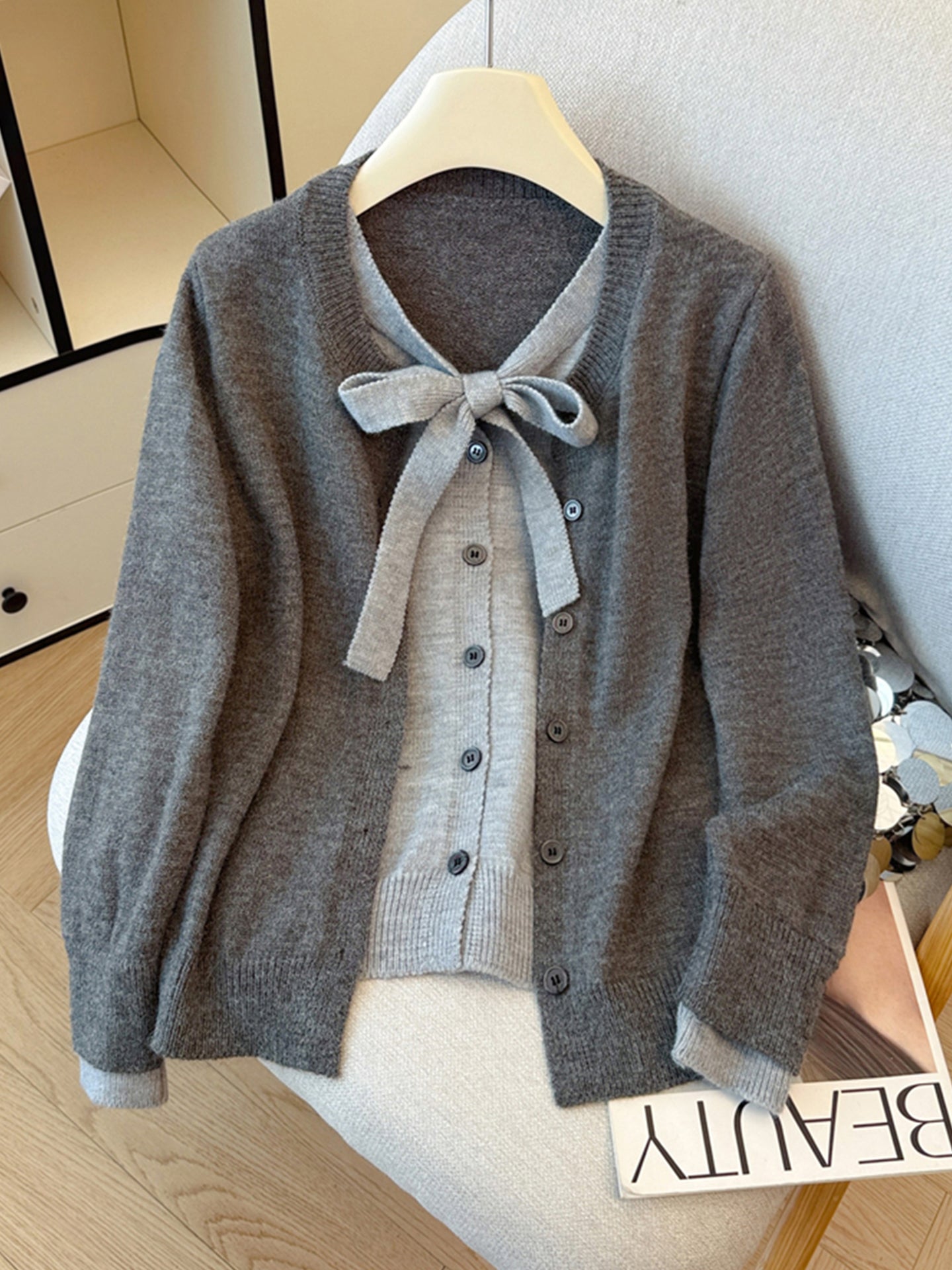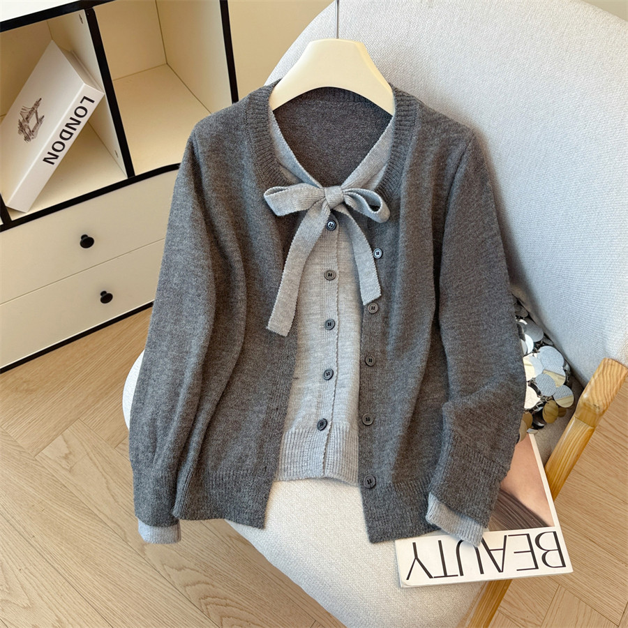 Payız və qış üçün geniş və rahat toxunma üslubda, qalstuklu, Koreya üslubunda iki hissəli sviter kardiqan.