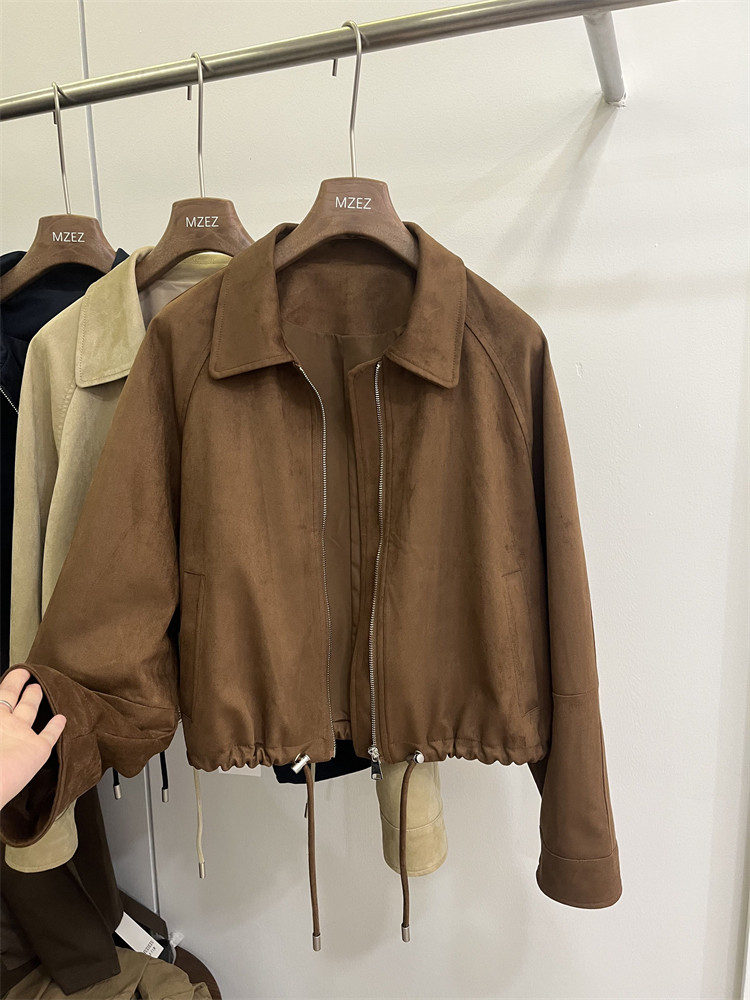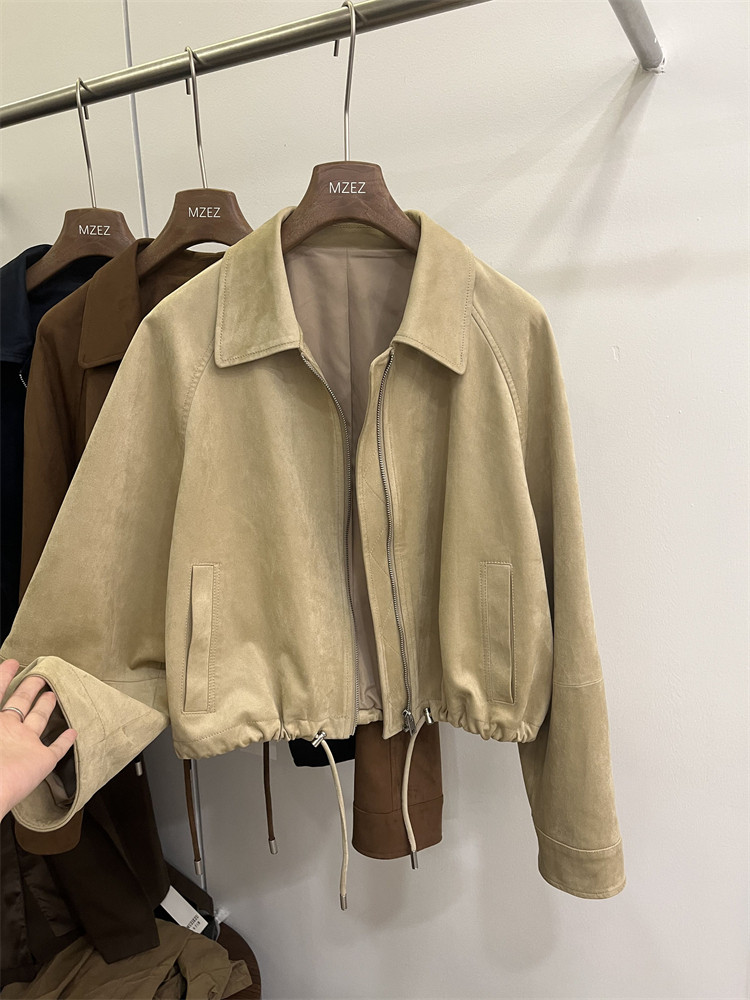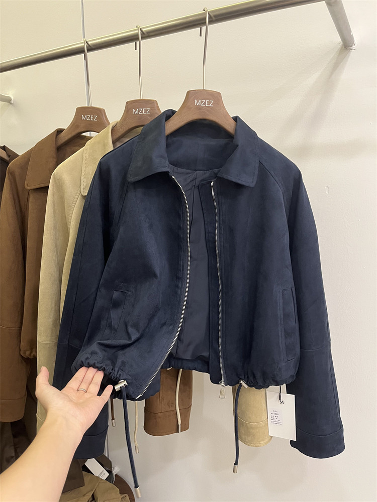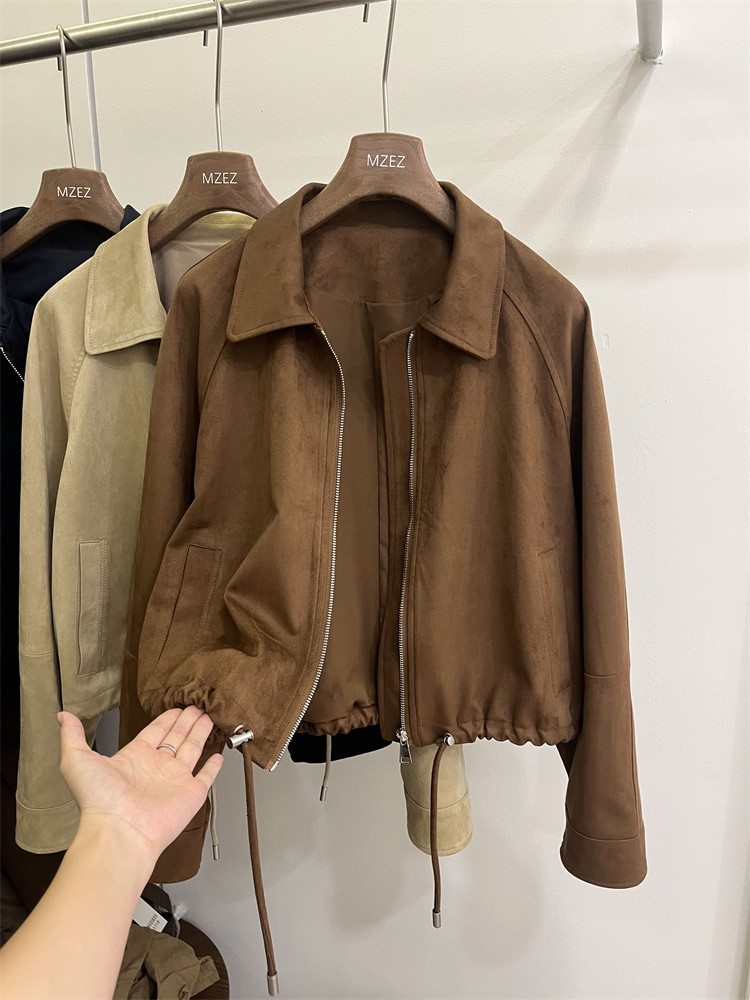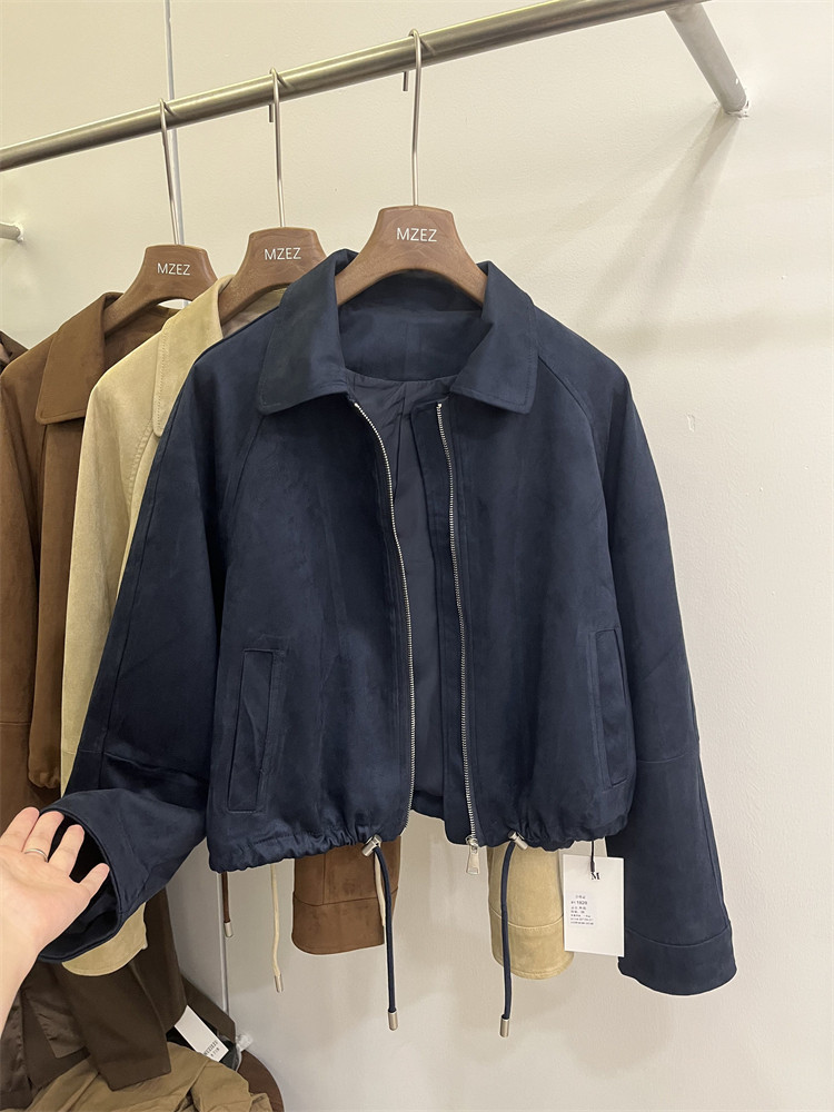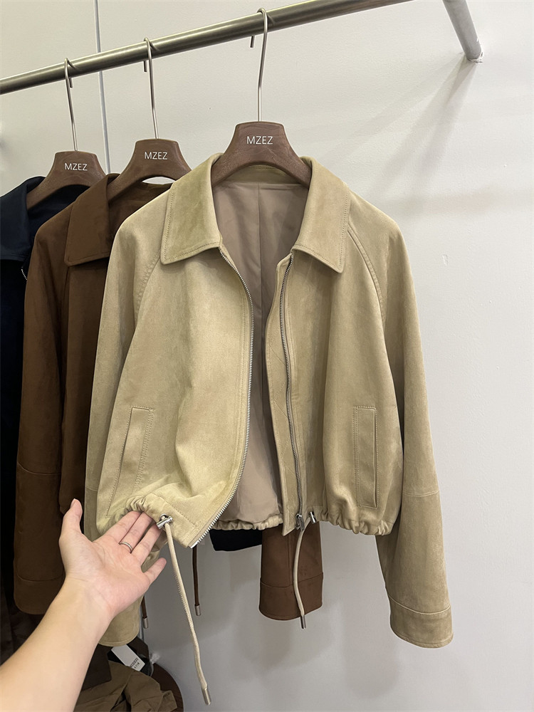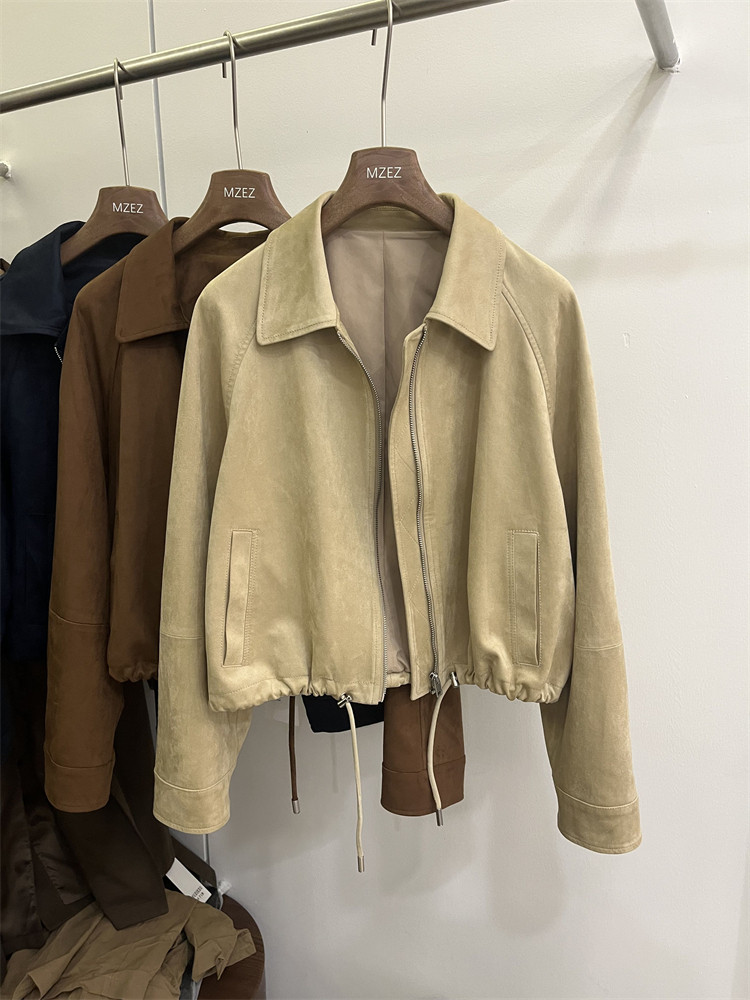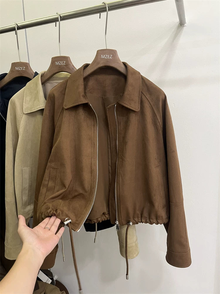 Qadın üçün qısa zamşa gödəkçə, yeni 2026 yaz, Avropa üslubunda, polo yaxası, zərif miniatür üslubda, motosiklet beysbol gödəkçəsi.