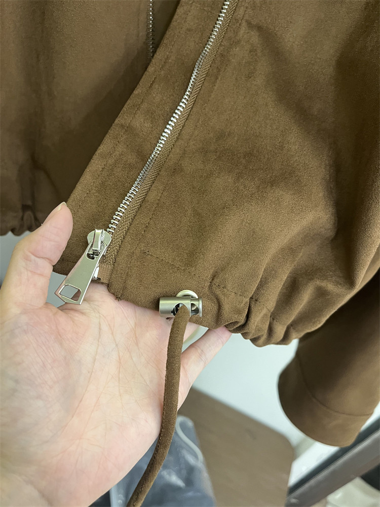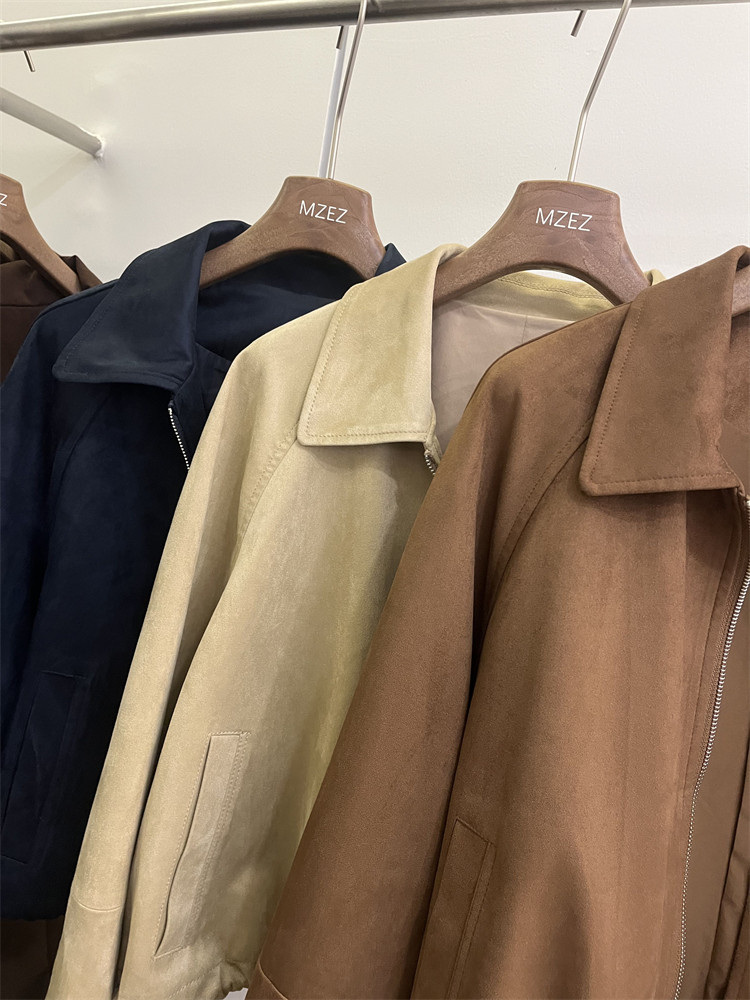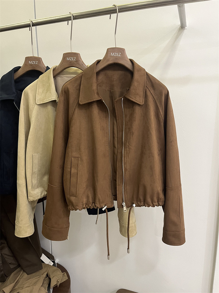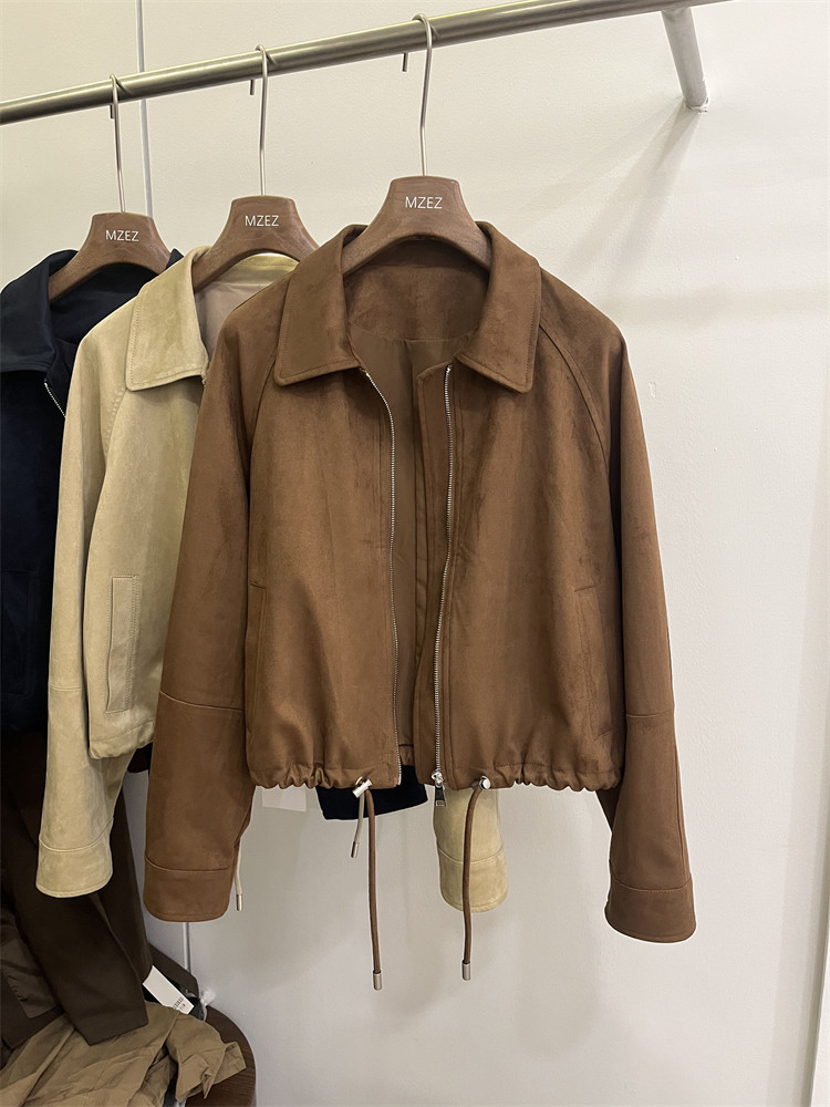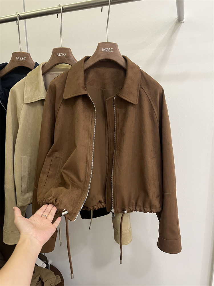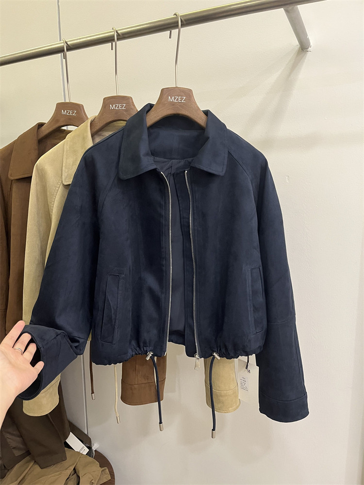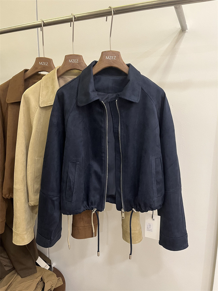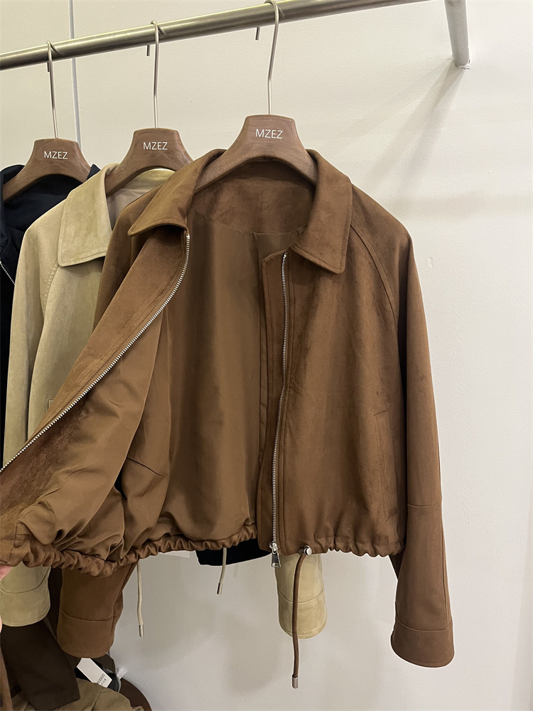 Qadın üçün qısa zamşa gödəkçə, yeni 2026 yaz, Avropa üslubunda, polo yaxası, zərif miniatür üslubda, motosiklet beysbol gödəkçəsi.