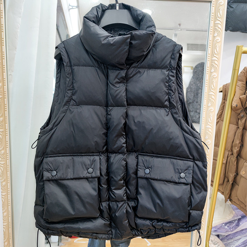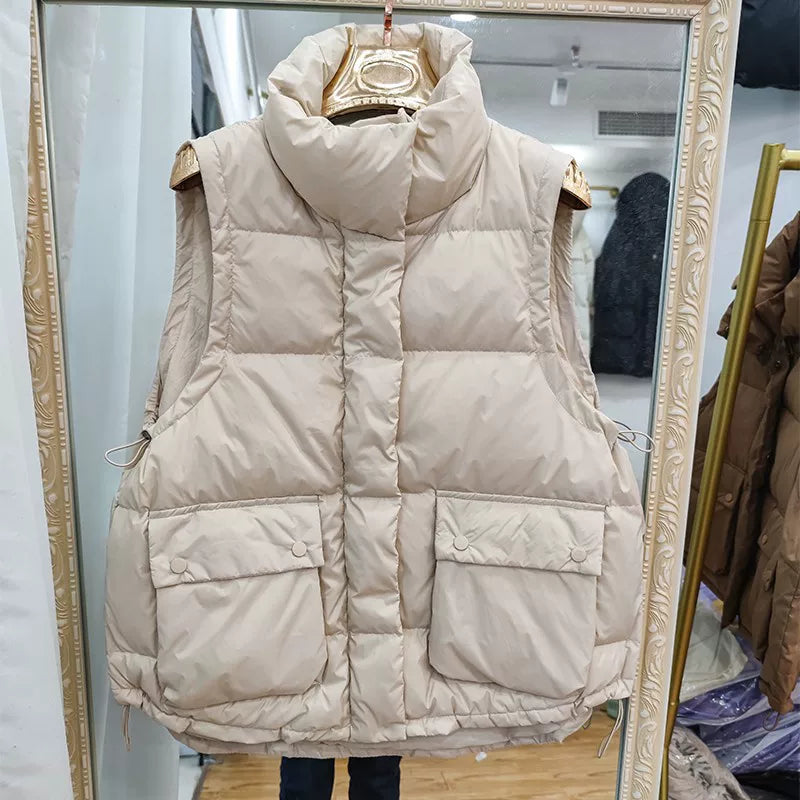 Qadınlar üçün böyük ölçülü, boş formalı, puflu gödəkçə/jilet, 2026-cı ilin payız/qış mövsümünün yeni üslubunda, böyük ölçülü qadınlar üçün dəbli və çoxfunksiyalı qolsuz puflu gödəkçə.