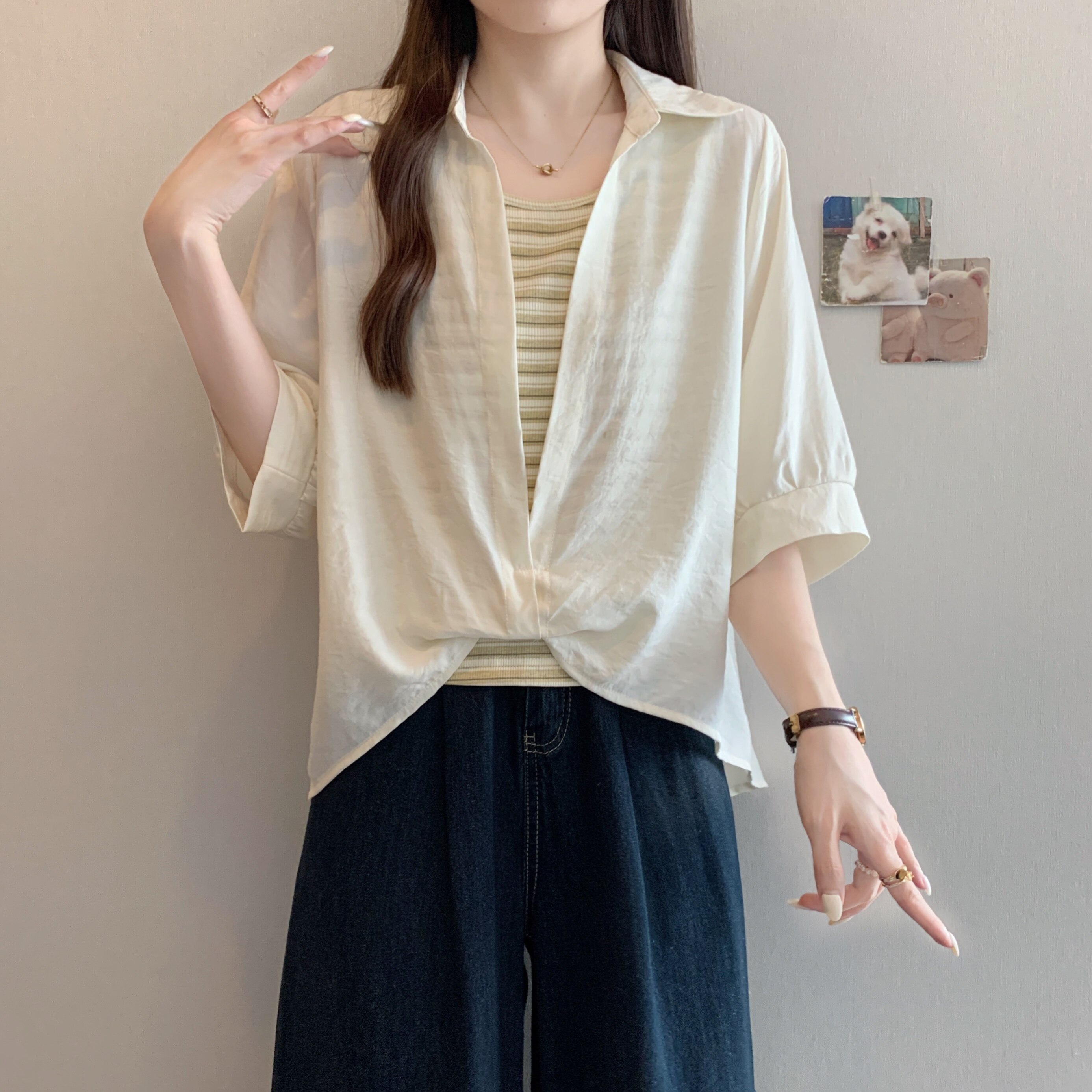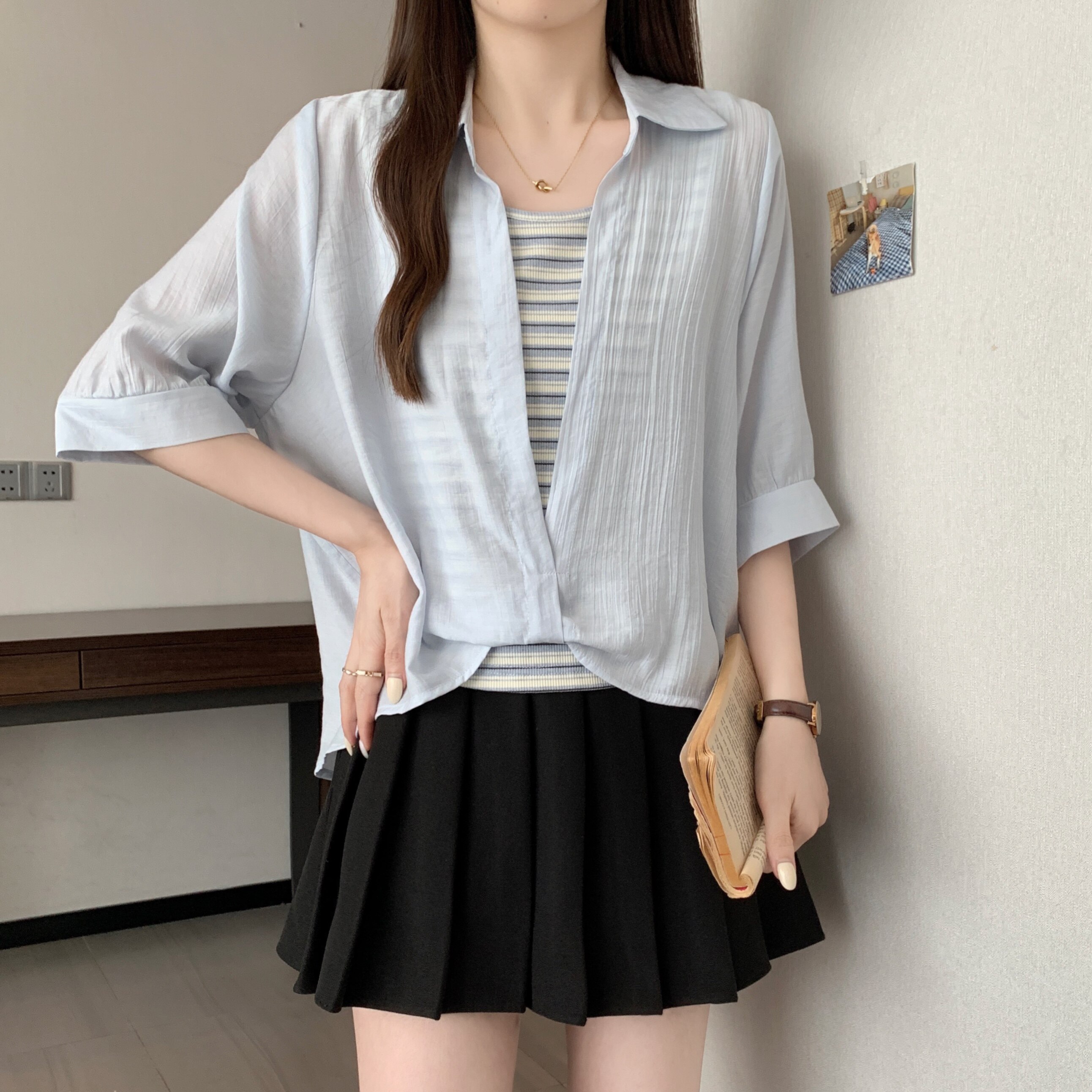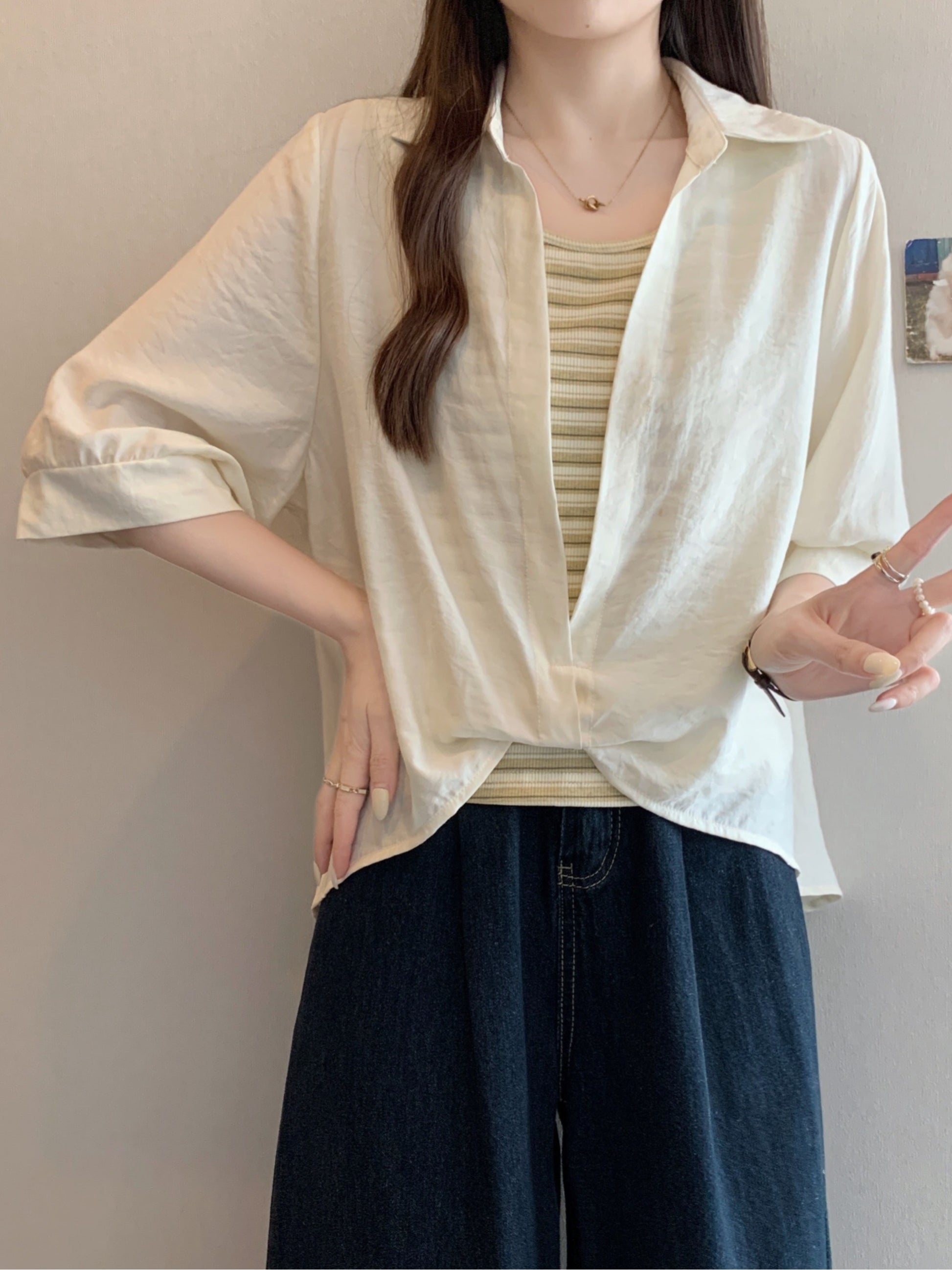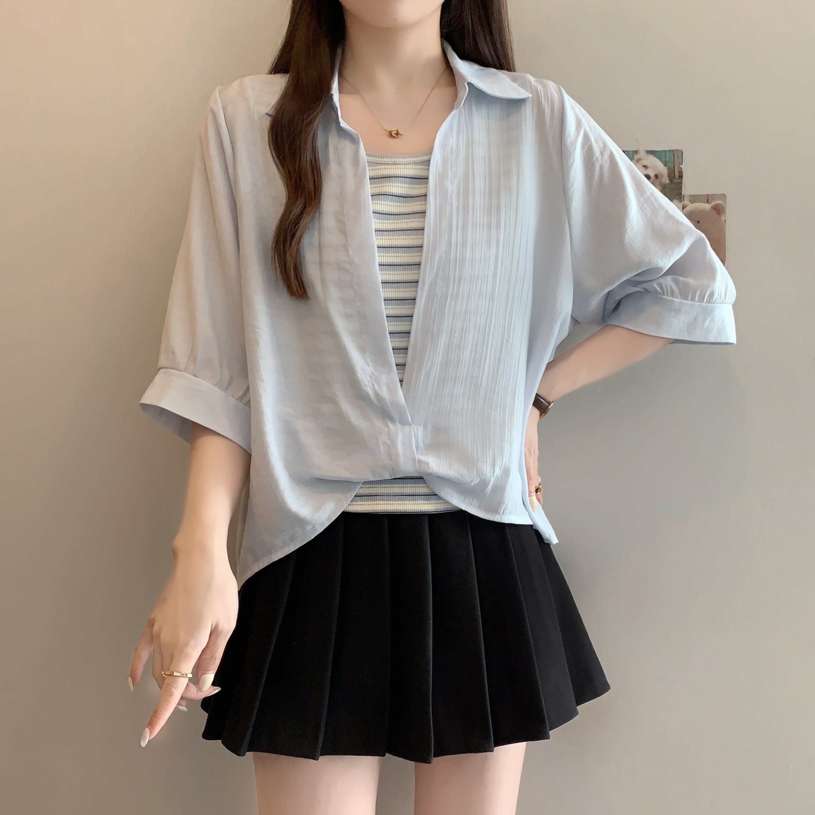 Qadınlar üçün böyük ölçülü dizaynlı, düyünlü süni iki hissəli qısaqol köynək, 2026-cı ilin yayı, geniş formalı, şık və gözəl, dəbli top.