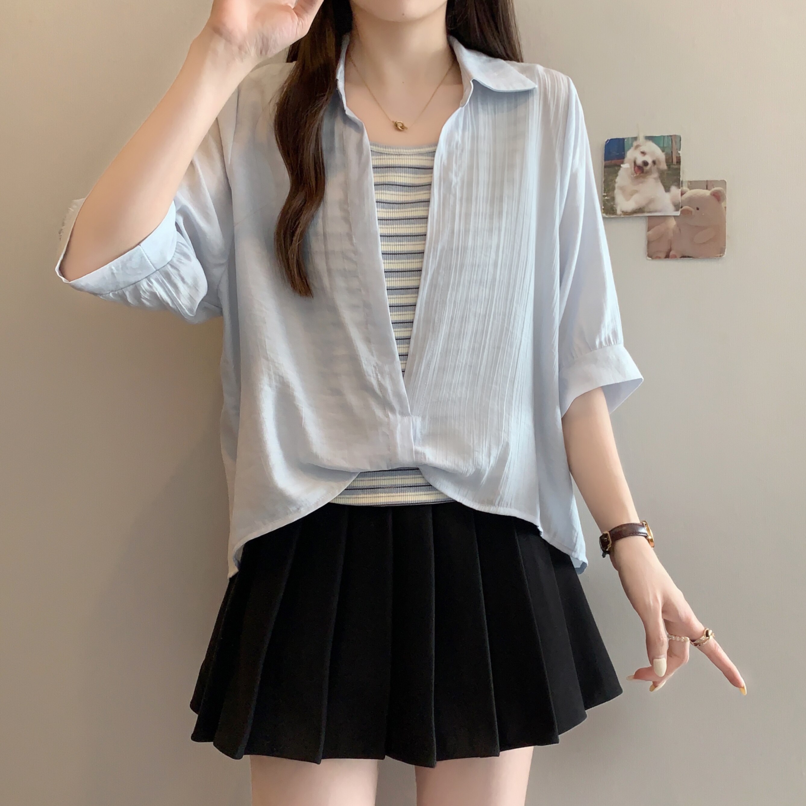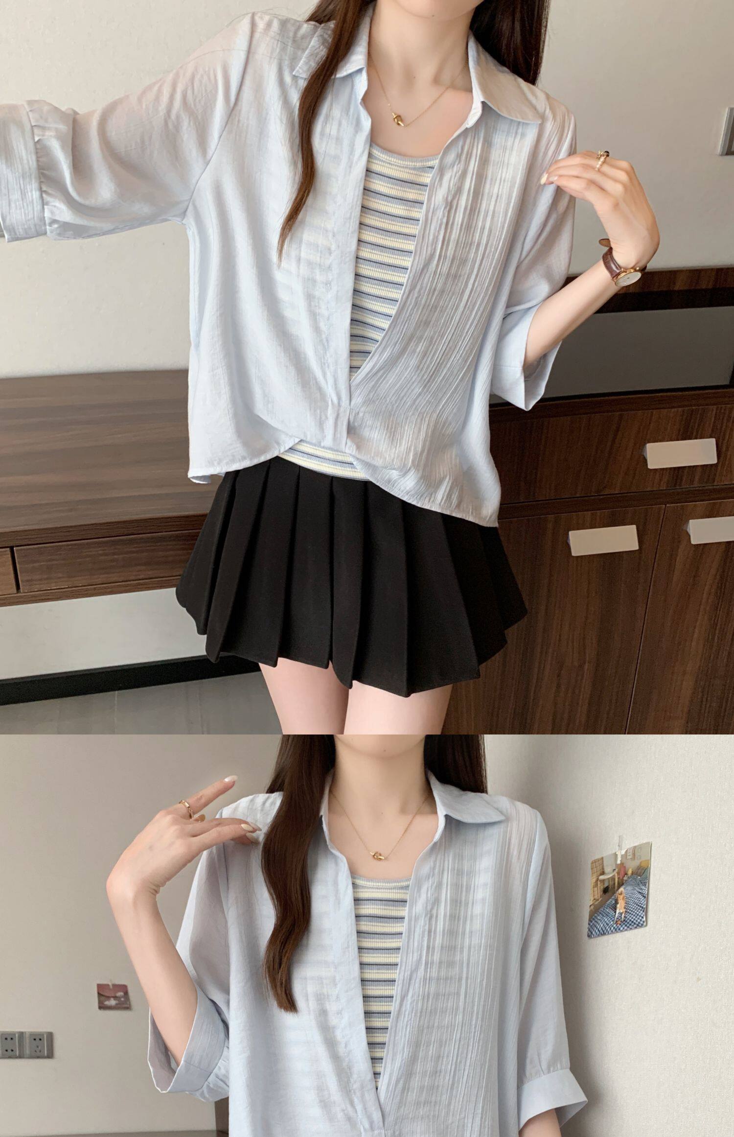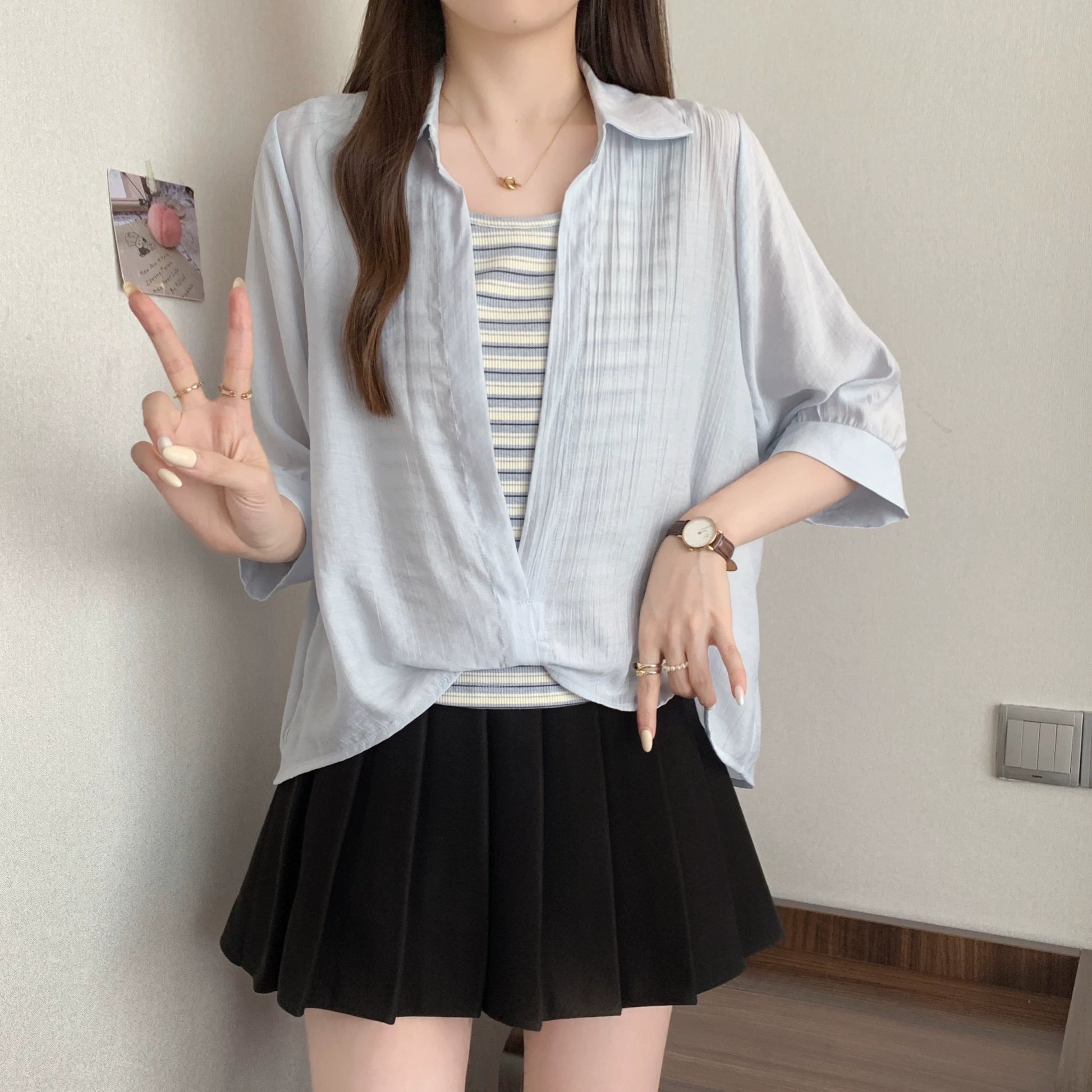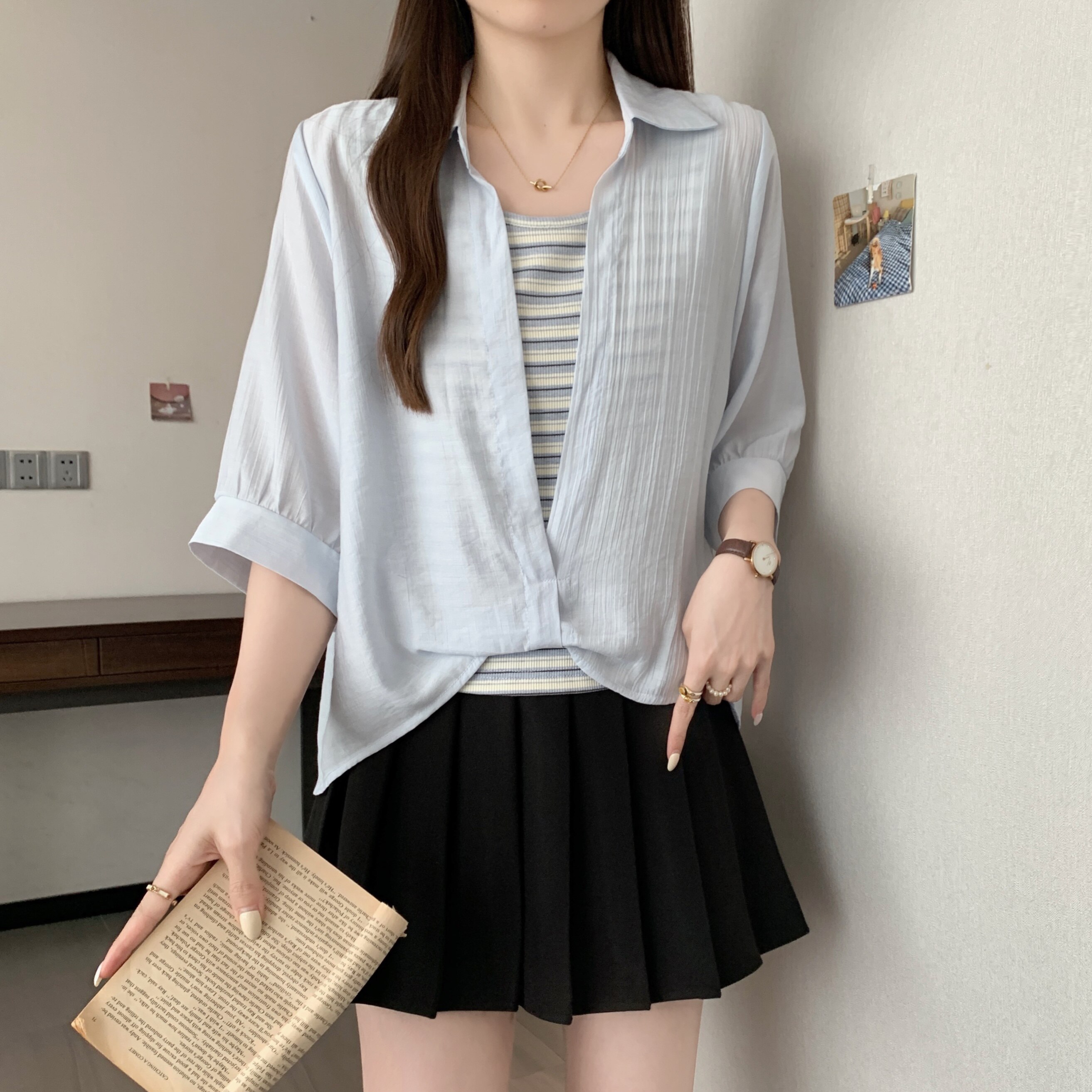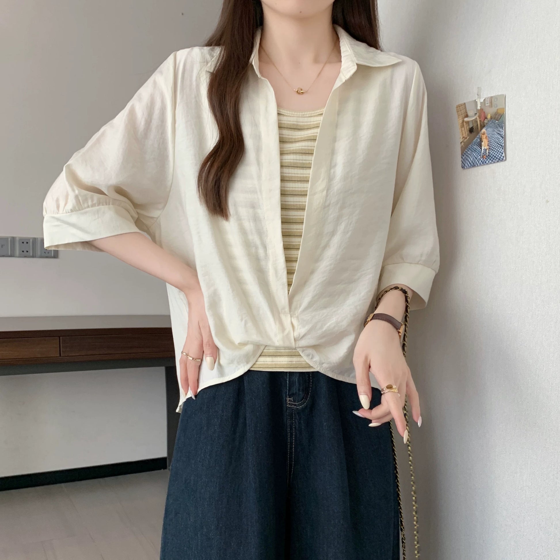 Qadınlar üçün böyük ölçülü dizaynlı, düyünlü süni iki hissəli qısaqol köynək, 2026-cı ilin yayı, geniş formalı, şık və gözəl, dəbli top.