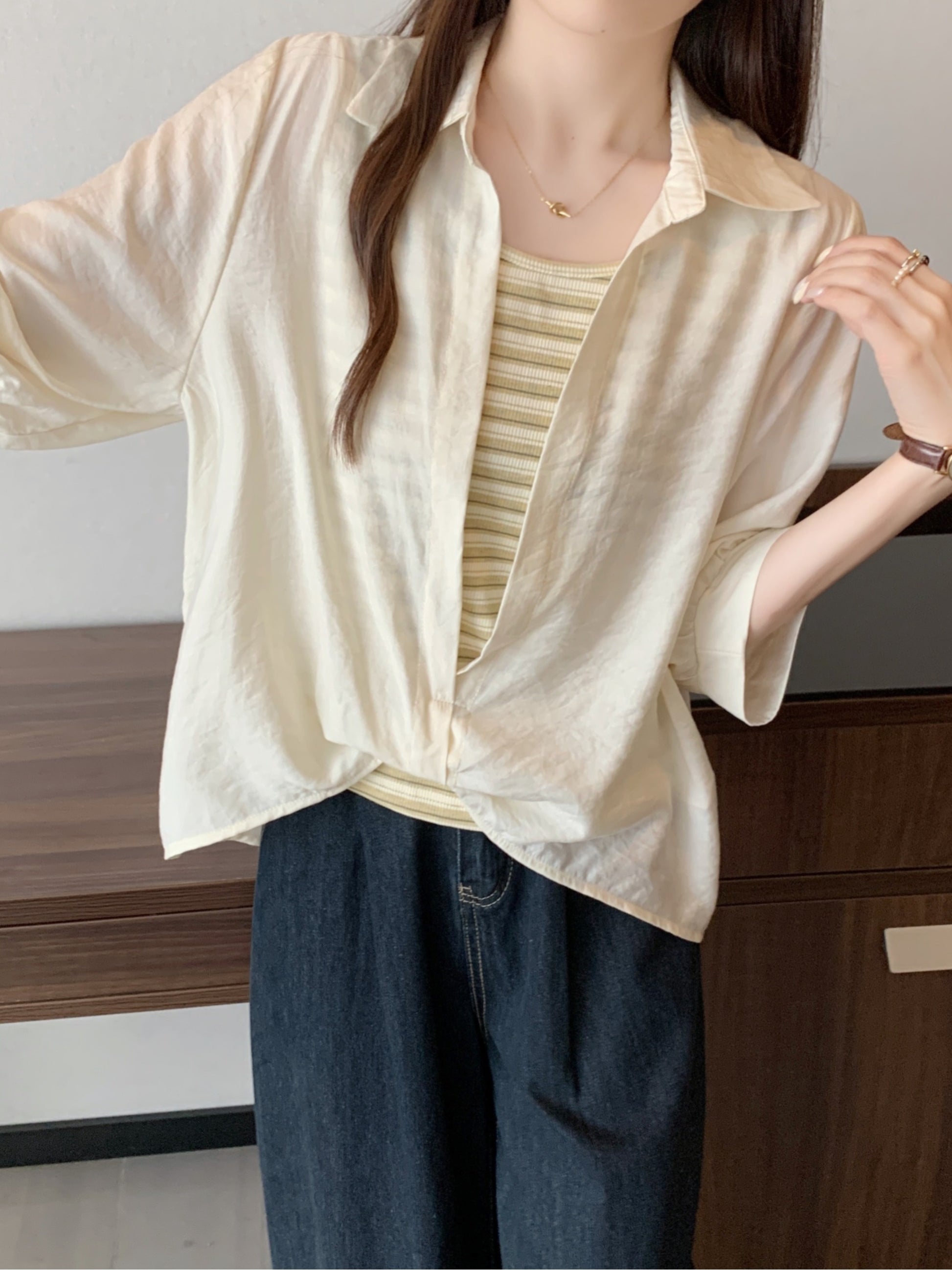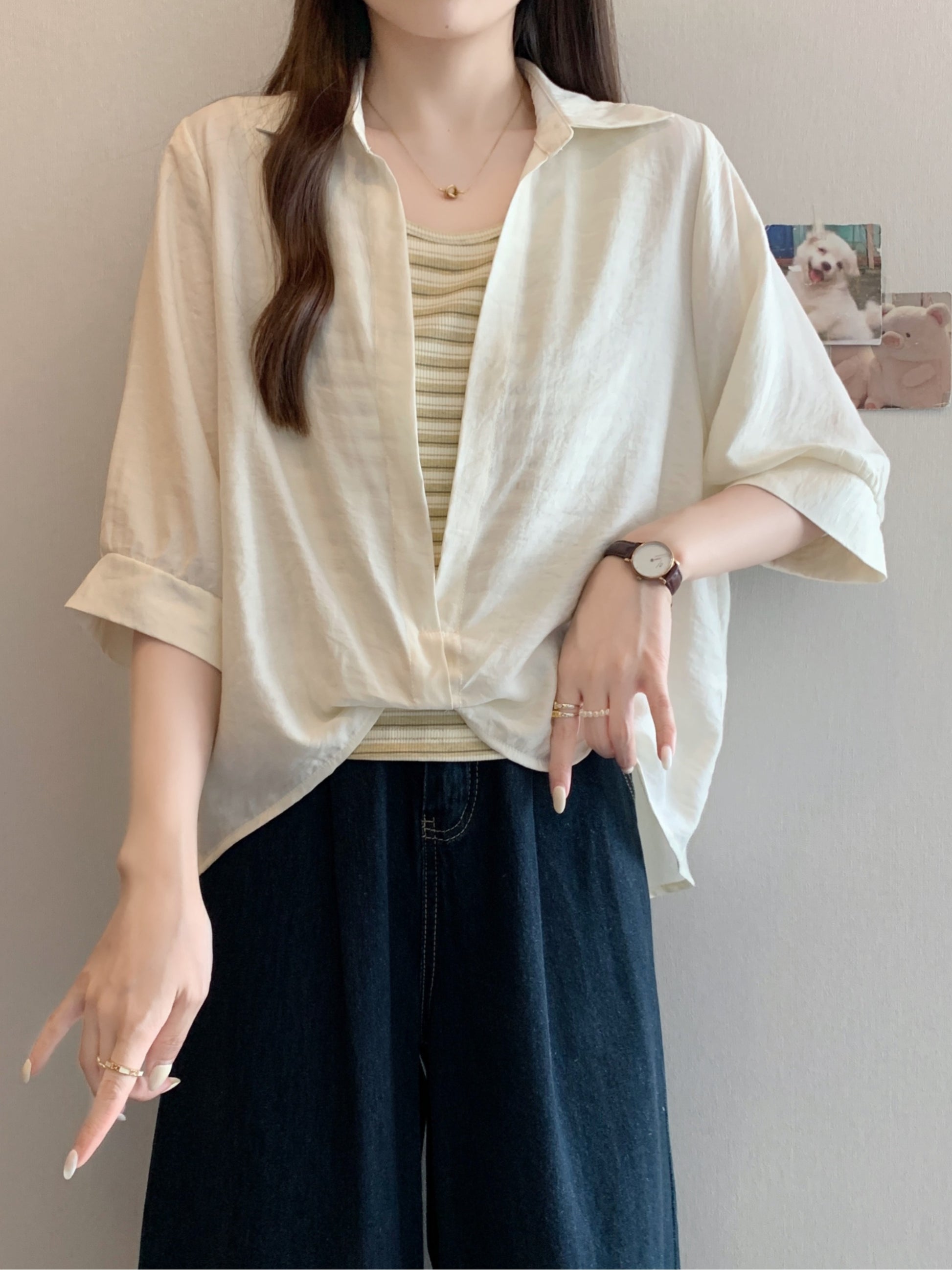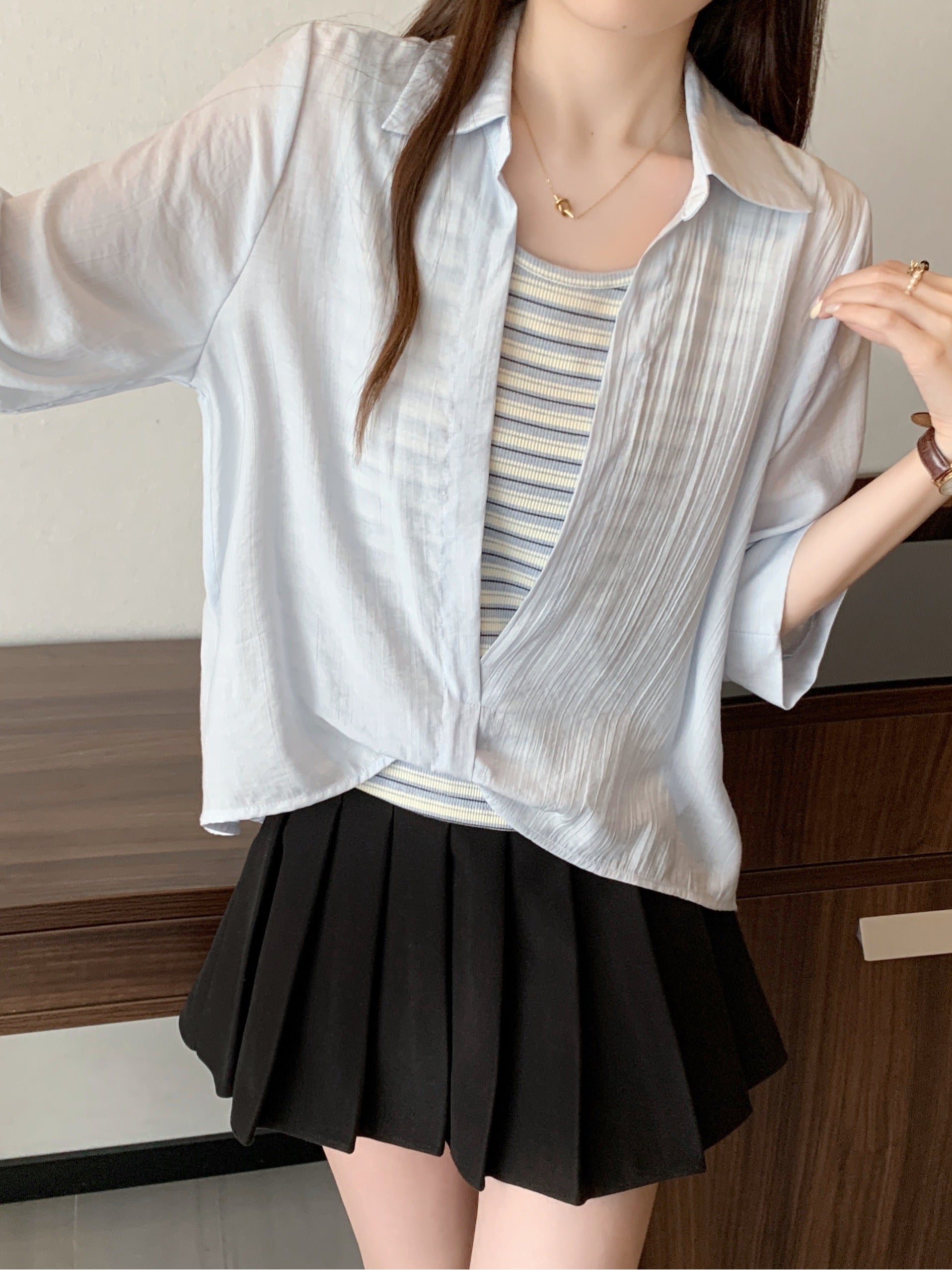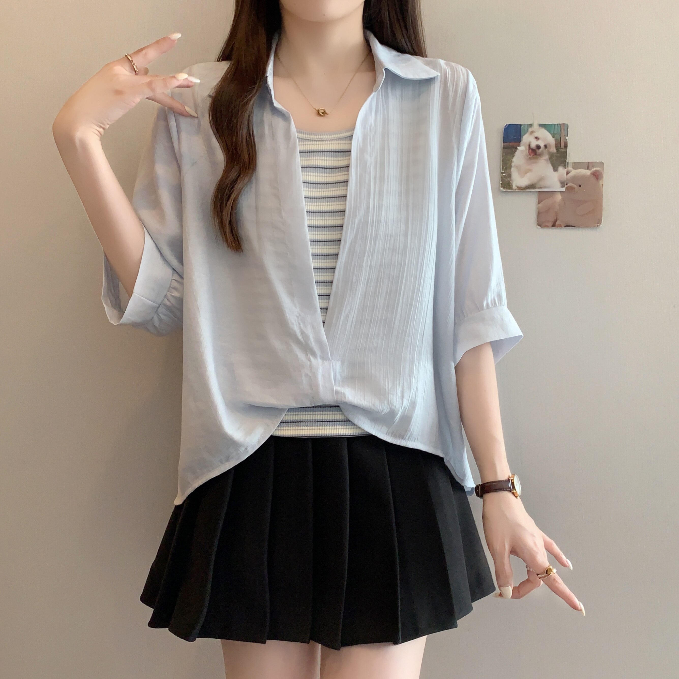 Qadınlar üçün böyük ölçülü dizaynlı, düyünlü süni iki hissəli qısaqol köynək, 2026-cı ilin yayı, geniş formalı, şık və gözəl, dəbli top.