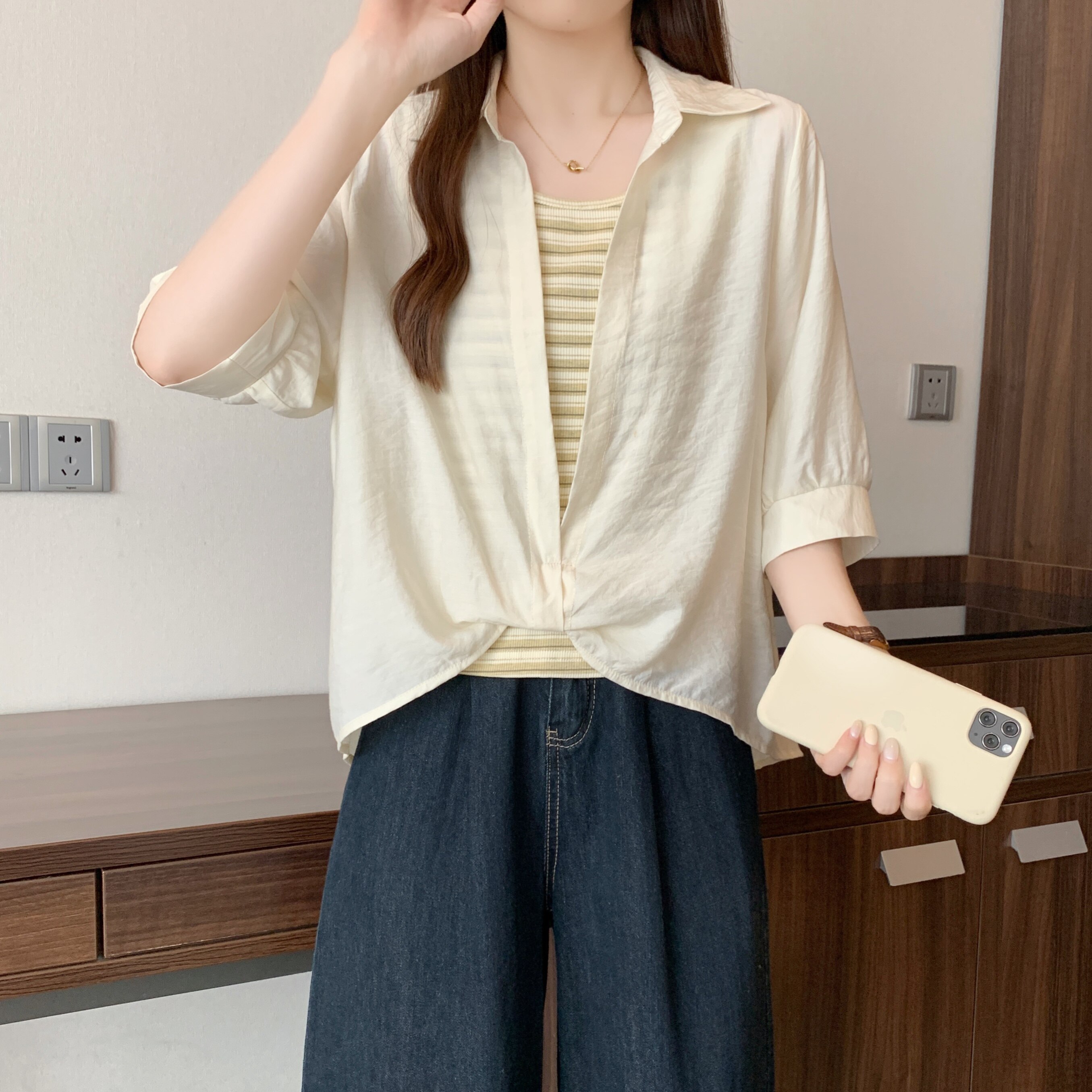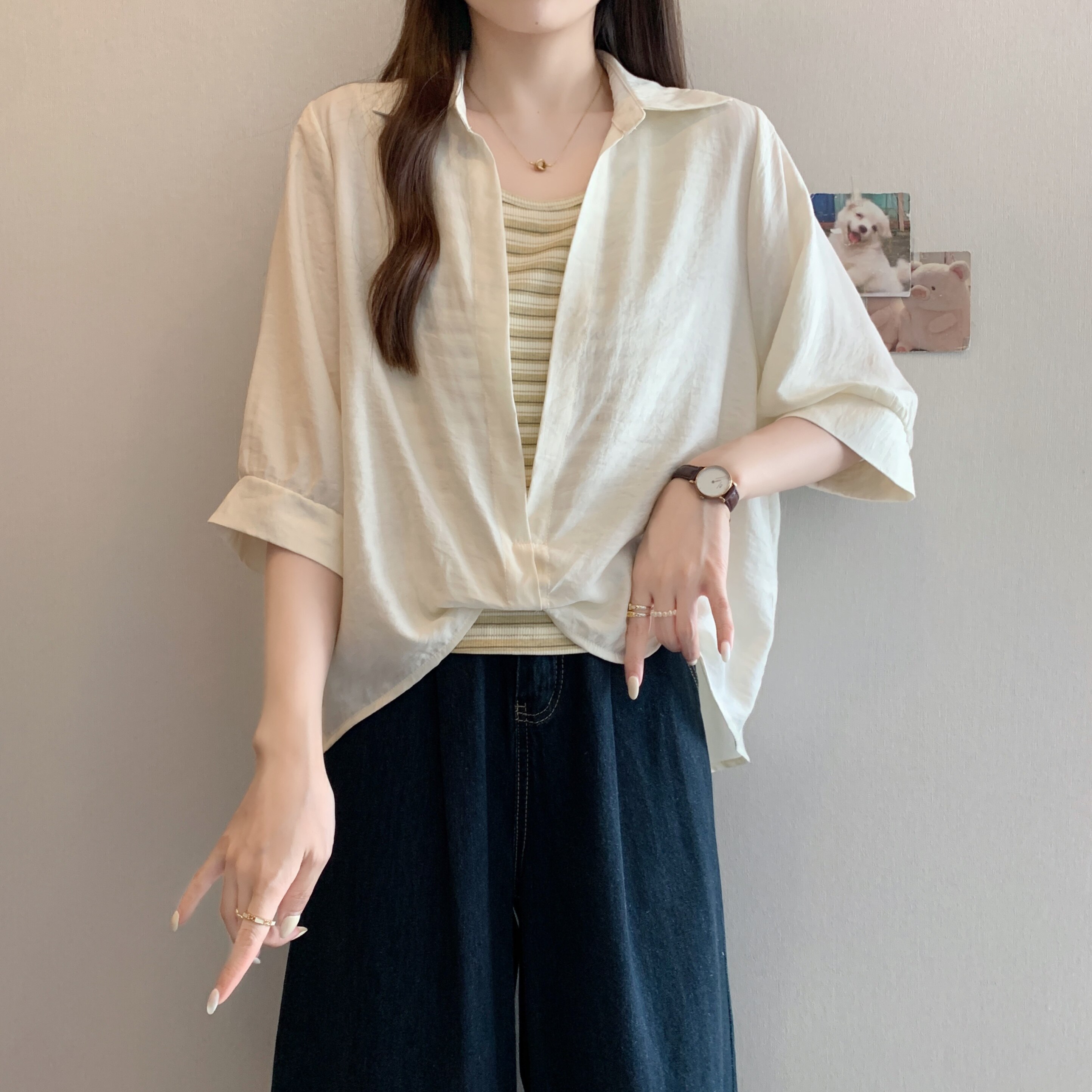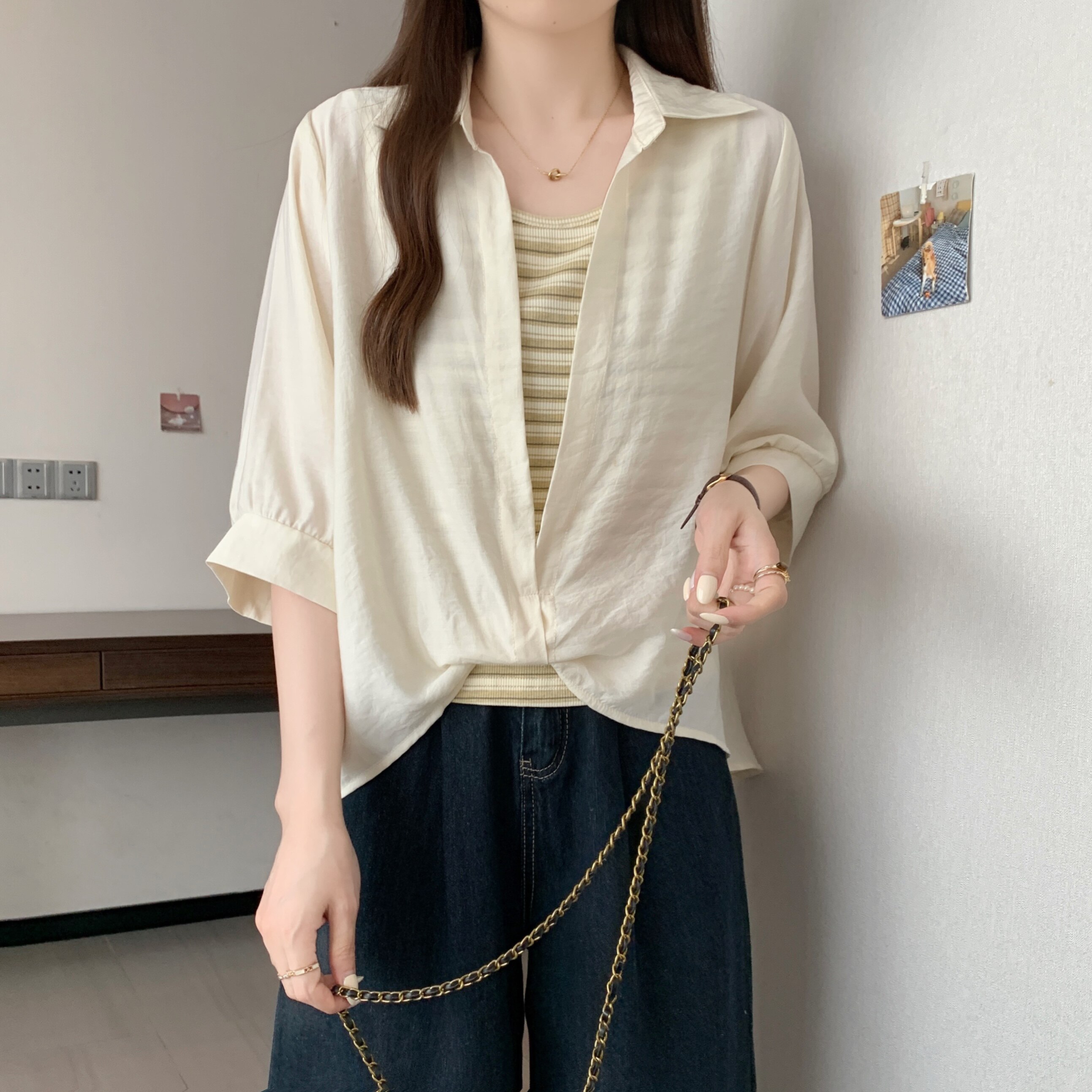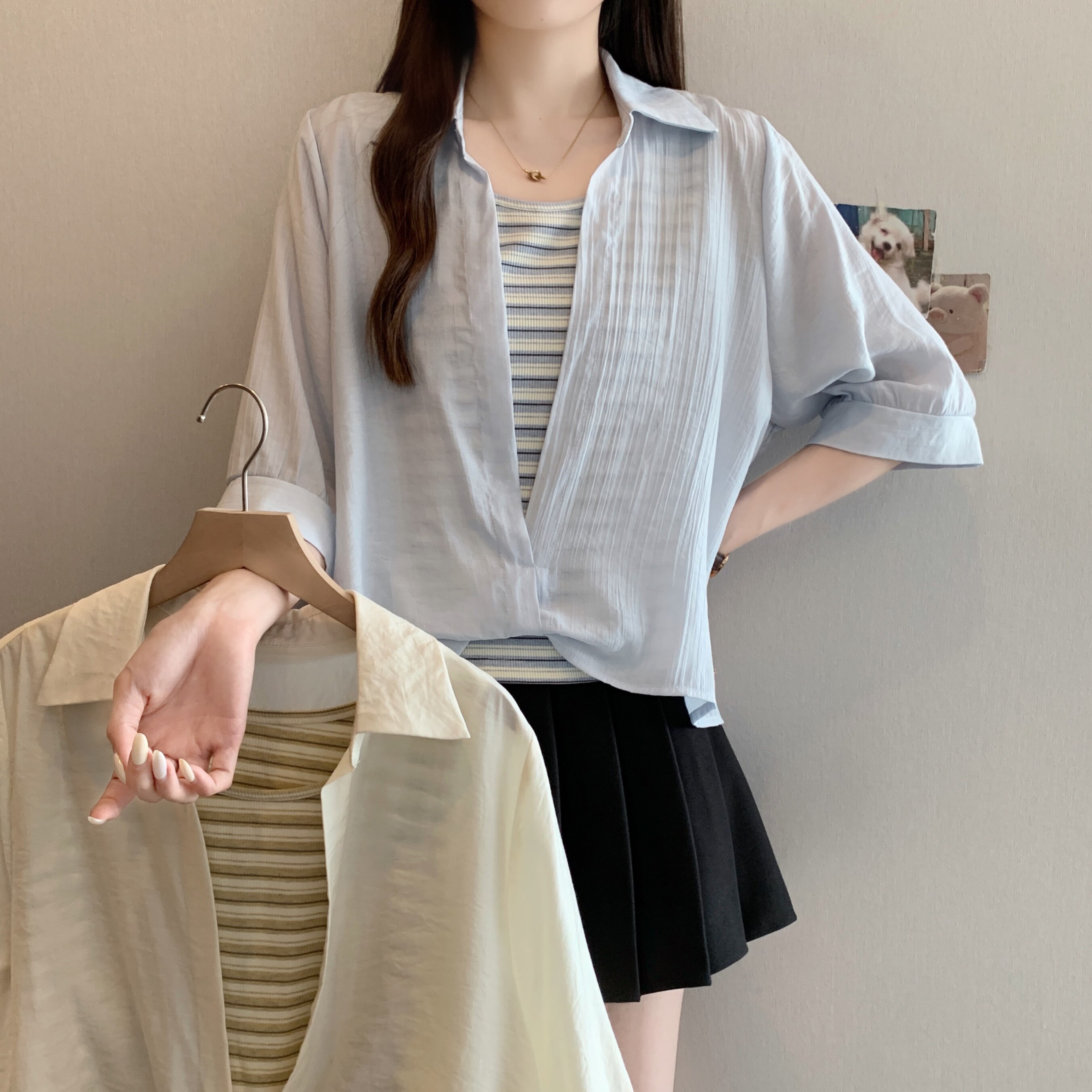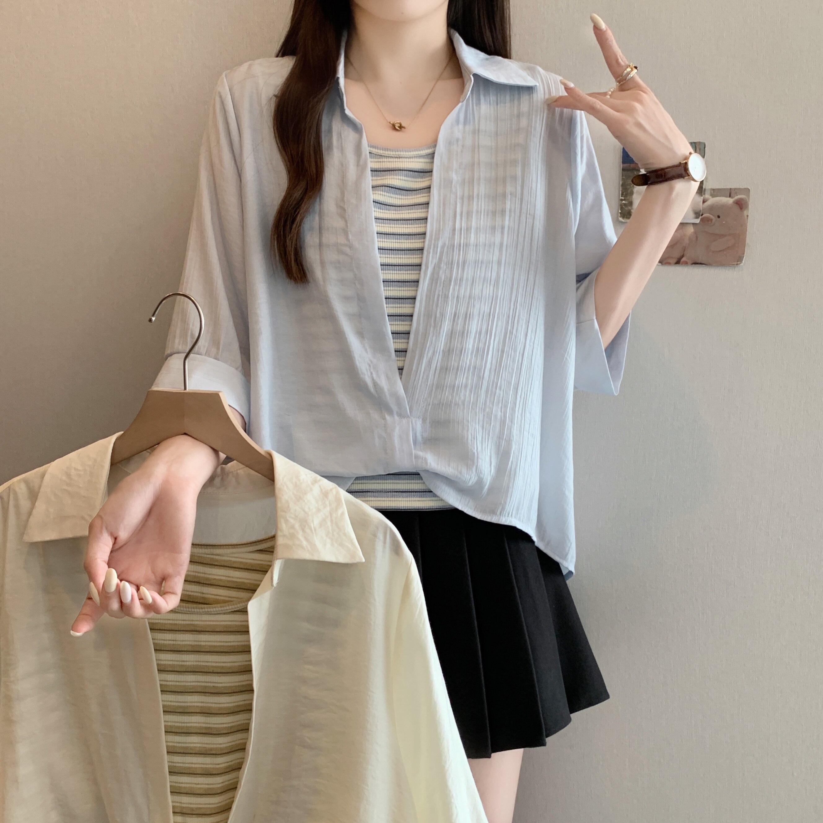 Qadınlar üçün böyük ölçülü dizaynlı, düyünlü süni iki hissəli qısaqol köynək, 2026-cı ilin yayı, geniş formalı, şık və gözəl, dəbli top.