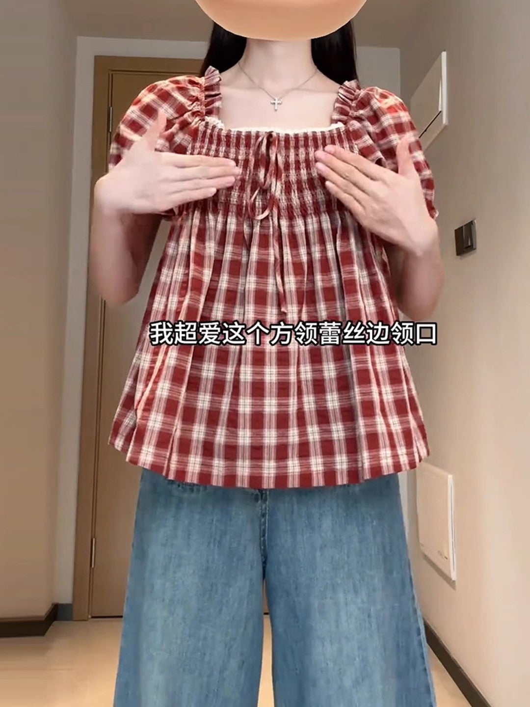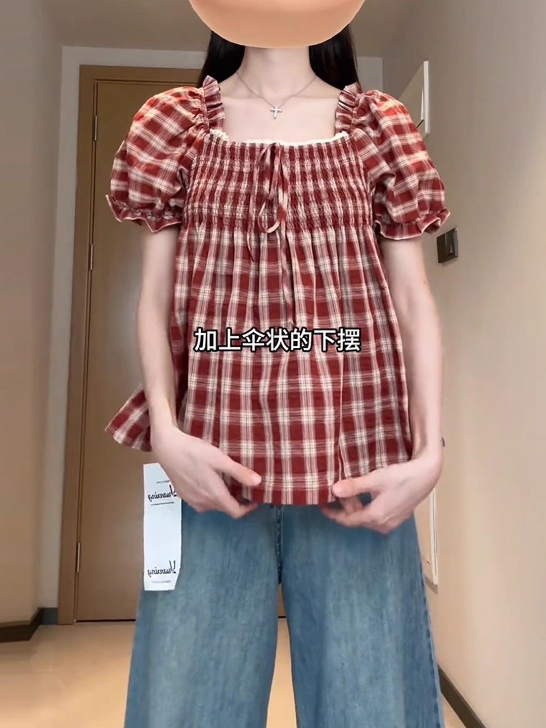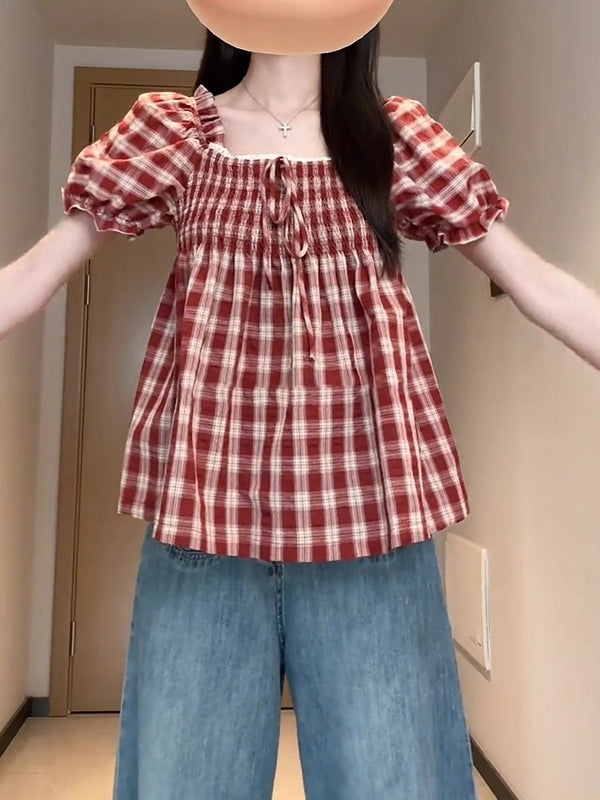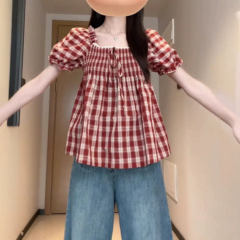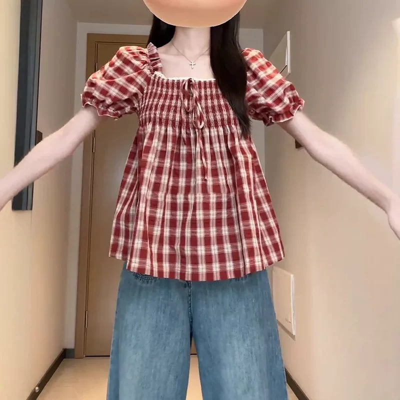 Qadınlar üçün böyük ölçülü Fransız retro kvadrat yaxalı, şirin dama-dama qısaqol köynək, böyük ölçülü qadınlar üçün yay arıqlama üçün büzməli top, gənc və yaraşıqlı.