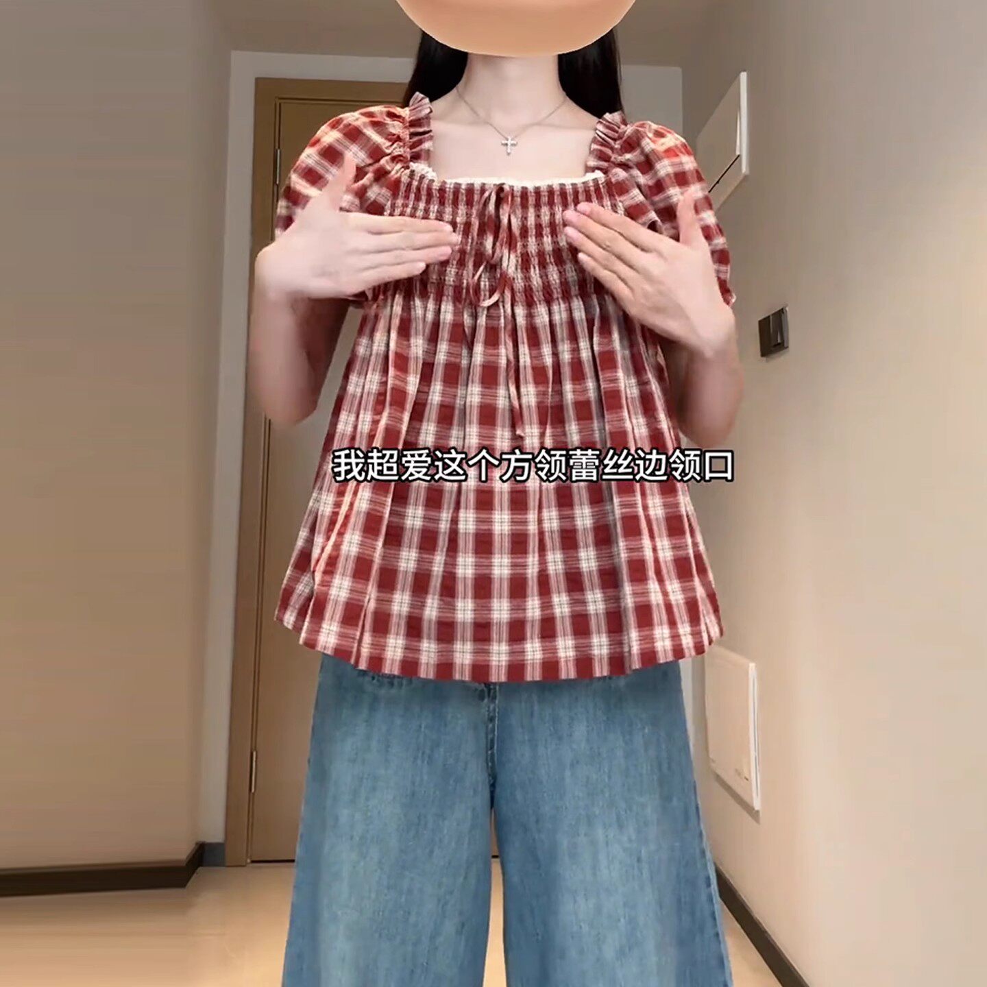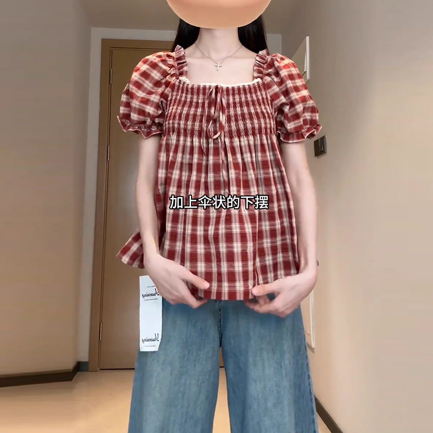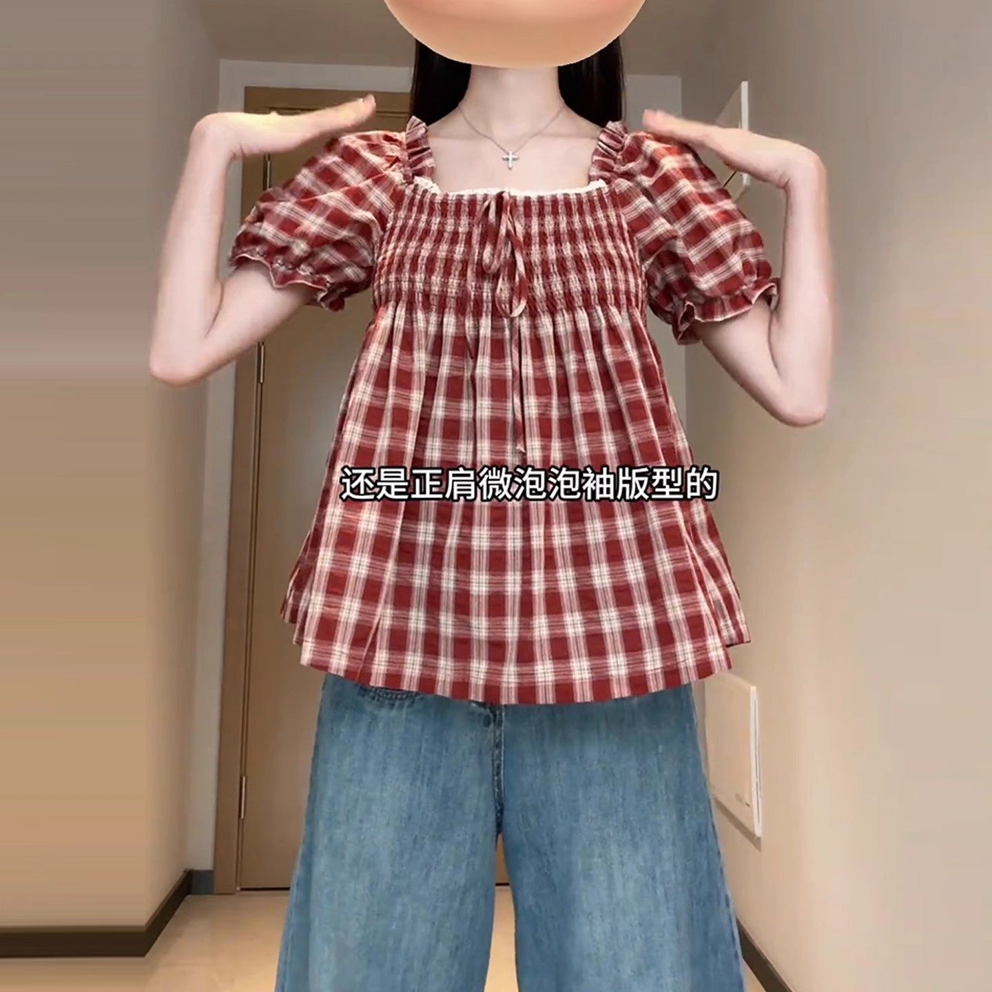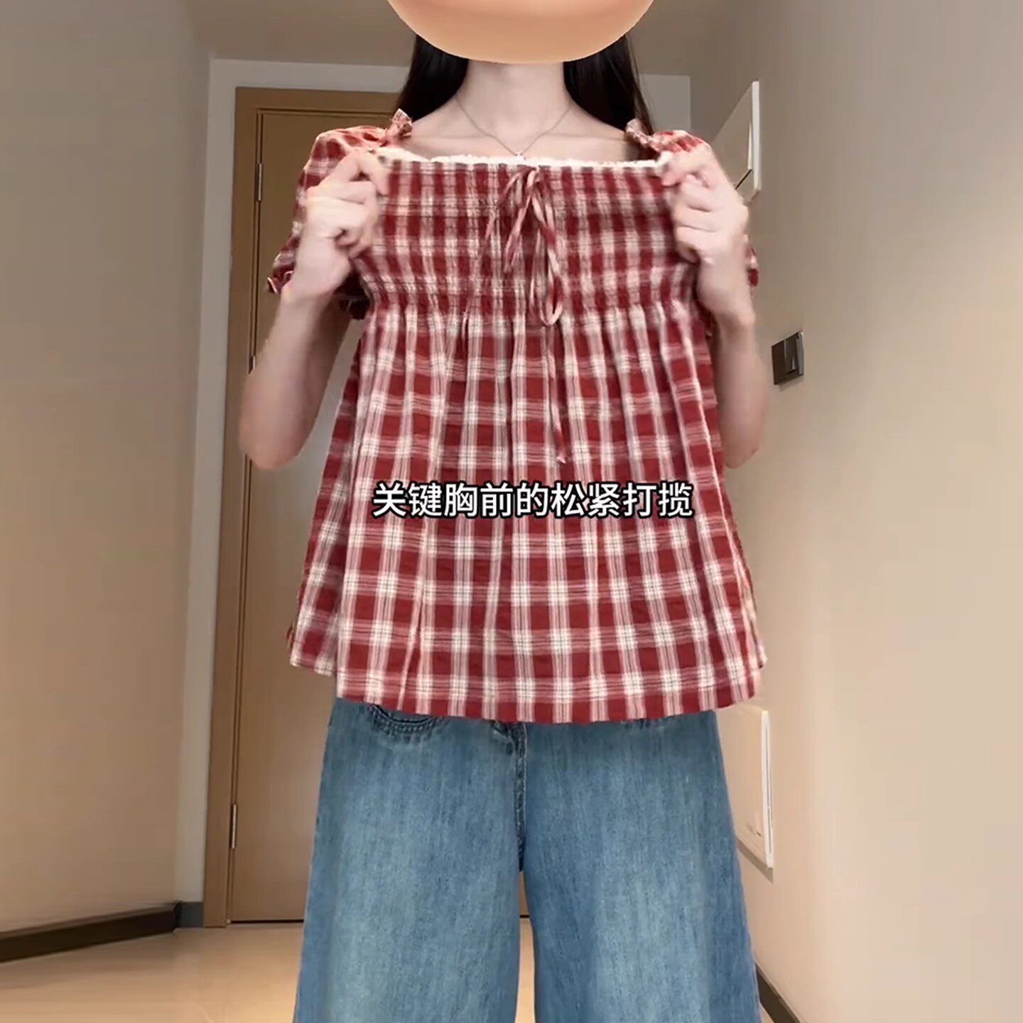 Qadınlar üçün böyük ölçülü Fransız retro kvadrat yaxalı, şirin dama-dama qısaqol köynək, böyük ölçülü qadınlar üçün yay arıqlama üçün büzməli top, gənc və yaraşıqlı.