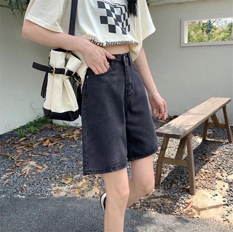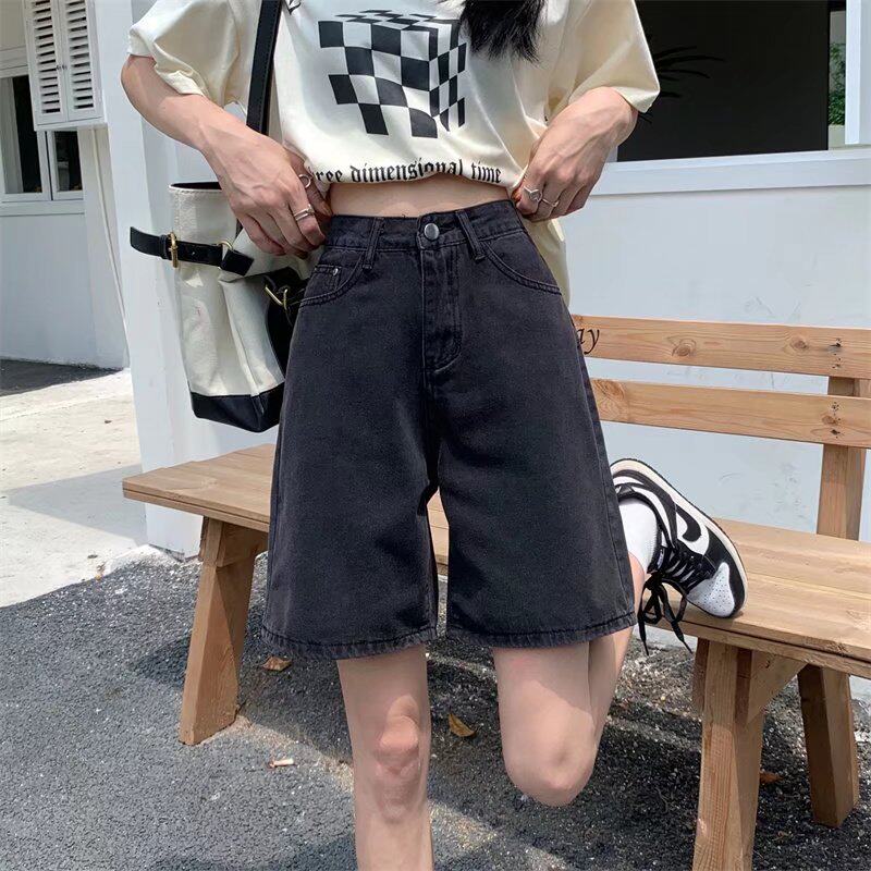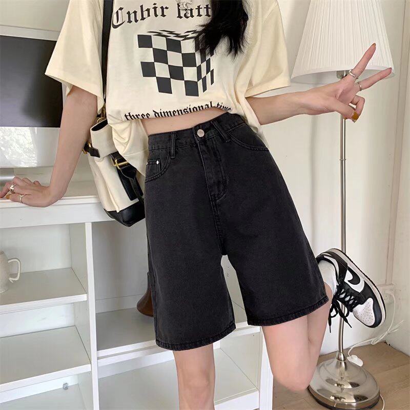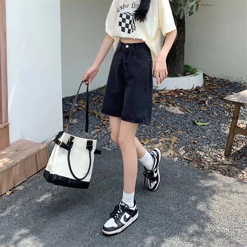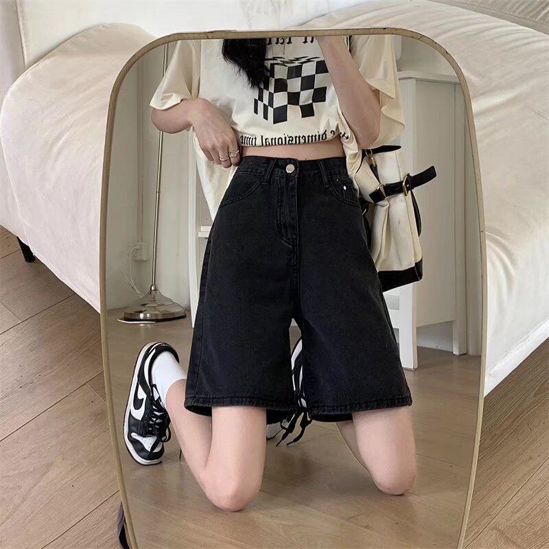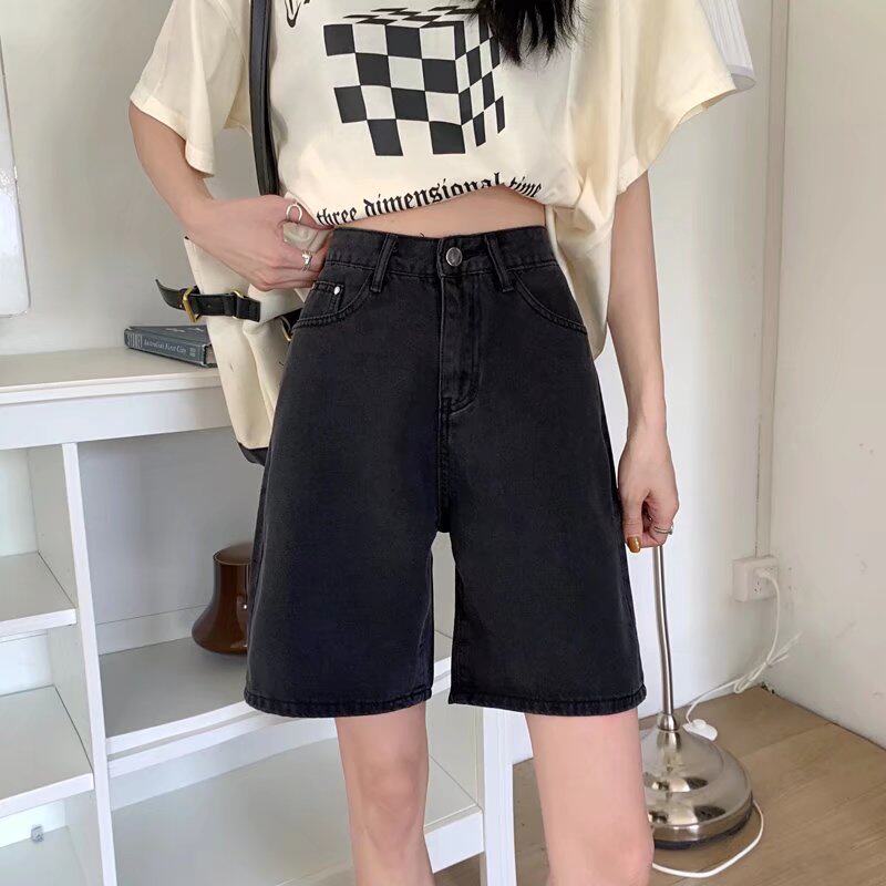 Qadınlar üçün böyük ölçülü qara qısa denim şortlar, yay üçün mükəmməl, yaraşıqlı armud formalı fiqurlar, yüksək belli, geniş bədən quruluşlu, düz ayaqlı stil.