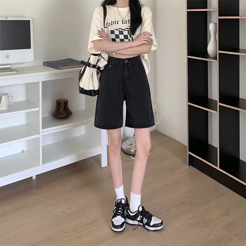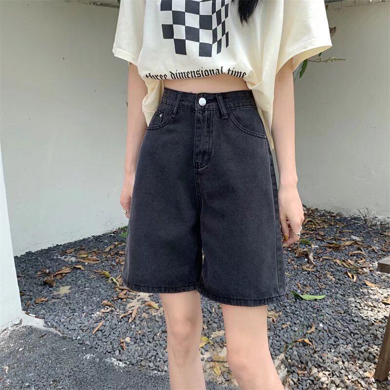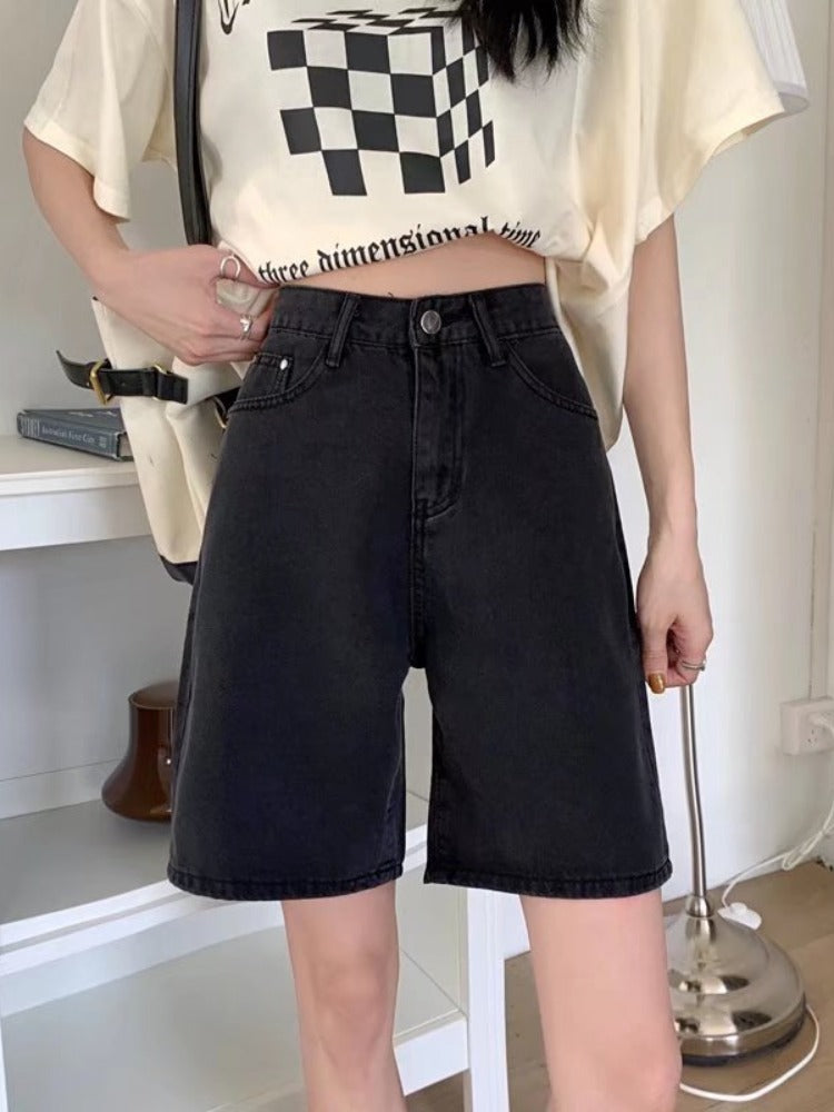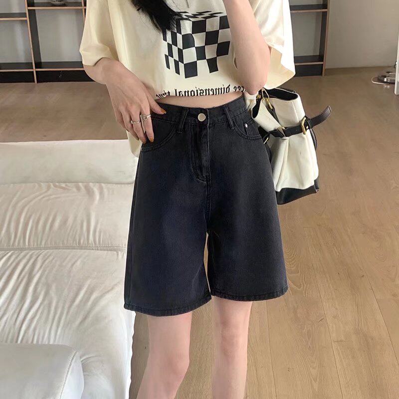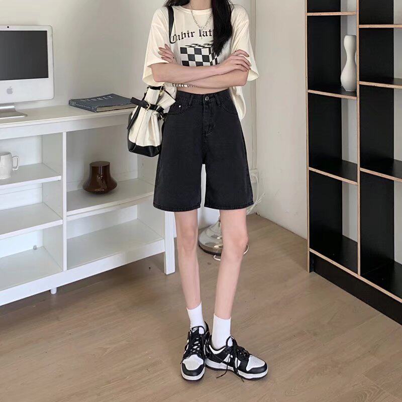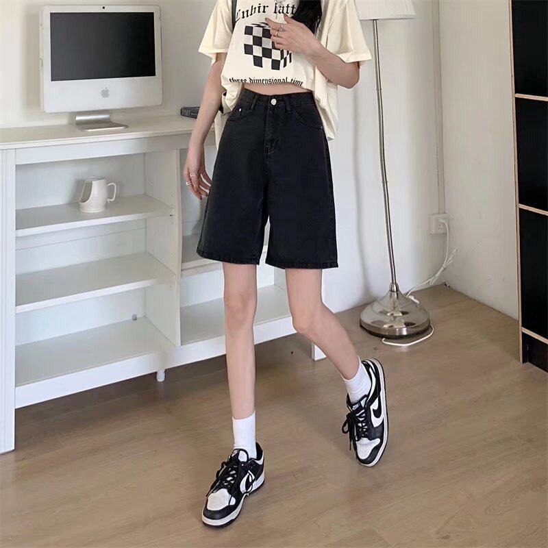 Qadınlar üçün böyük ölçülü qara qısa denim şortlar, yay üçün mükəmməl, yaraşıqlı armud formalı fiqurlar, yüksək belli, geniş bədən quruluşlu, düz ayaqlı stil.