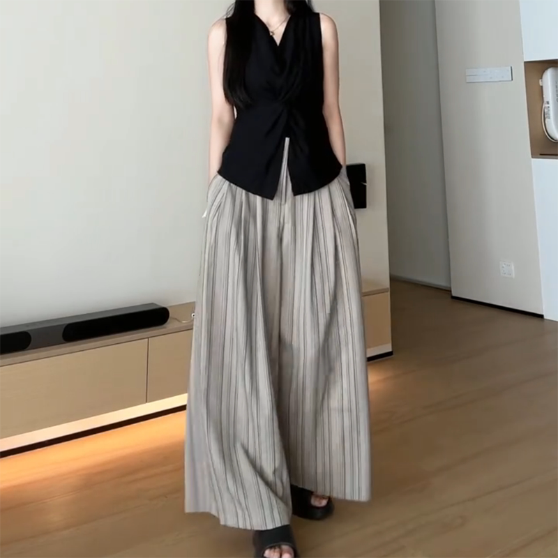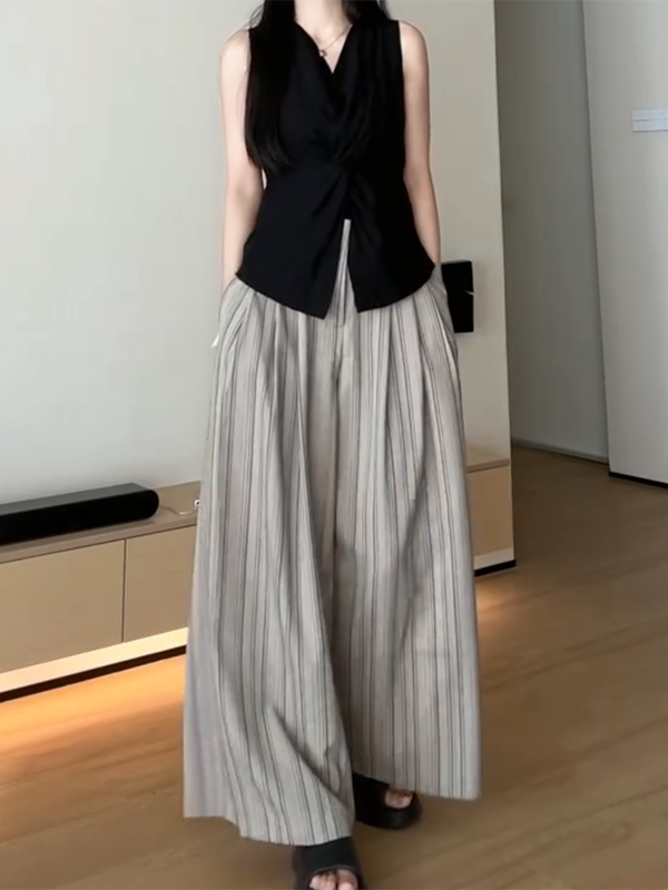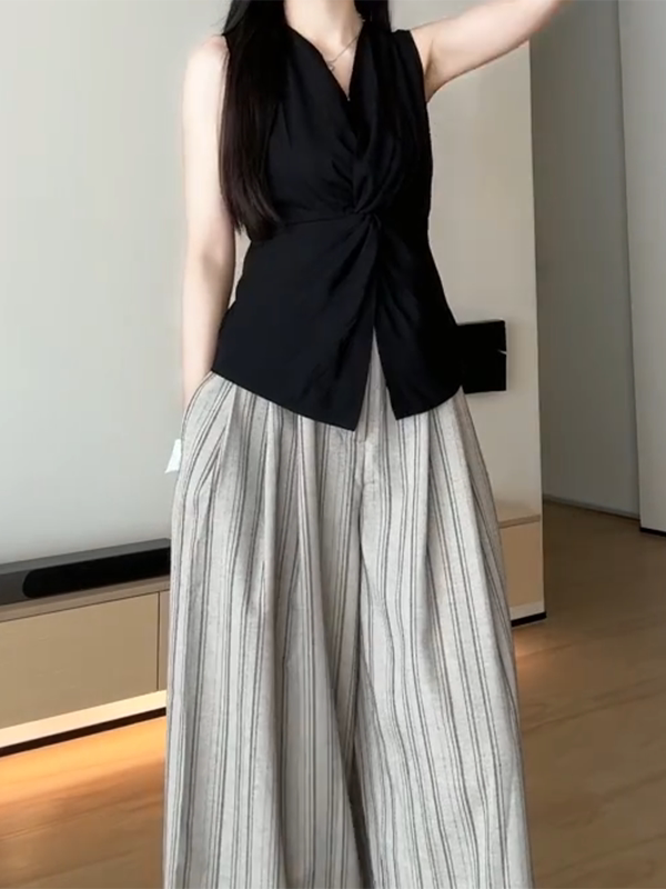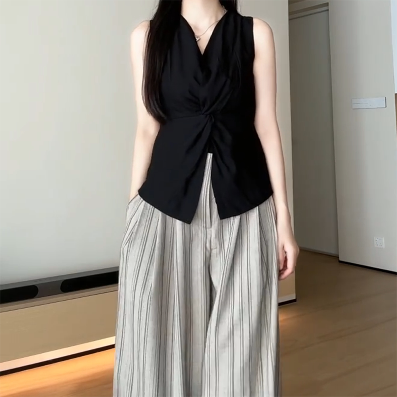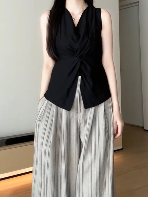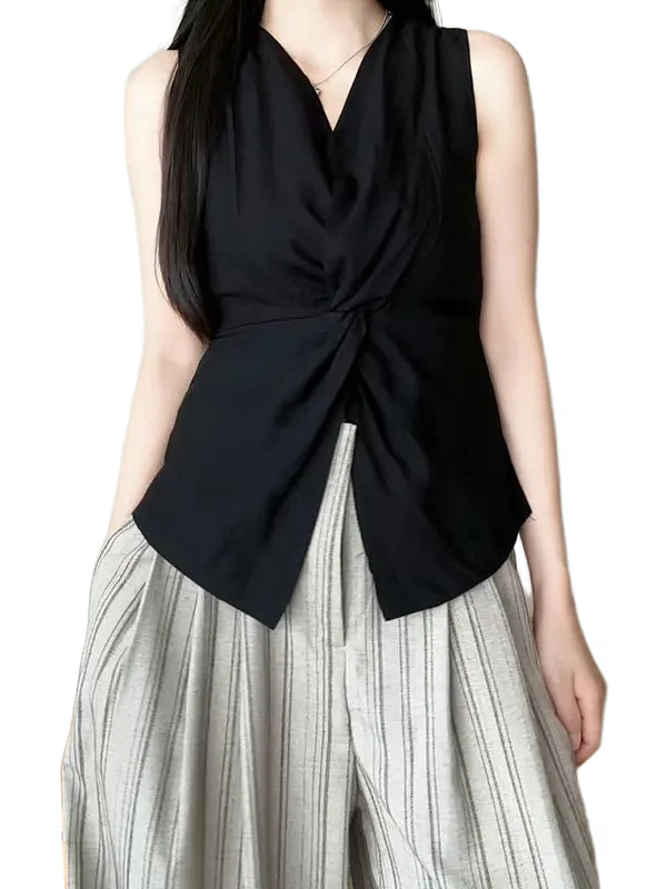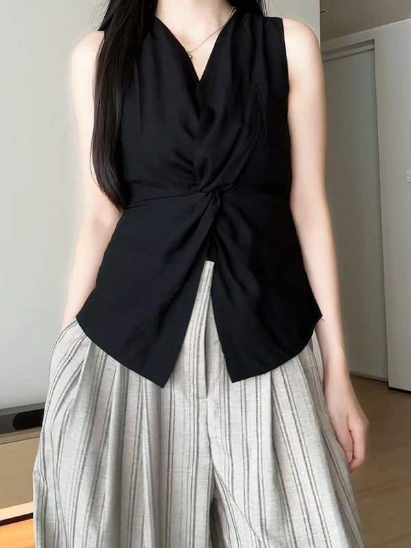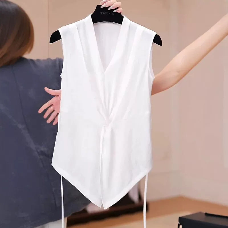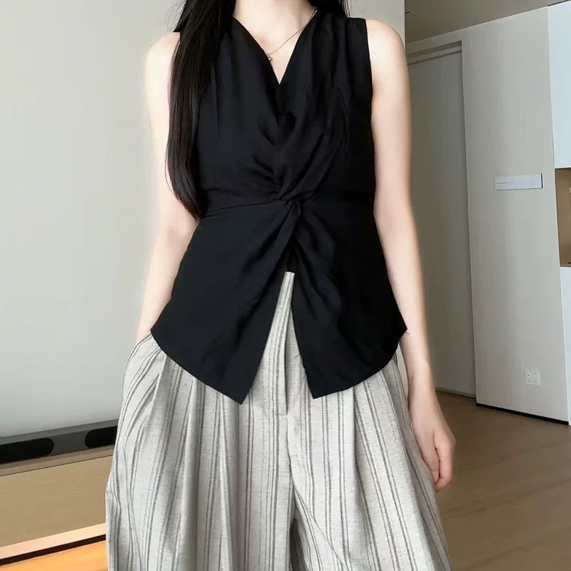 Qadınlar üçün böyük ölçülü qara V-yaxalı qolsuz köynək, 2026-cı ilin yayı üçün yeni model, dizayna uyğun bel hissəli, incəldən köynək.