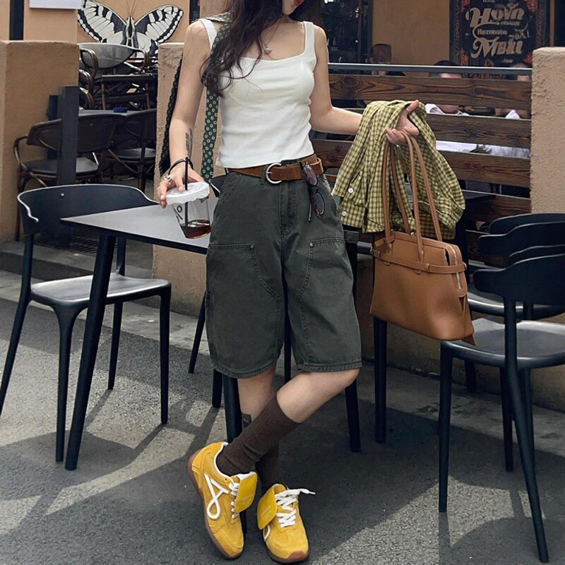 Qadınlar üçün böyük ölçülü retro Amerika yük denim şortları, yay üslubunda, yüksək belli, arıqladıcı, düz ayaqlı, geniş ayaqlı, gündəlik beşguşəli şalvar.