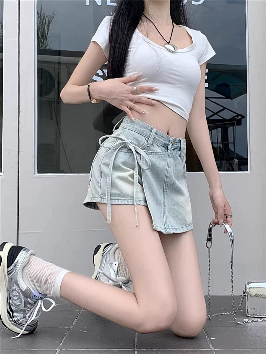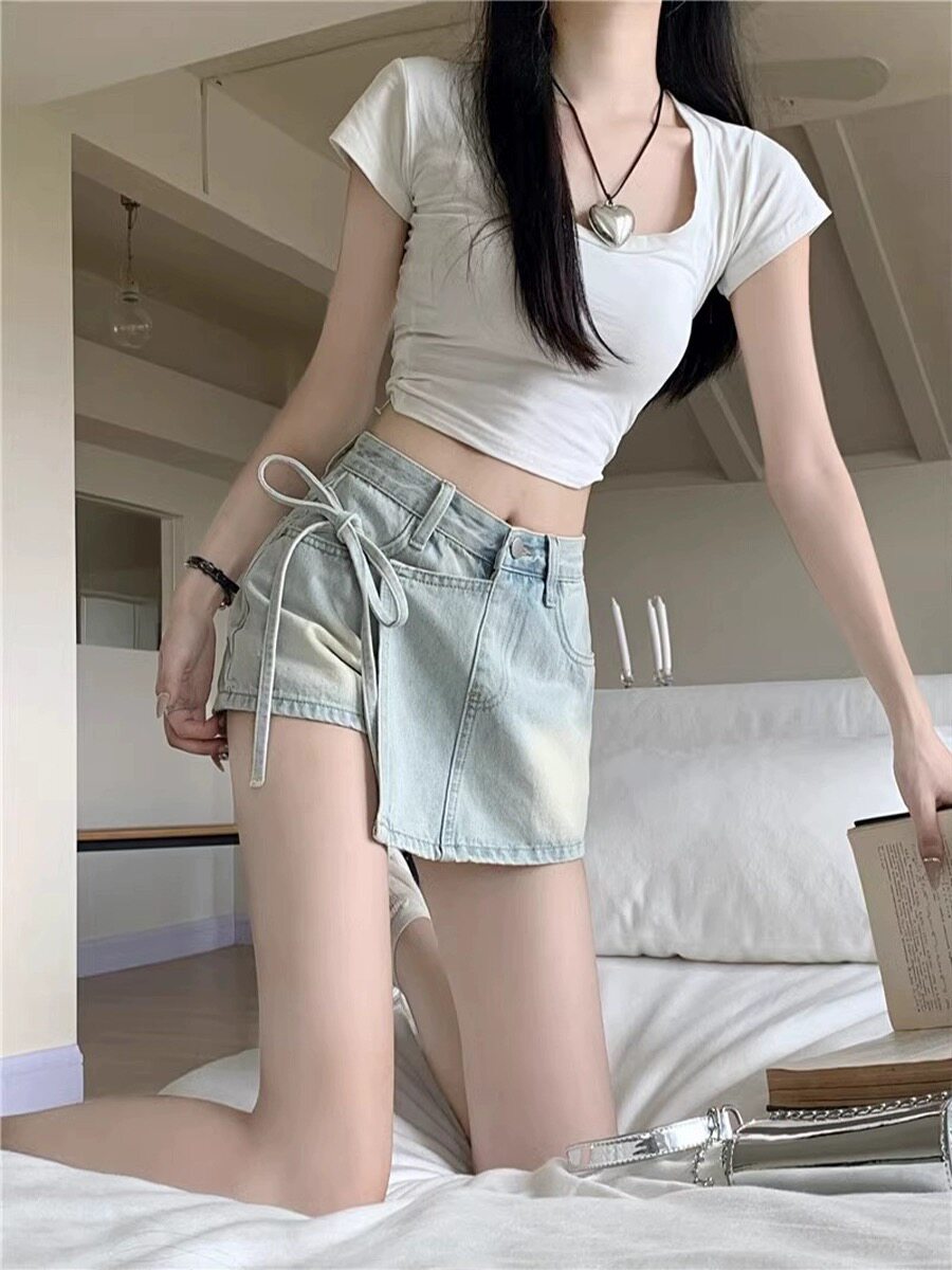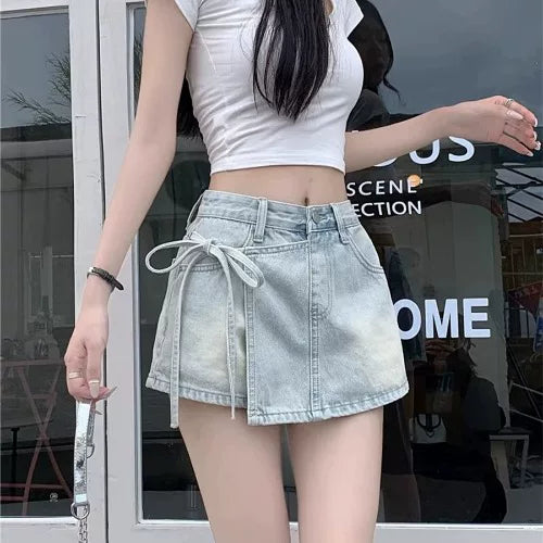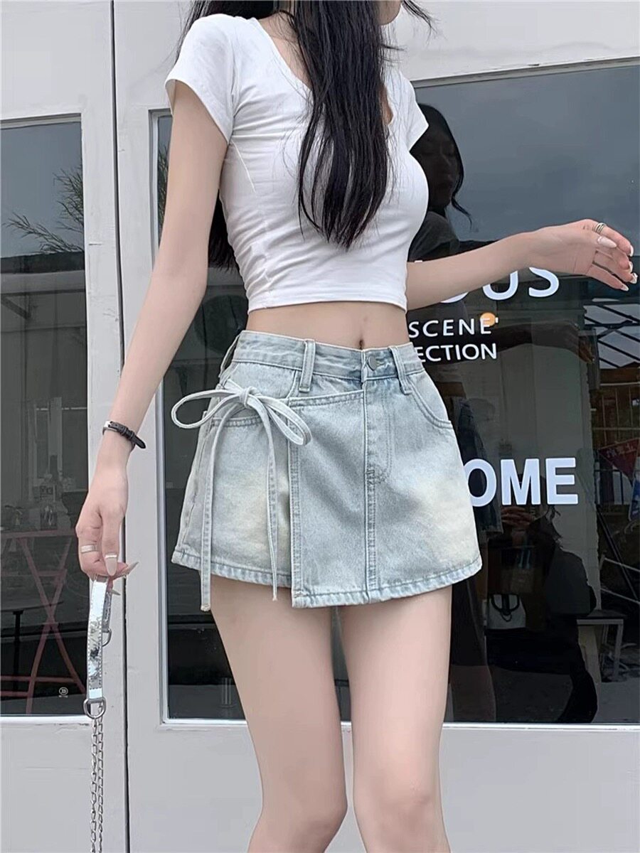 Qadınlar üçün böyük ölçülü retro denim midi ətək, yay üslubunda, yüksək belli, arıqladıcı, ombaya yapışan A-xəttli mini ətək/şalvar.