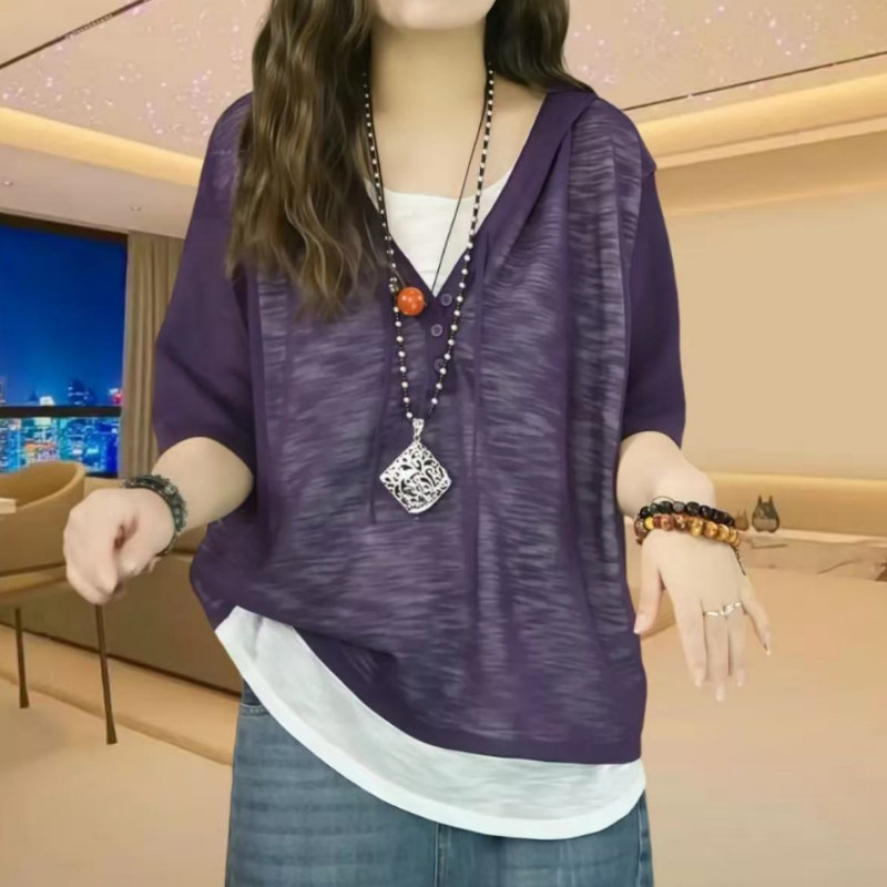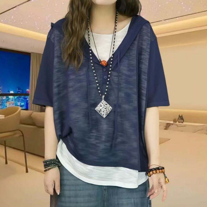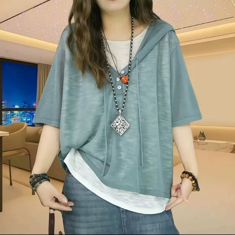 Qadınlar üçün Böyük Ölçülü Yay Süni İki Parçalı Dəbli Qısa Qollu Futbolka, Başlıqlı, Boş Formalı, Qarın nahiyəsini örtən və Arıqladıcı Top