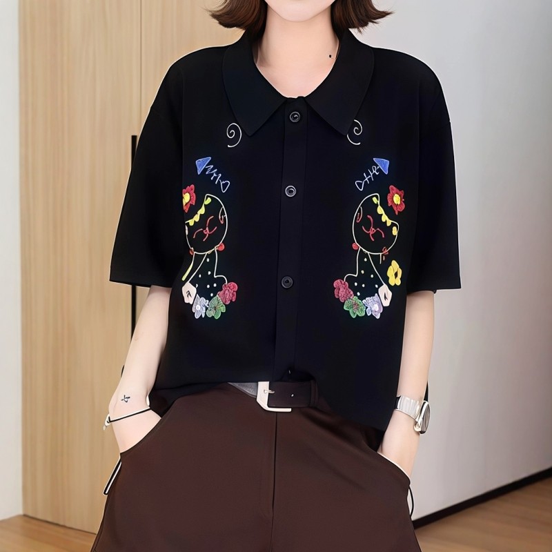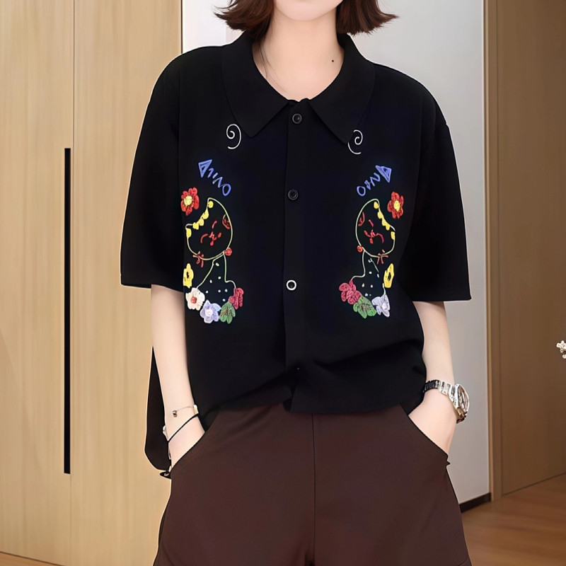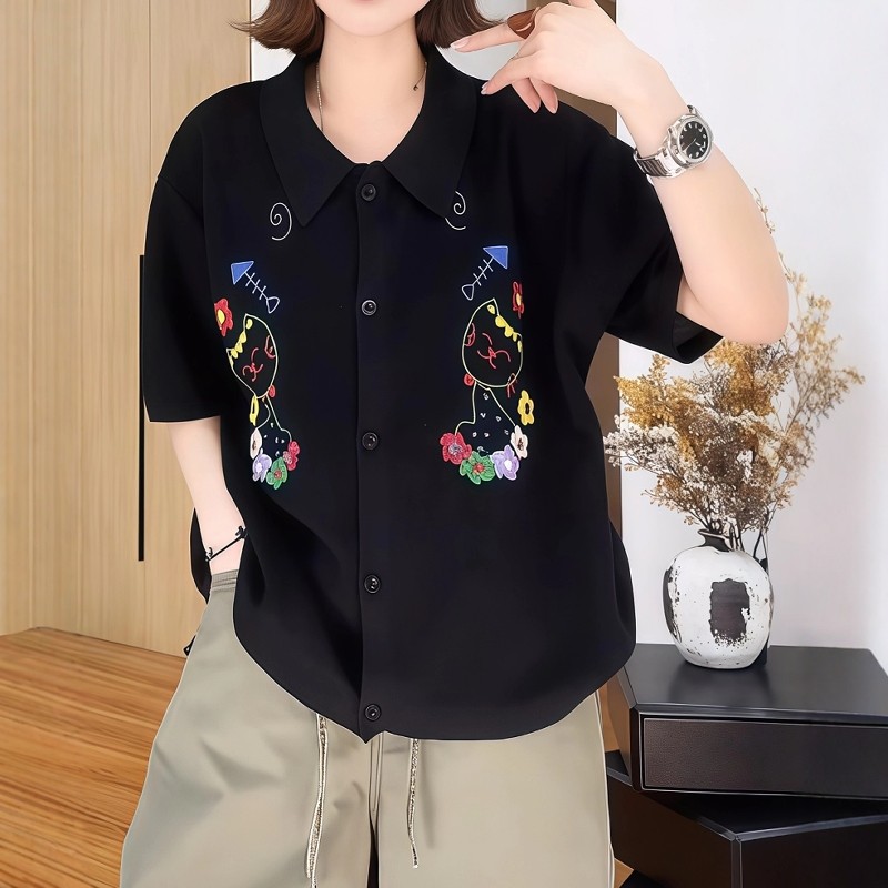 Qadınlar üçün cizgi filmi pişik naxışlı qısaqol futbolka, 2026-cı il yayı, böyük ölçüdə, şık, çoxfunksiyalı, geniş formalı, arıqladıcı köynək.