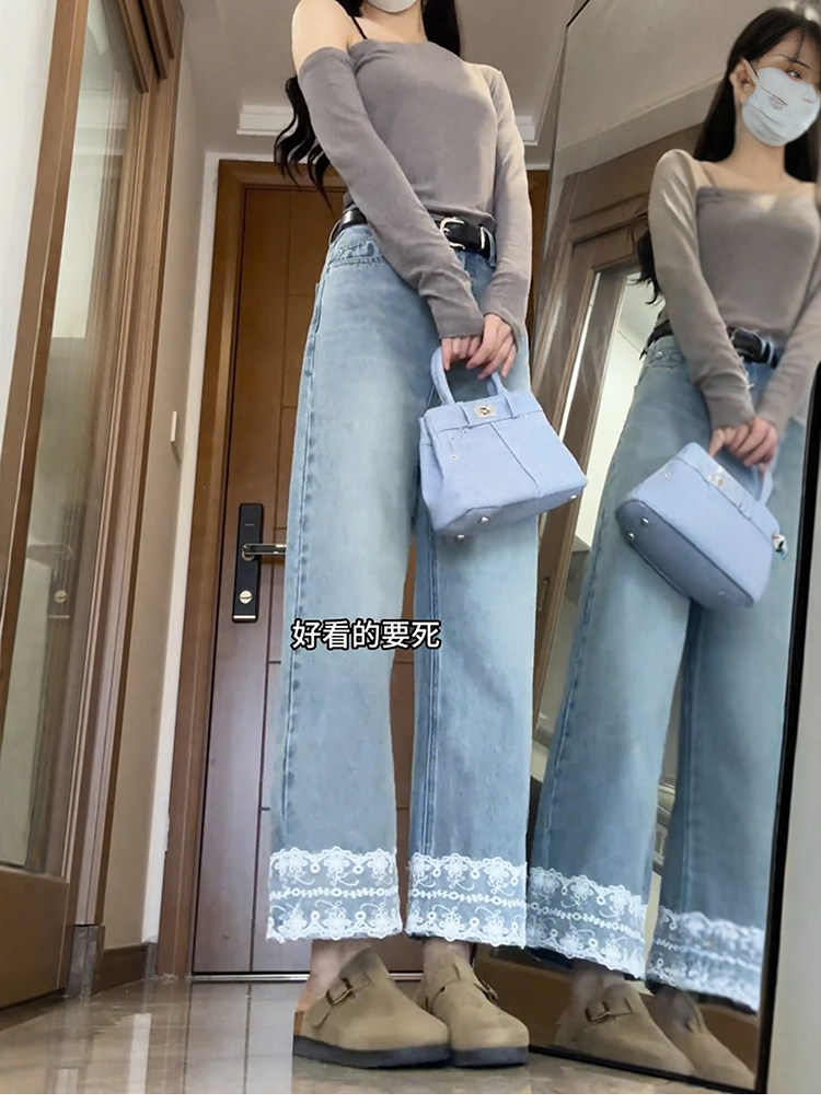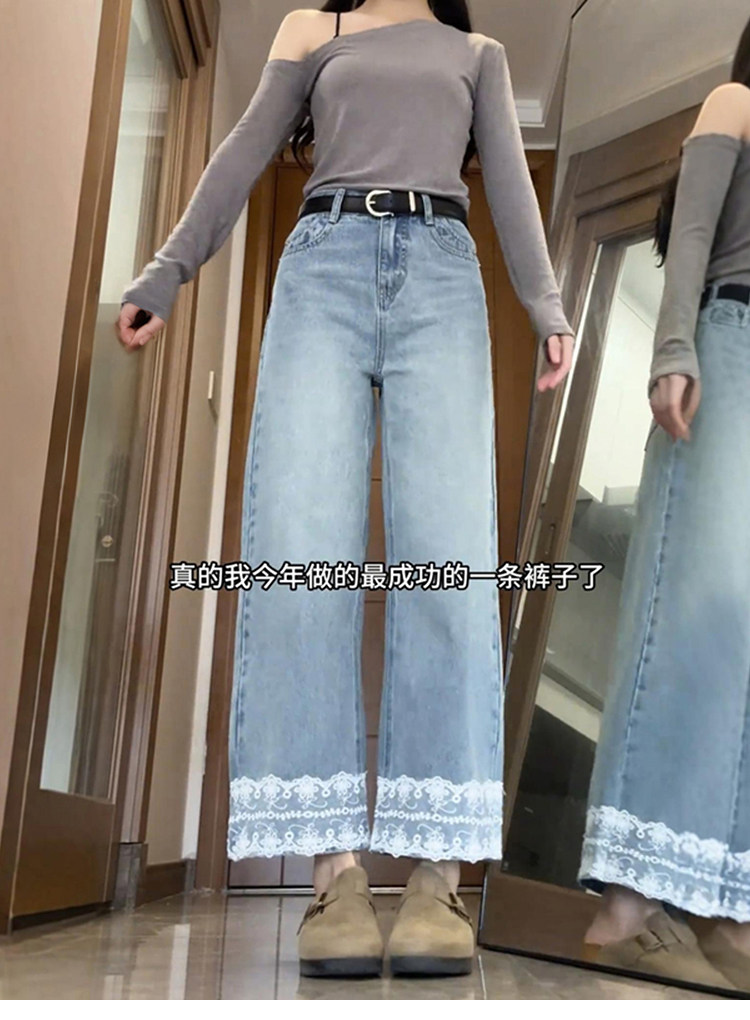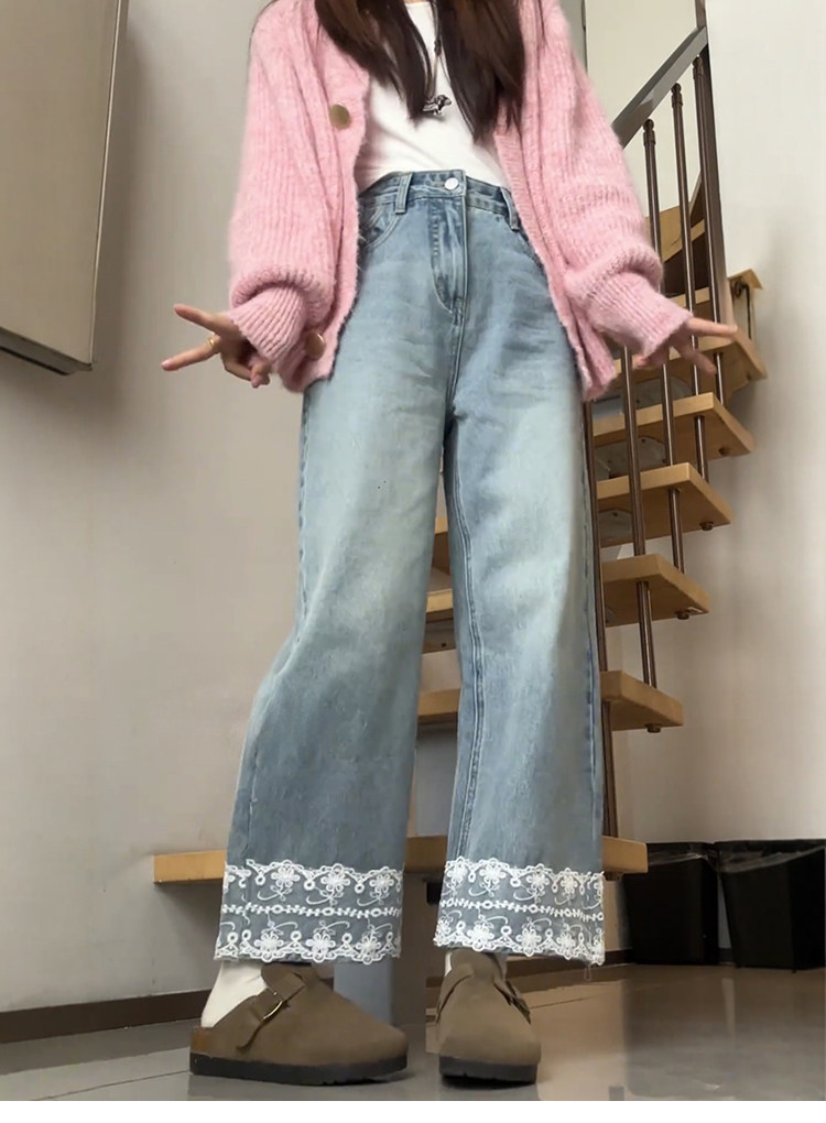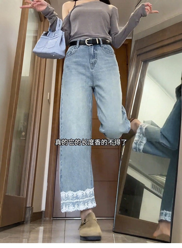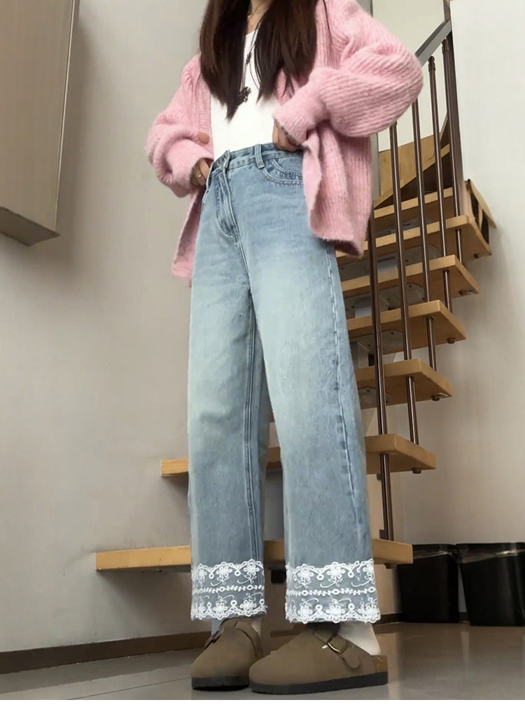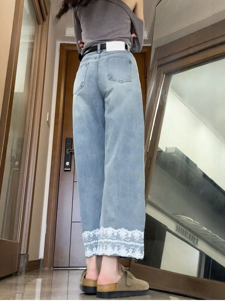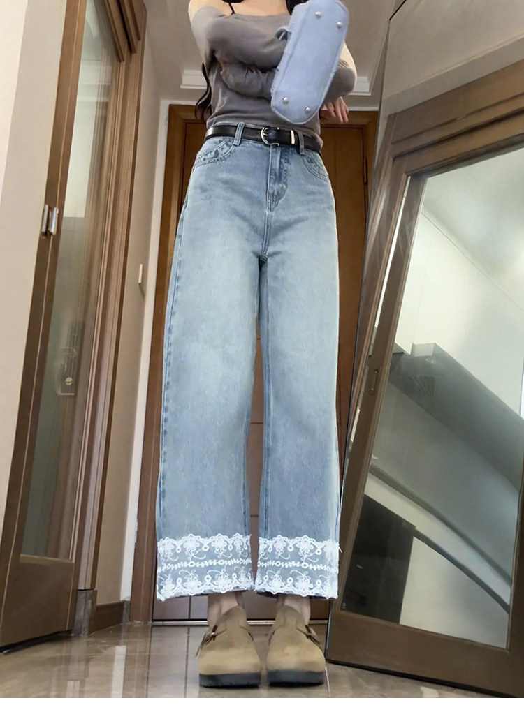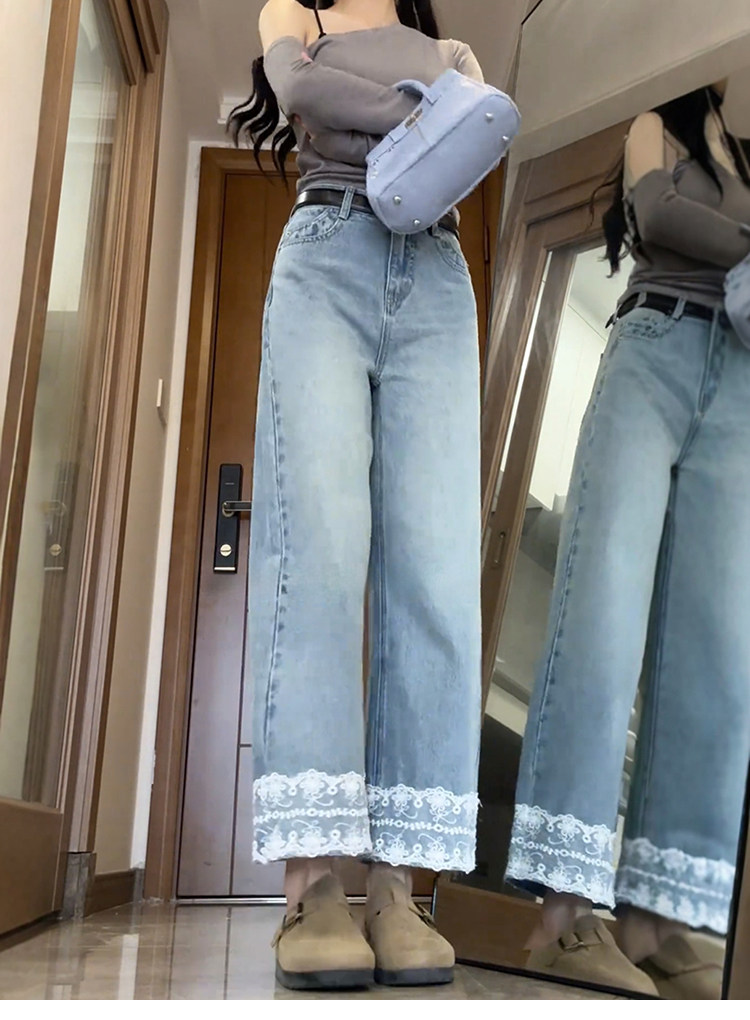 Qadınlar üçün krujeva ilə kəsilmiş düz ayaqlı cins şalvar, böyük ölçülü armud formalı bədən quruluşları üçün idealdır, yüksək belli, arıqladıcı, qısa enli ayaqlı stil.