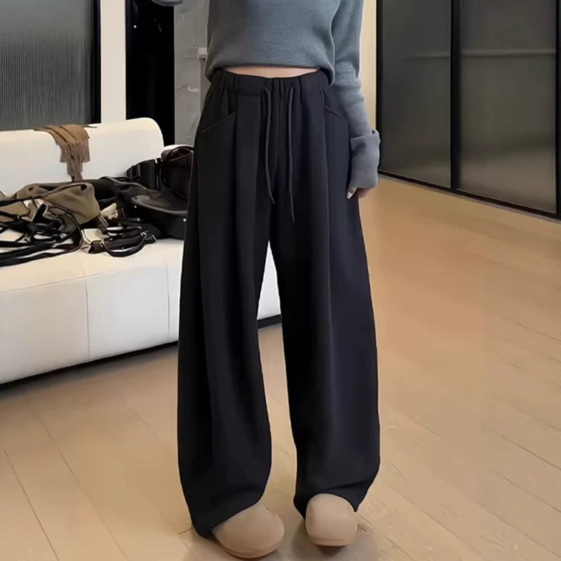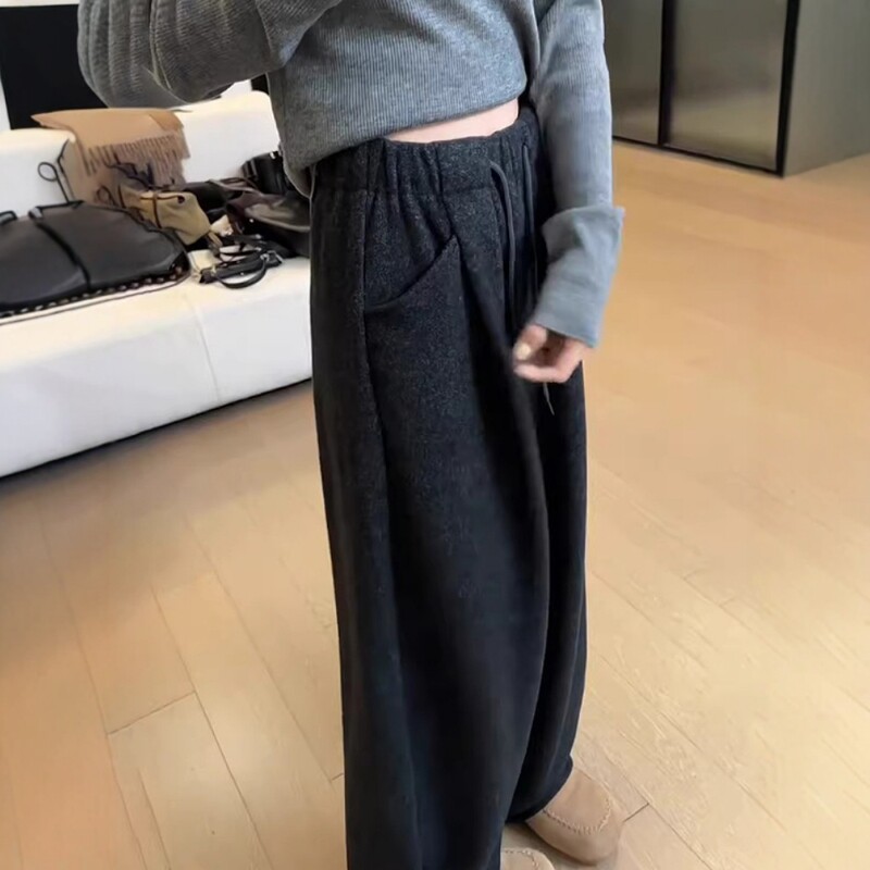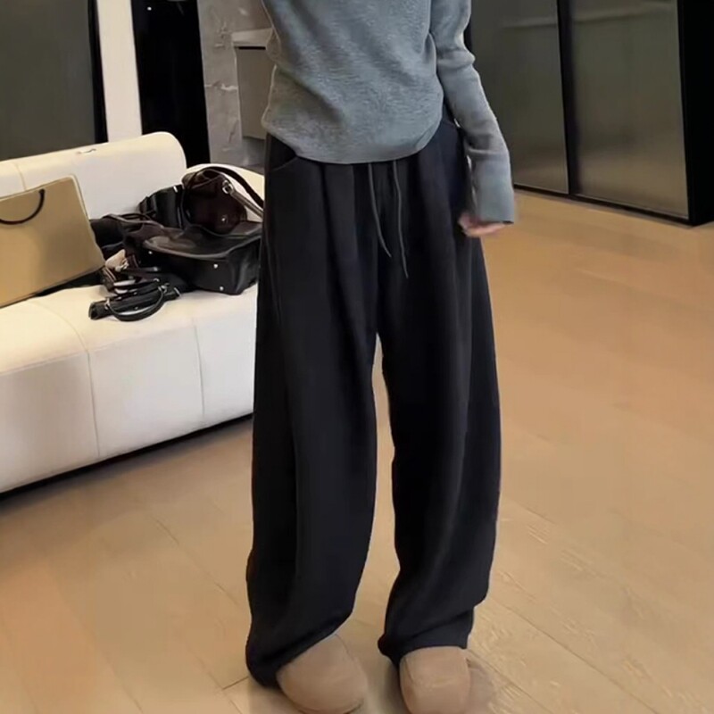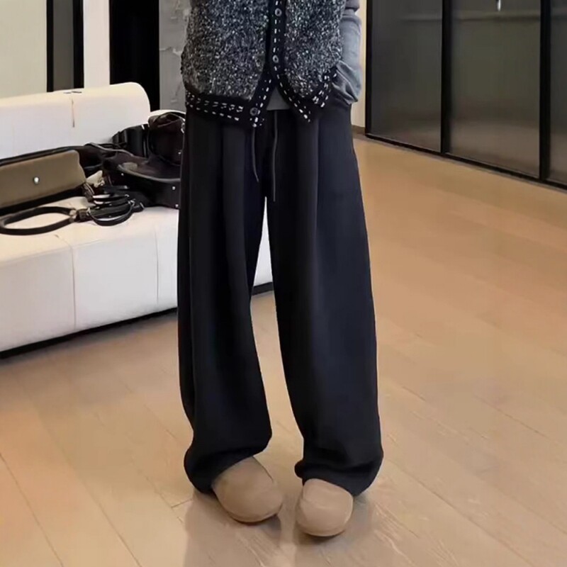 Qadınlar üçün qara əyri bıçaqlı gündəlik şalvar, 2026 Yeni Payız və Qış Plus Ölçülü Boş Formalı Boyfriend Stilində Axıcı Geniş Ayaqlı Şalvar