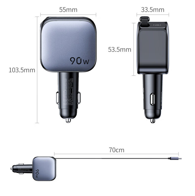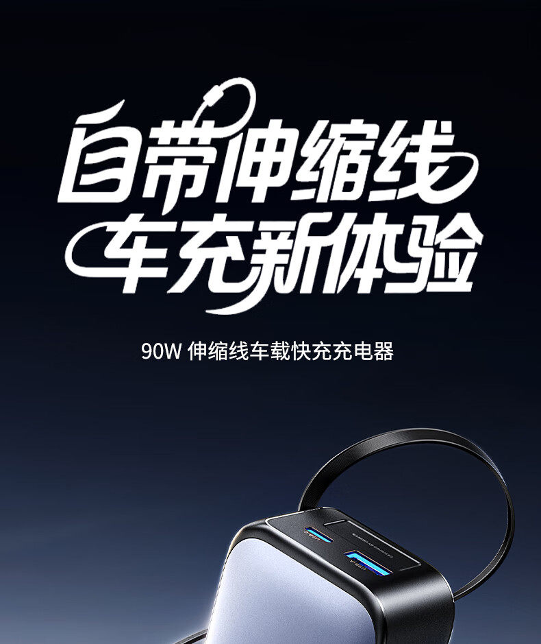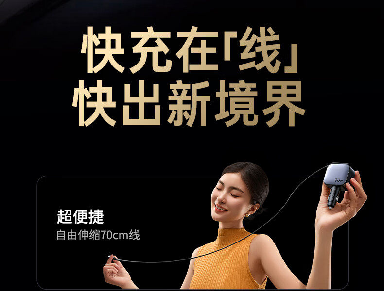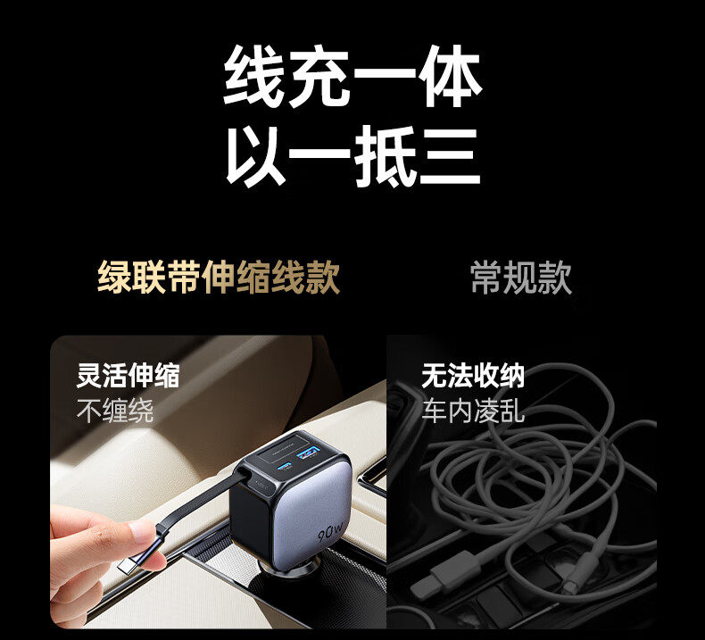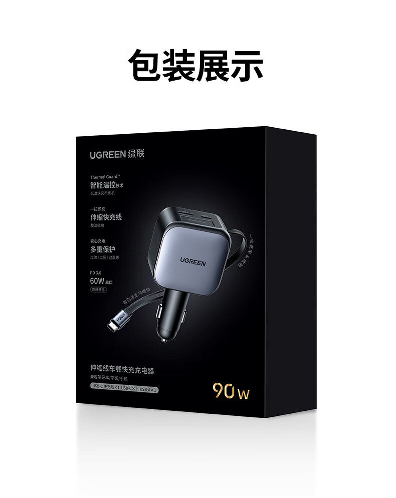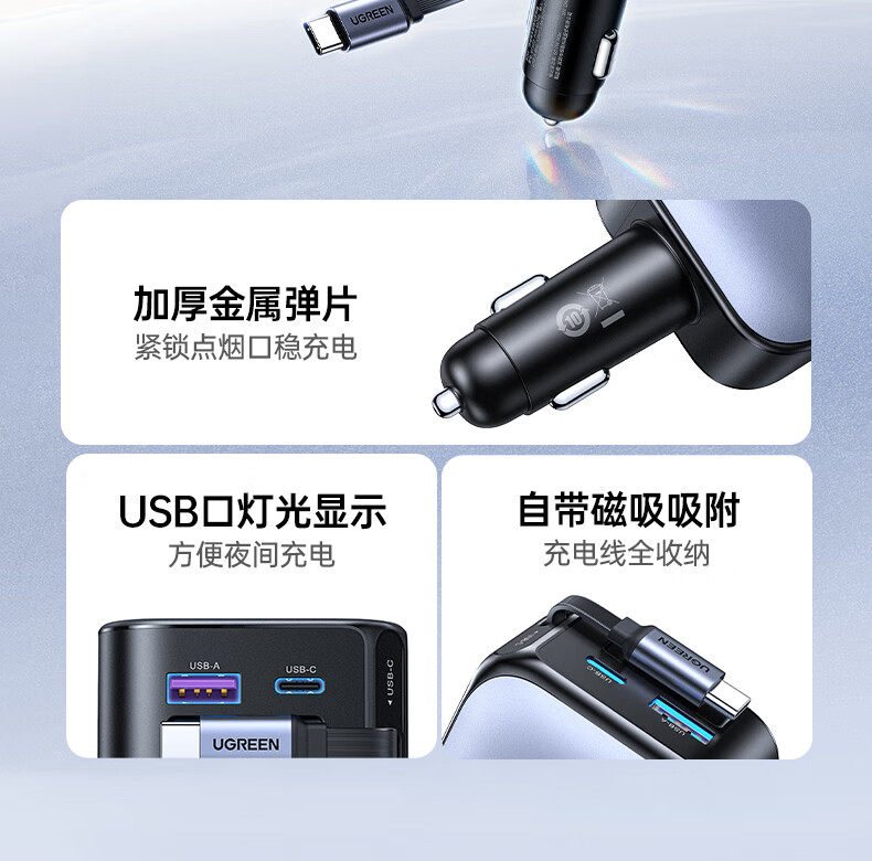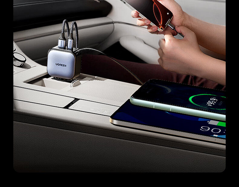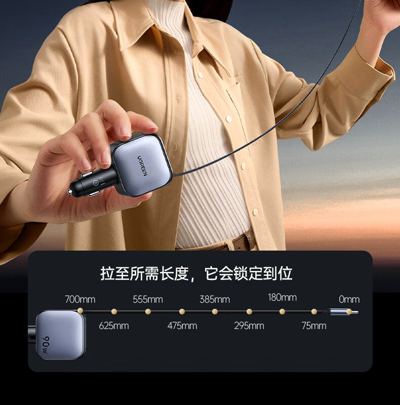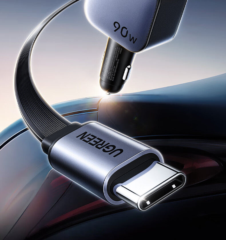 UGREEN 90W Super Sürətli Avtomobil Şarj Cihazı, Çəkilə Bilən Kabel ilə, Apple və Huawei Telefonları ilə Uyğundur