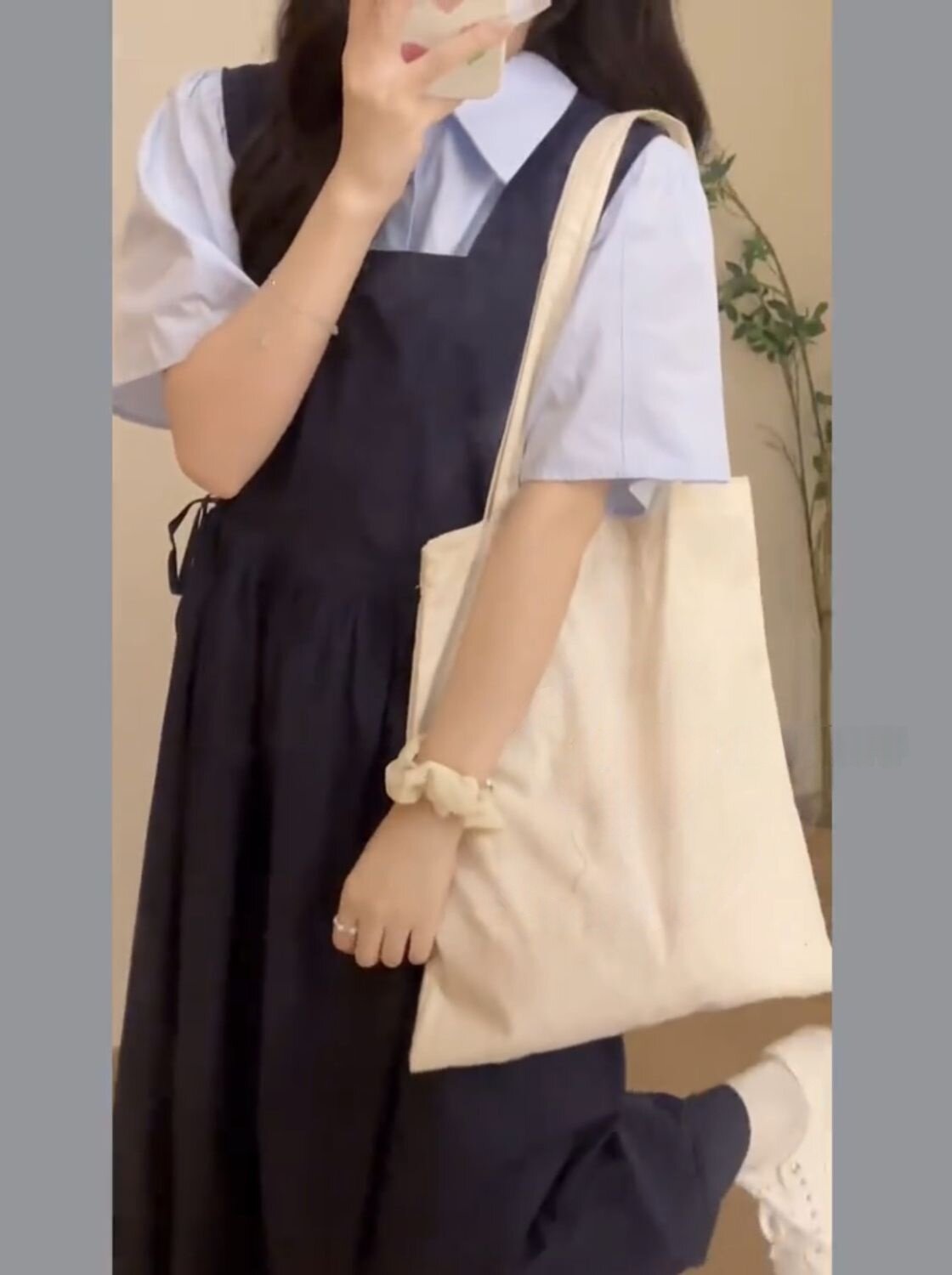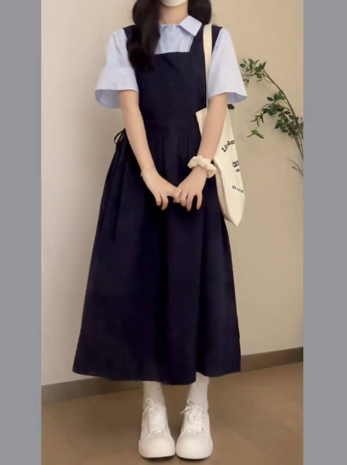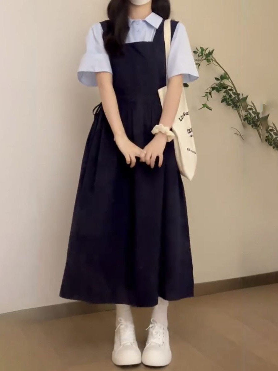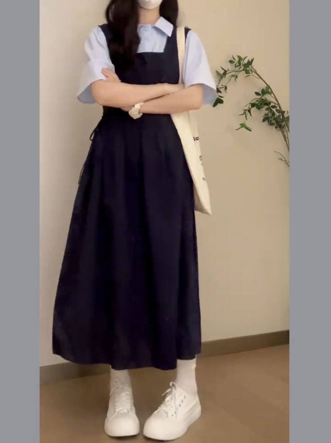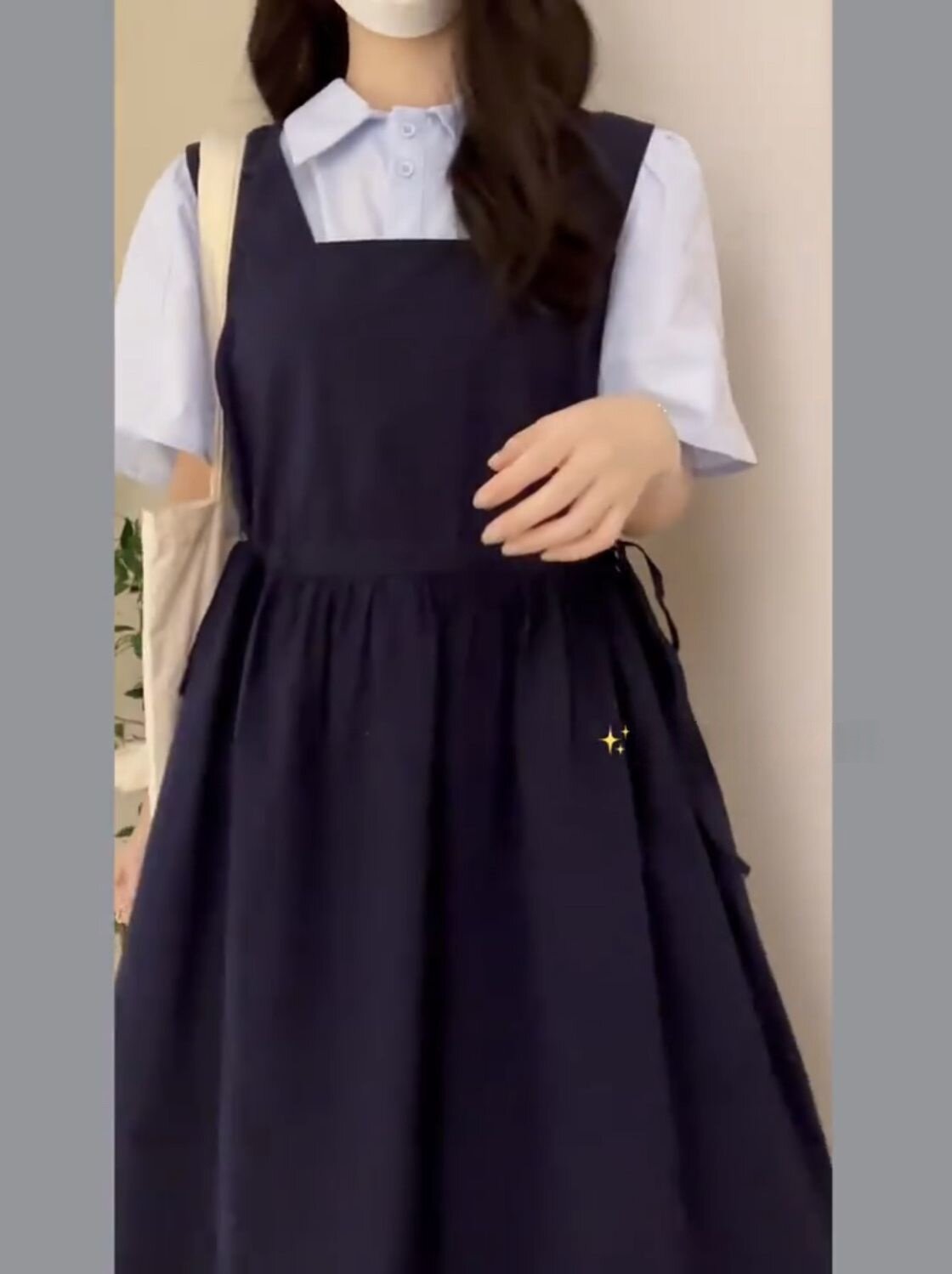 Yay hazırlığı üslubunda, geniş bədən quruluşlu, arıqladıcı kvadrat yaxalı, tünd göy rəngli asma don, qız tələbələr üçün uyğundur, mavi rəngli çoxfunksiyalı köynəklə üst-üstə düşmüşdür.