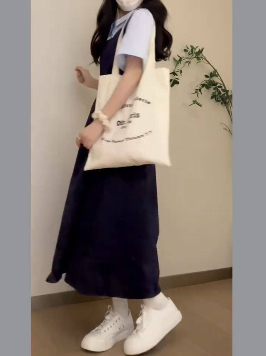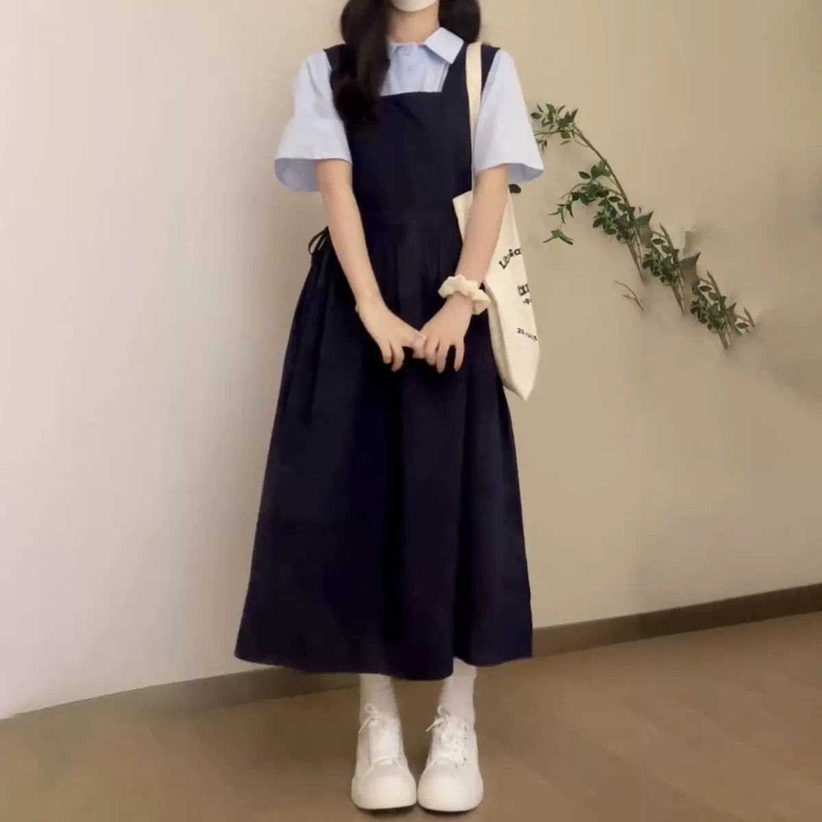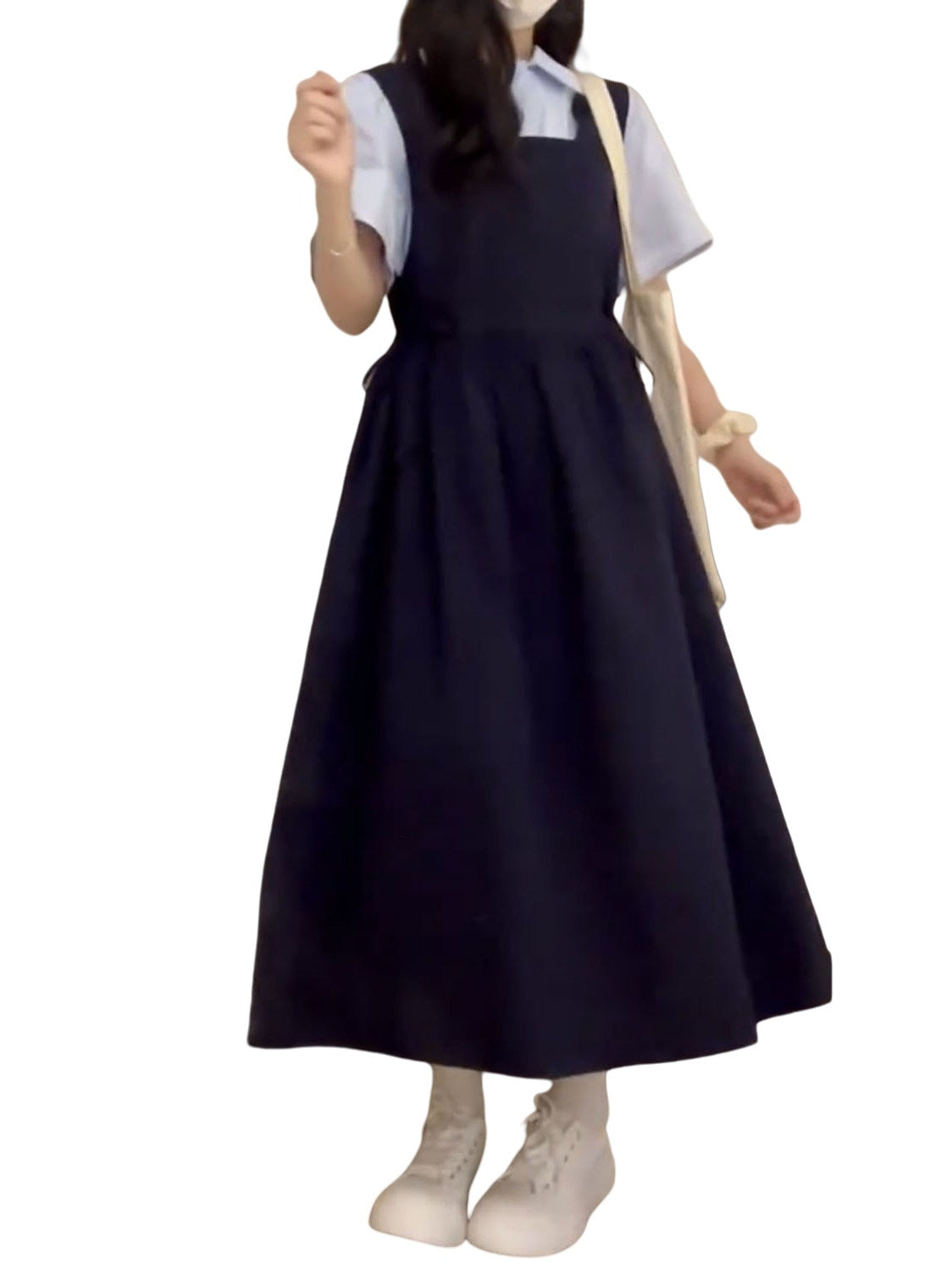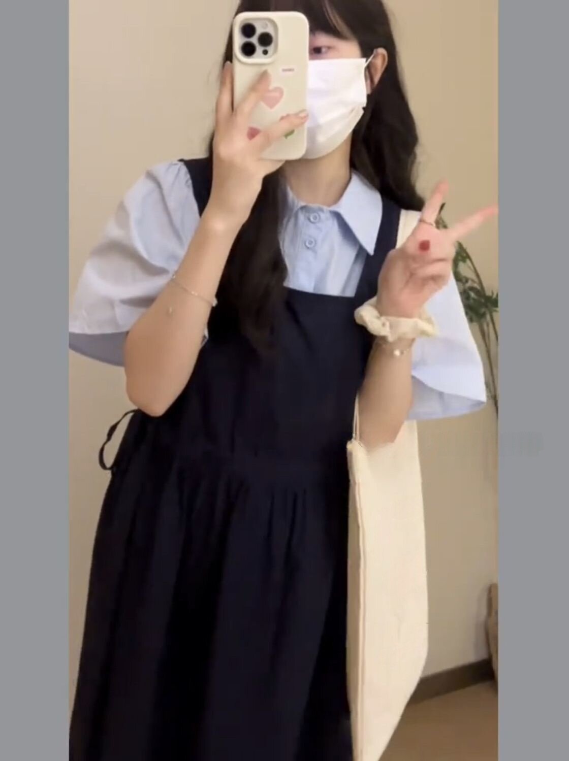 Yay hazırlığı üslubunda, geniş bədən quruluşlu, arıqladıcı kvadrat yaxalı, tünd göy rəngli asma don, qız tələbələr üçün uyğundur, mavi rəngli çoxfunksiyalı köynəklə üst-üstə düşmüşdür.