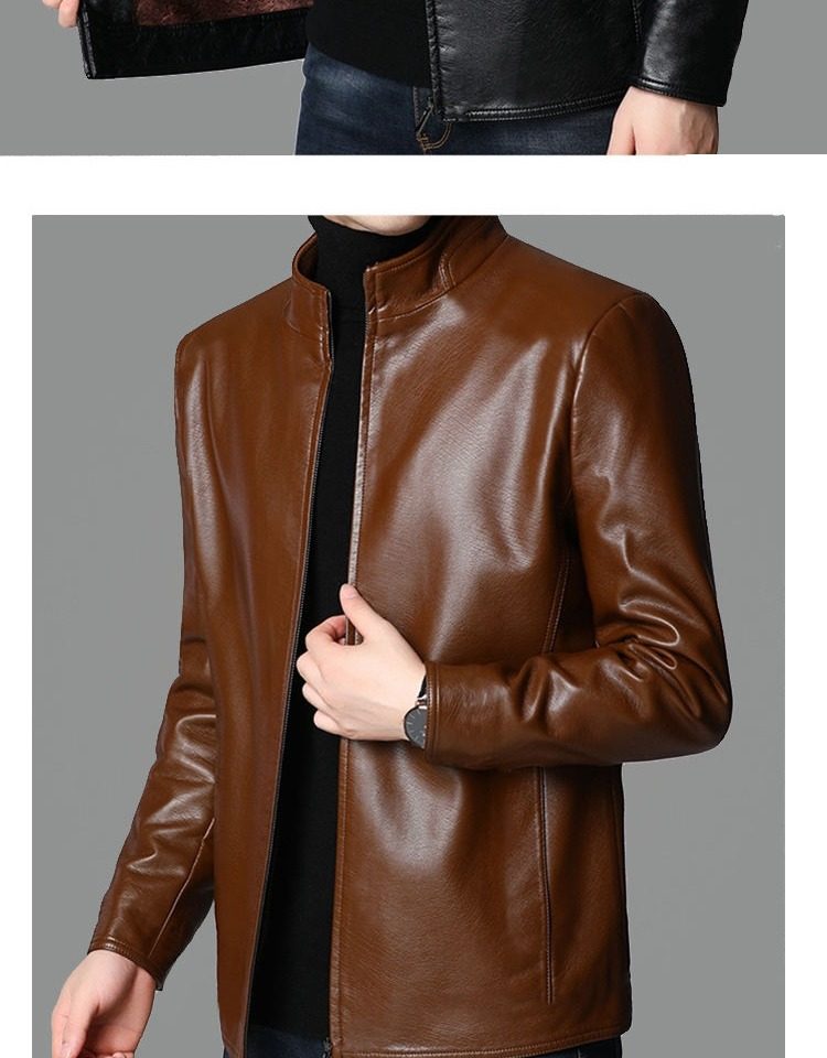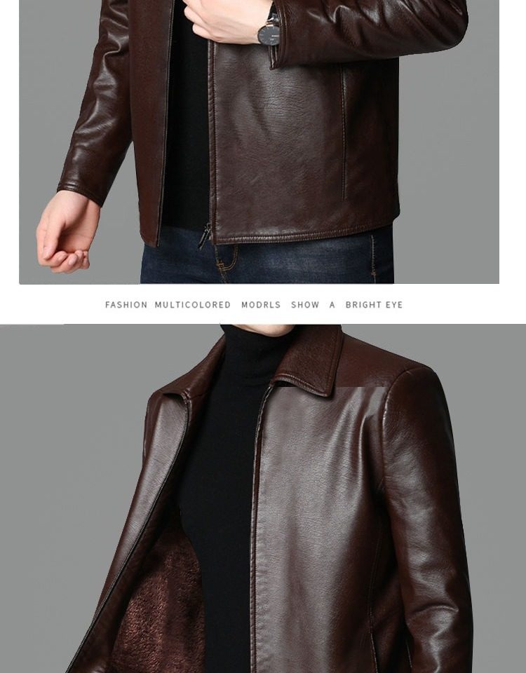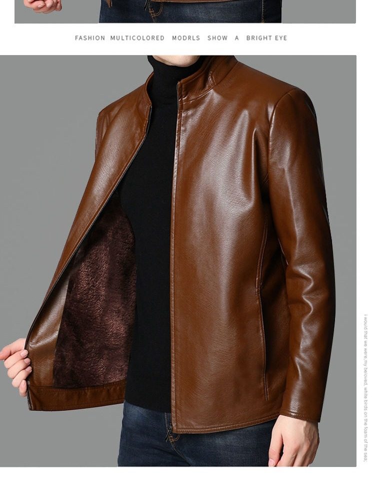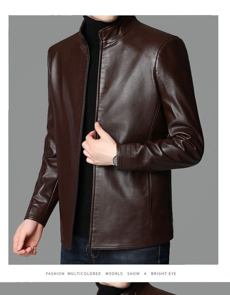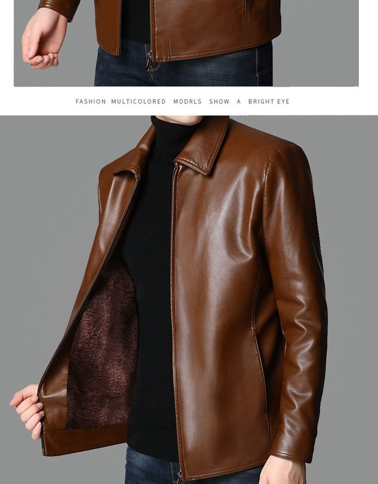 Qəhvəyi dəri gödəkçə, yaxalıqla (qalın flis astar + sərbəst xəz yaxalıq) / 175 sm/88 sm üçün tövsiyə olunan çəki A: 120-135 kq