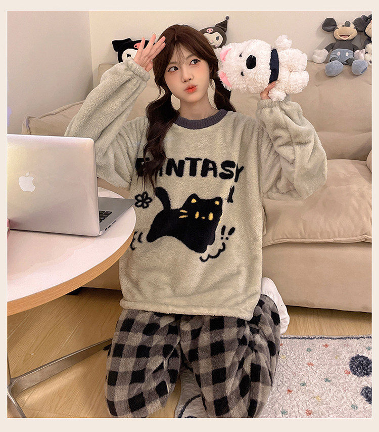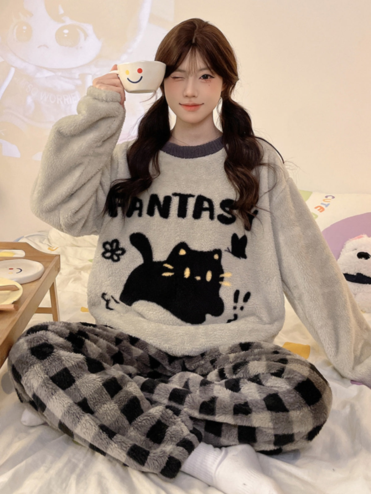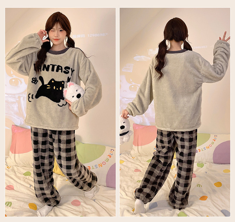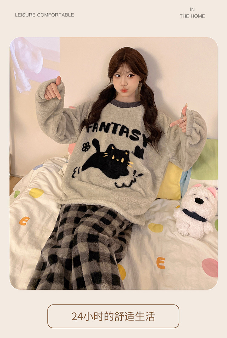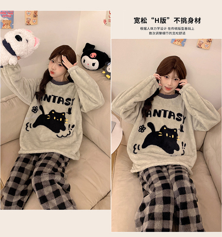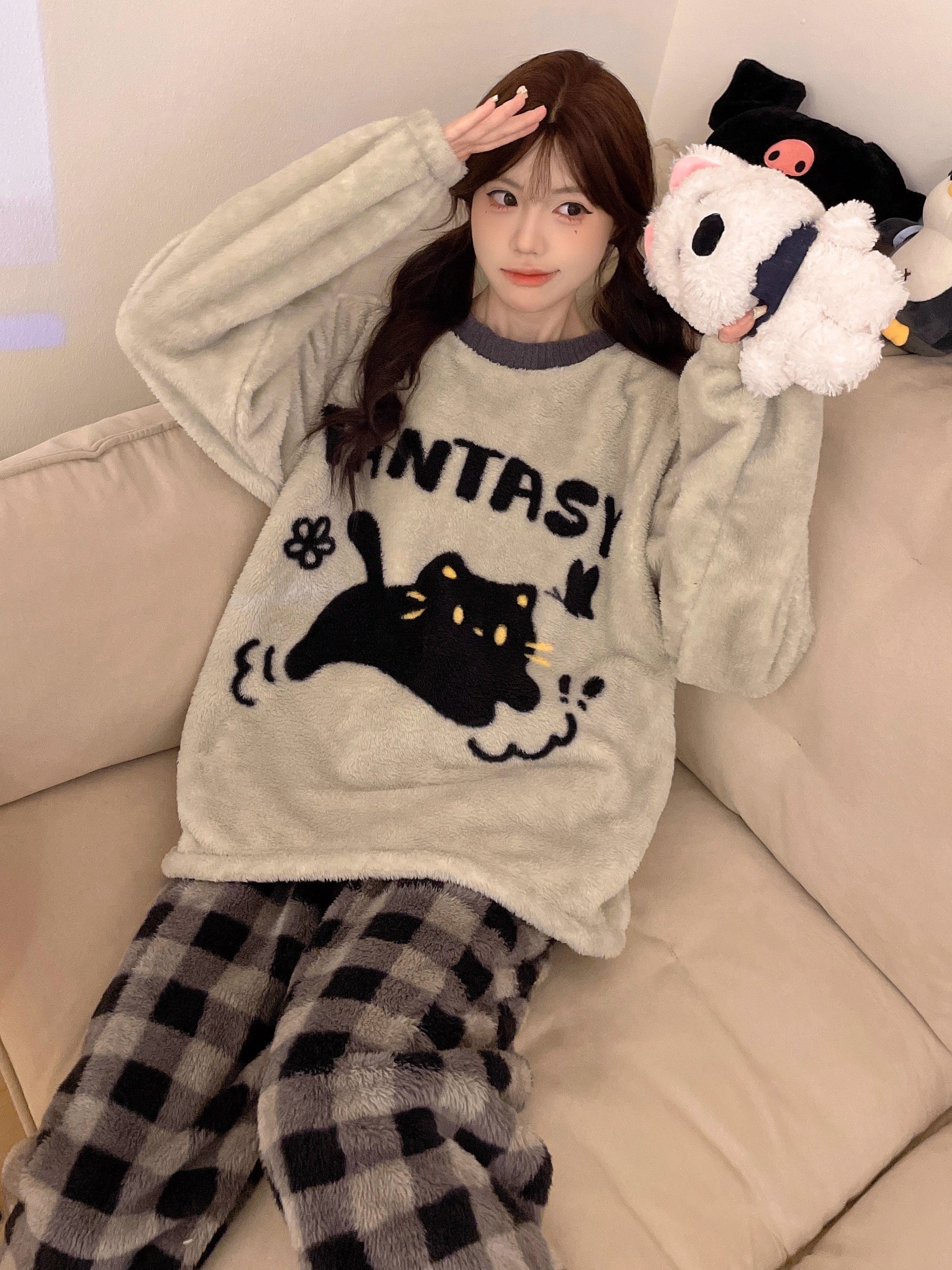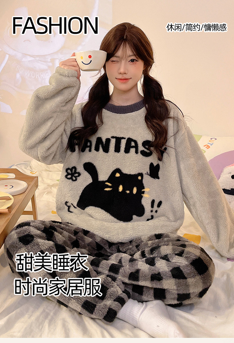 Cizgi filmi boz və qara pişik qış yeni mərcan yunlu pijama qadın yun astarlı və qalınlaşmış tələbə flanel ev geyimi xarici geyimlər