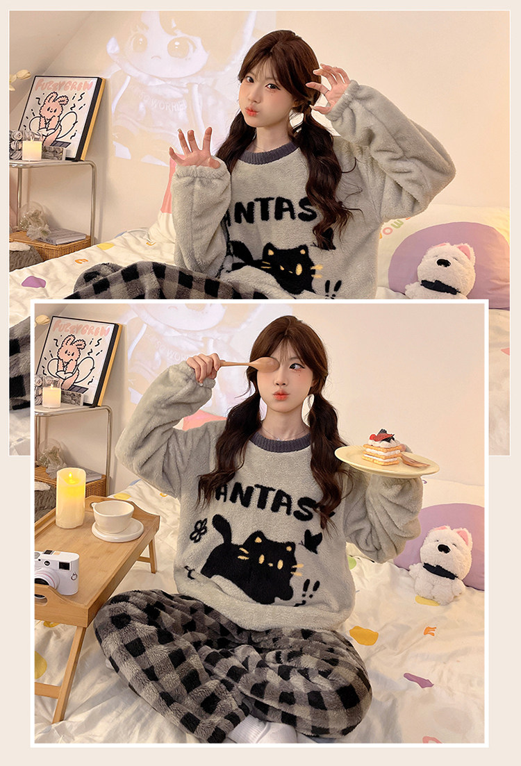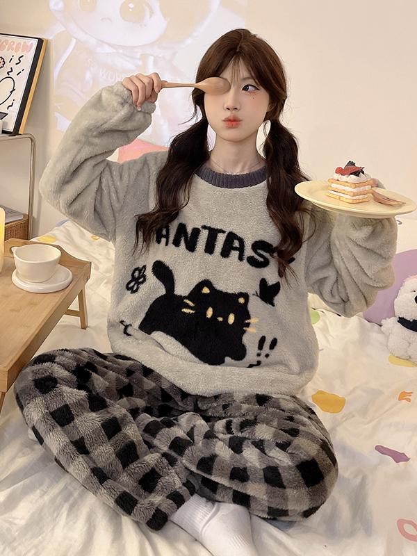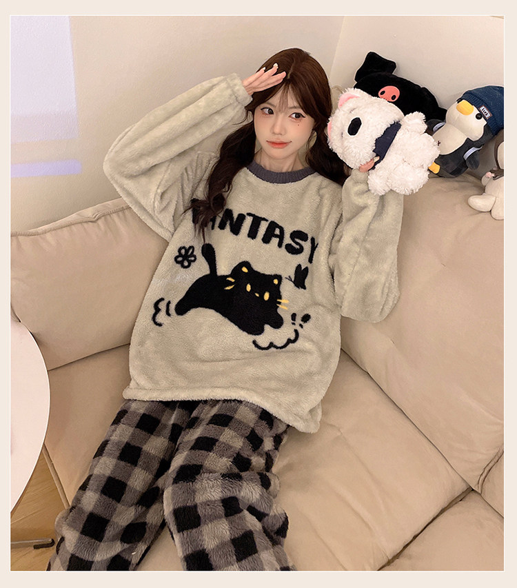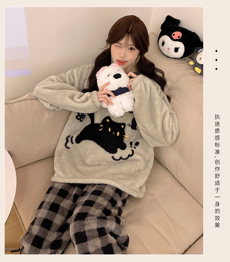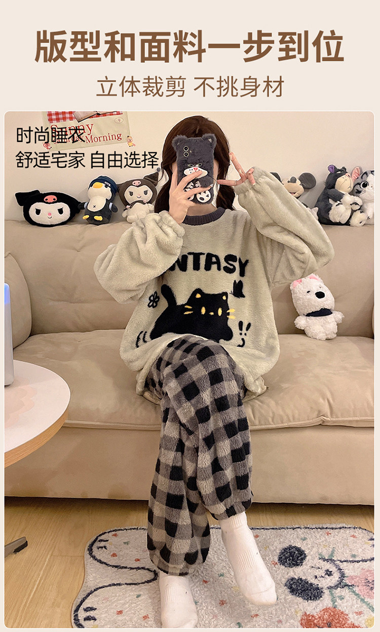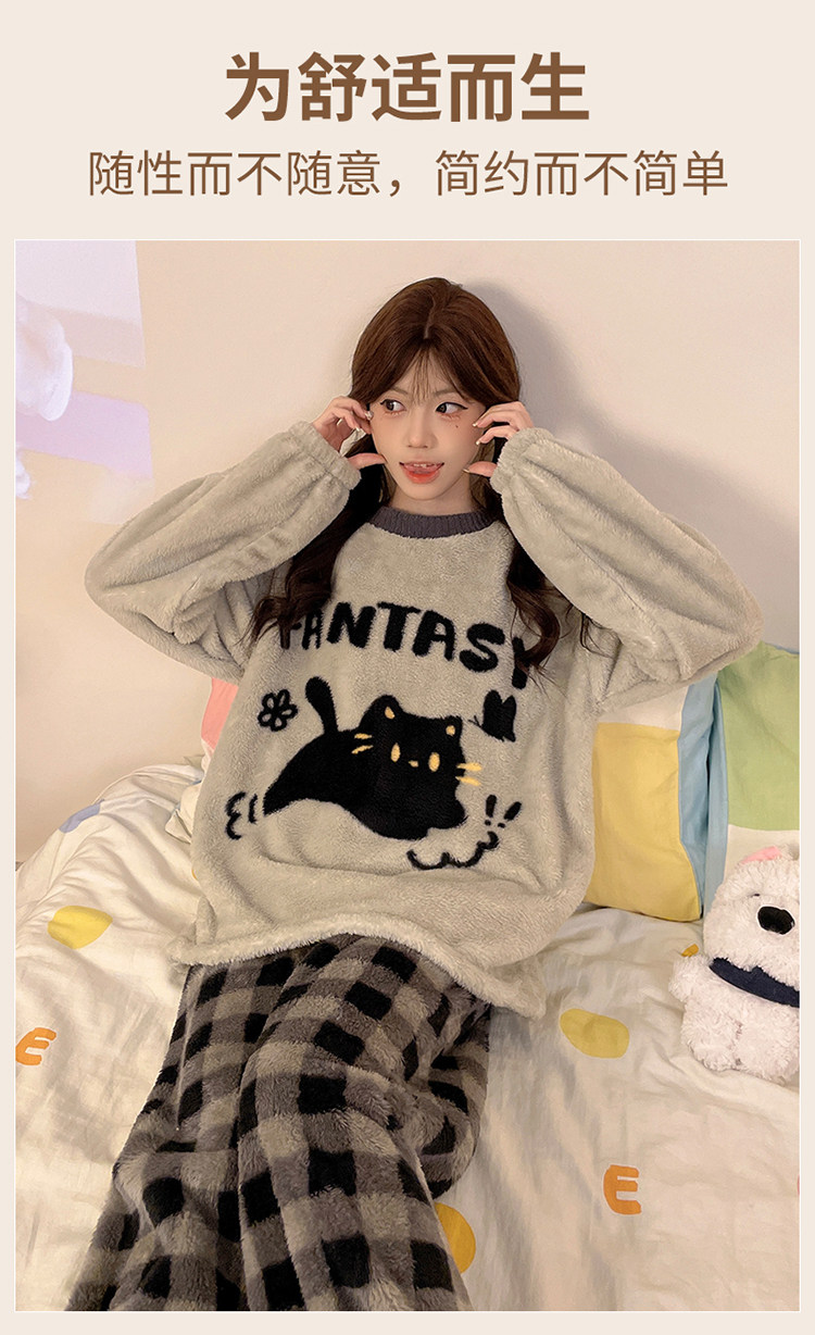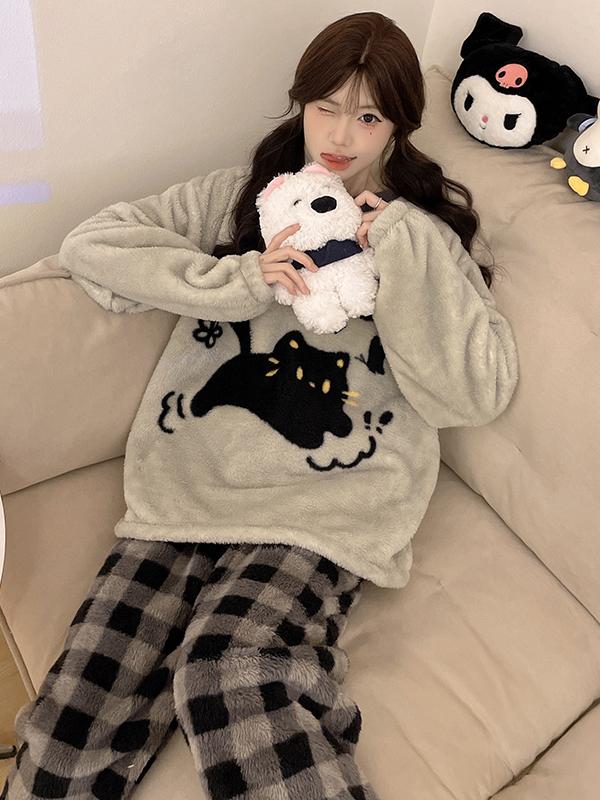 Cizgi filmi boz və qara pişik qış yeni mərcan yunlu pijama qadın yun astarlı və qalınlaşmış tələbə flanel ev geyimi xarici geyimlər