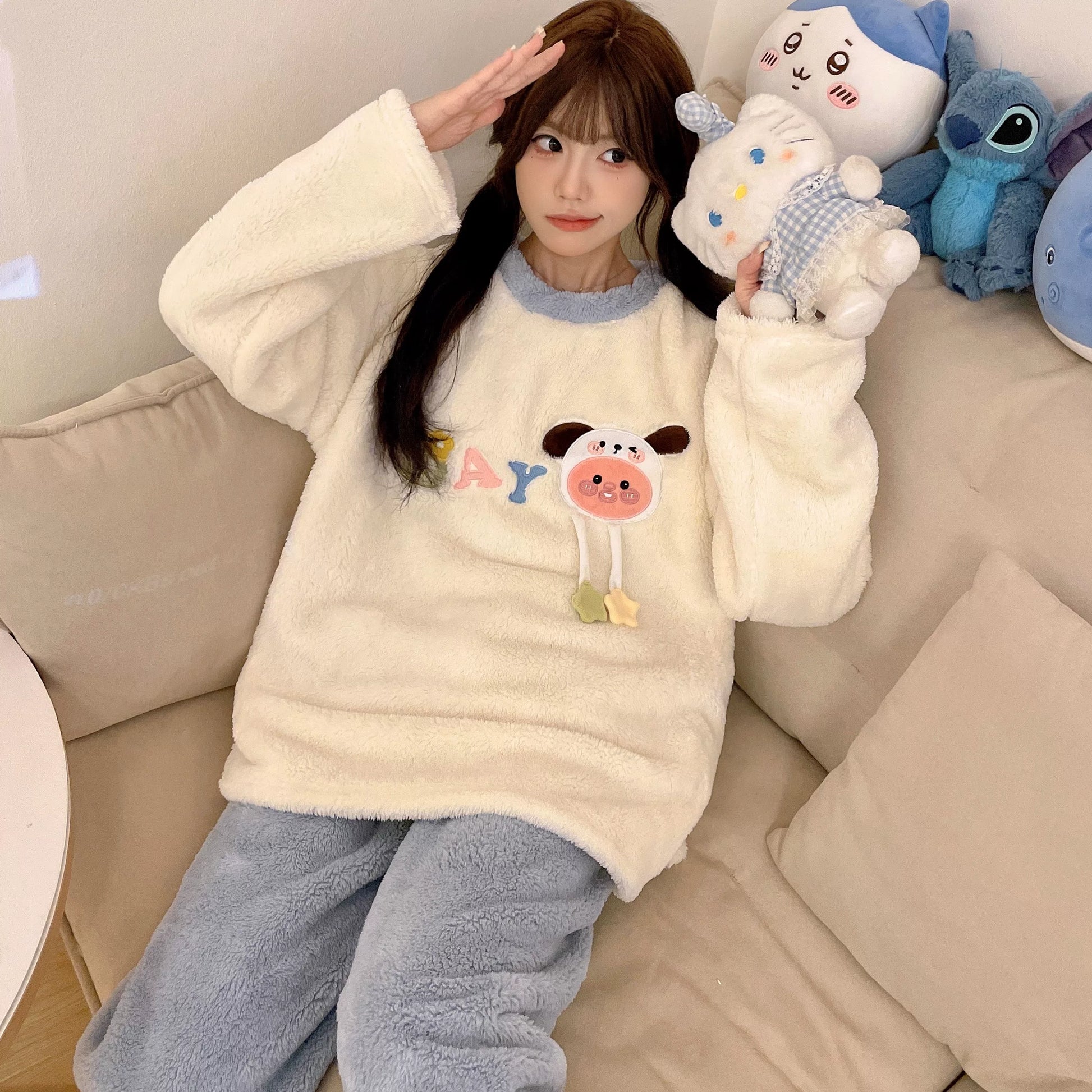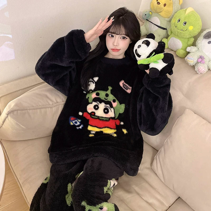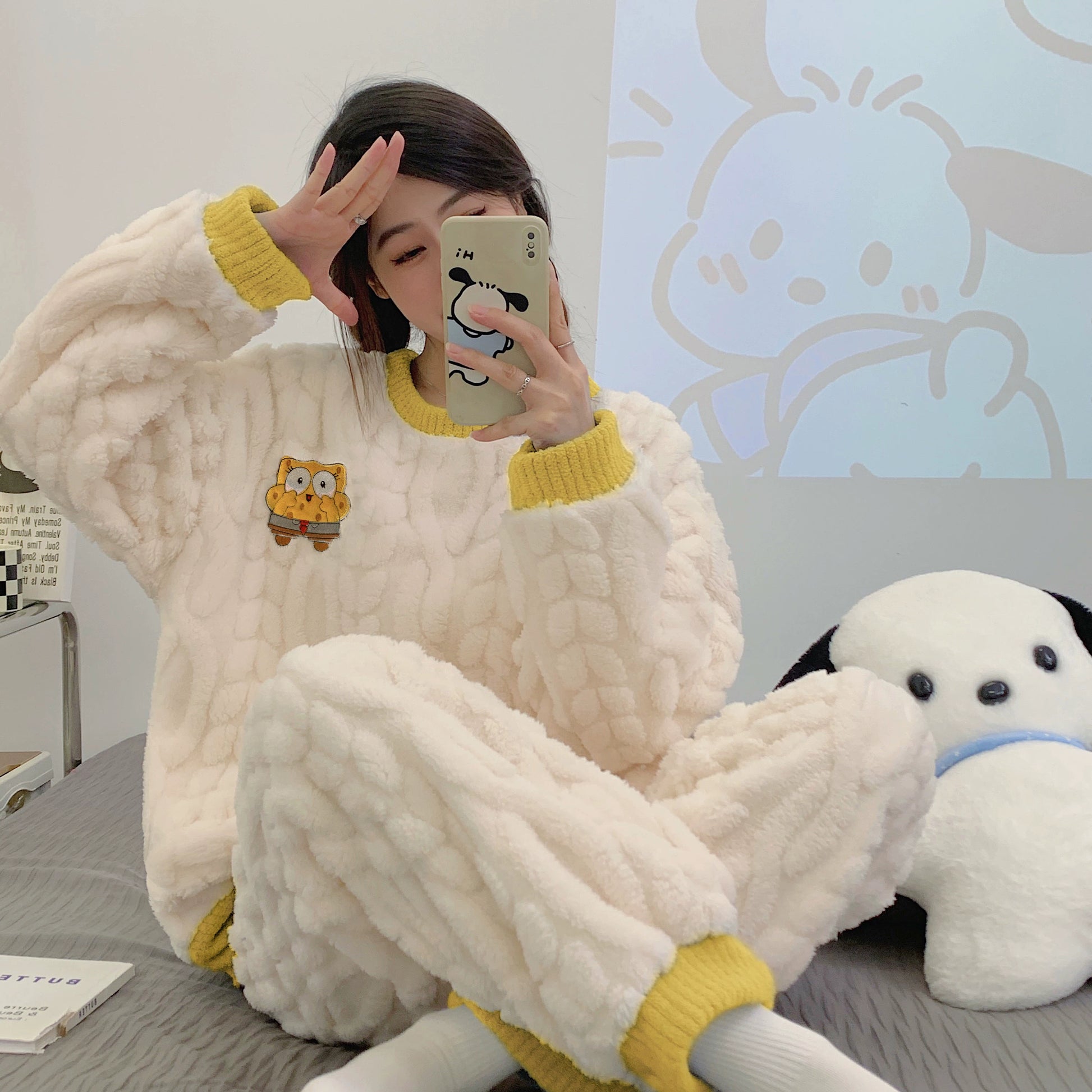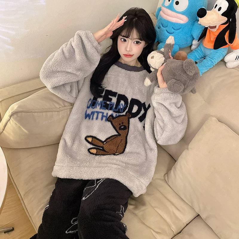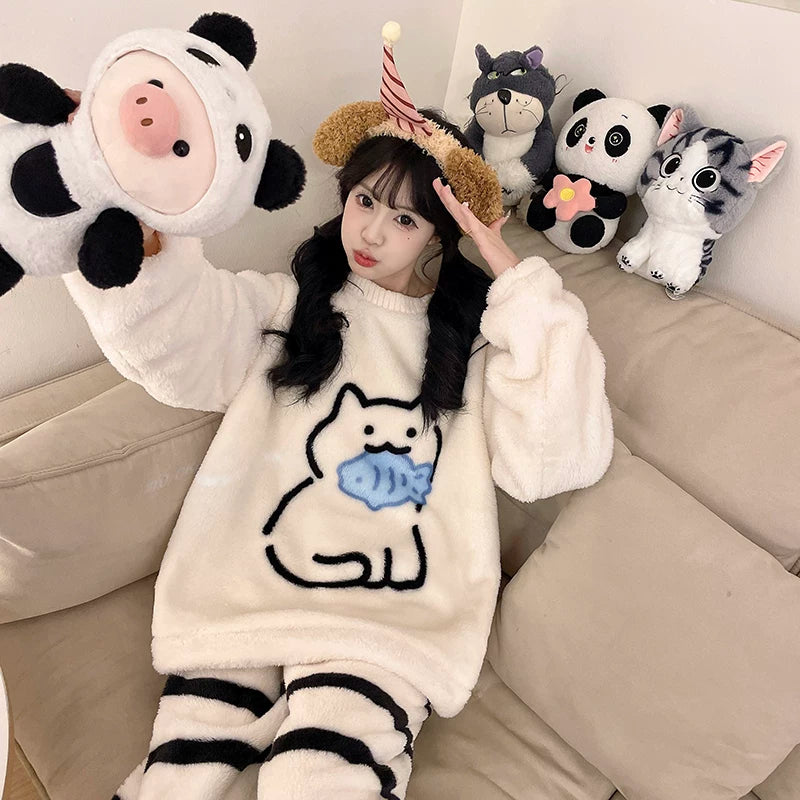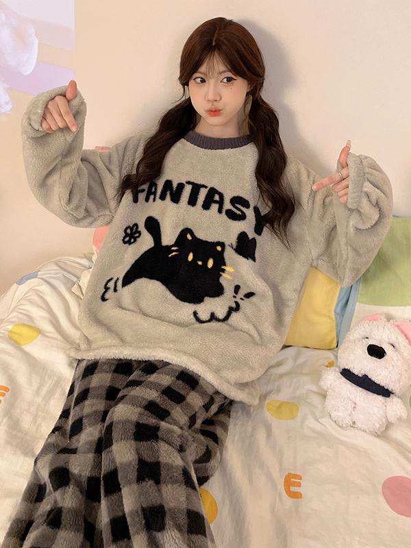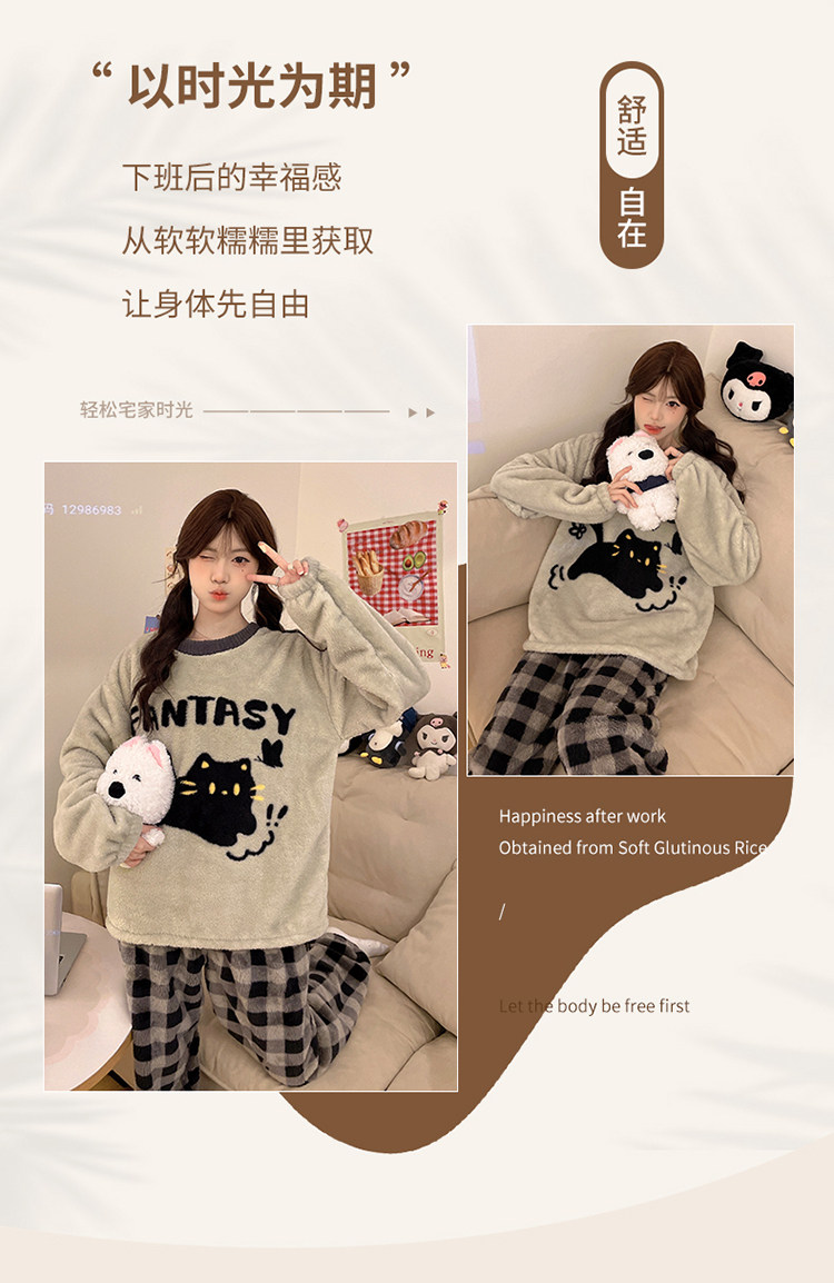 Cizgi filmi boz və qara pişik qış yeni mərcan yunlu pijama qadın yun astarlı və qalınlaşmış tələbə flanel ev geyimi xarici geyimlər